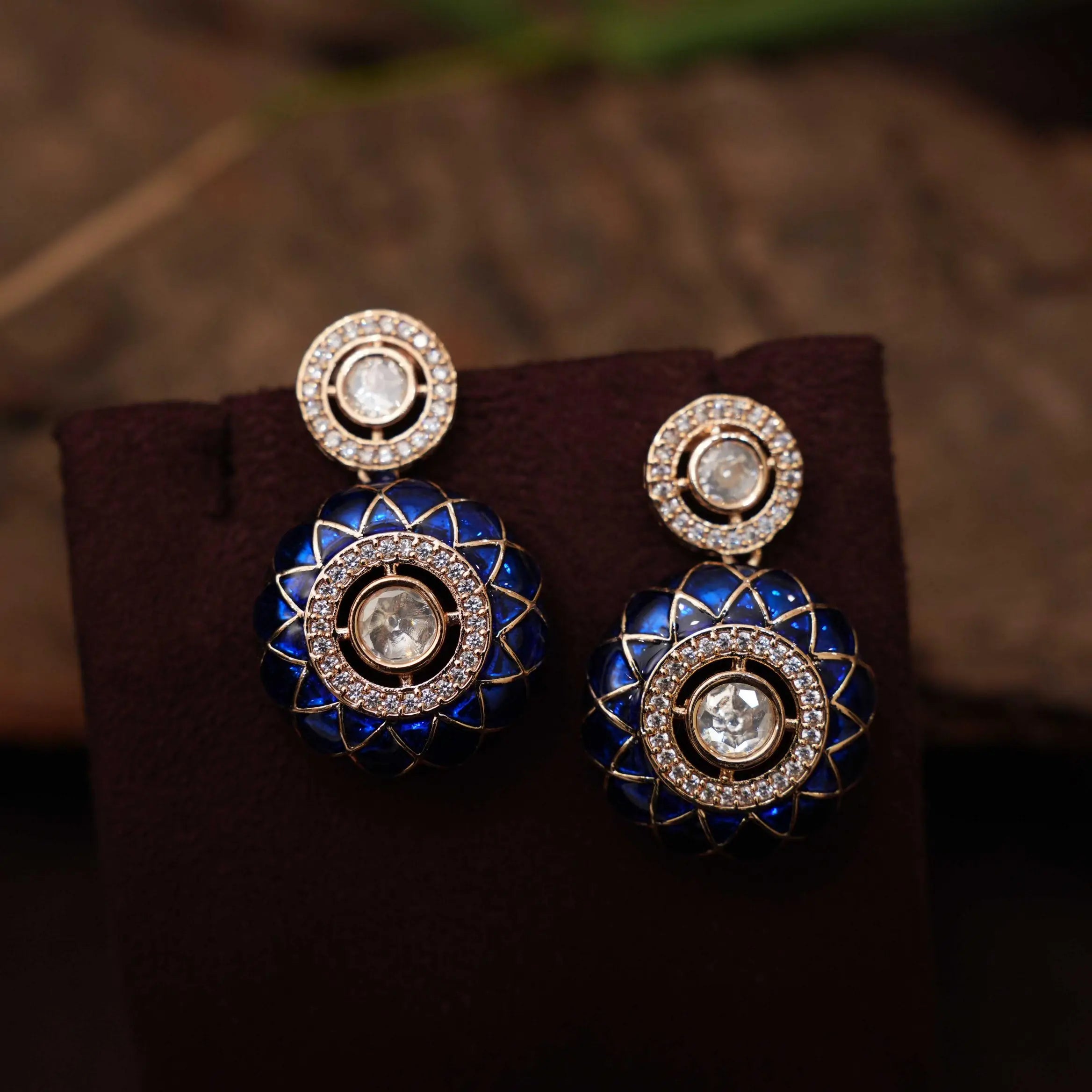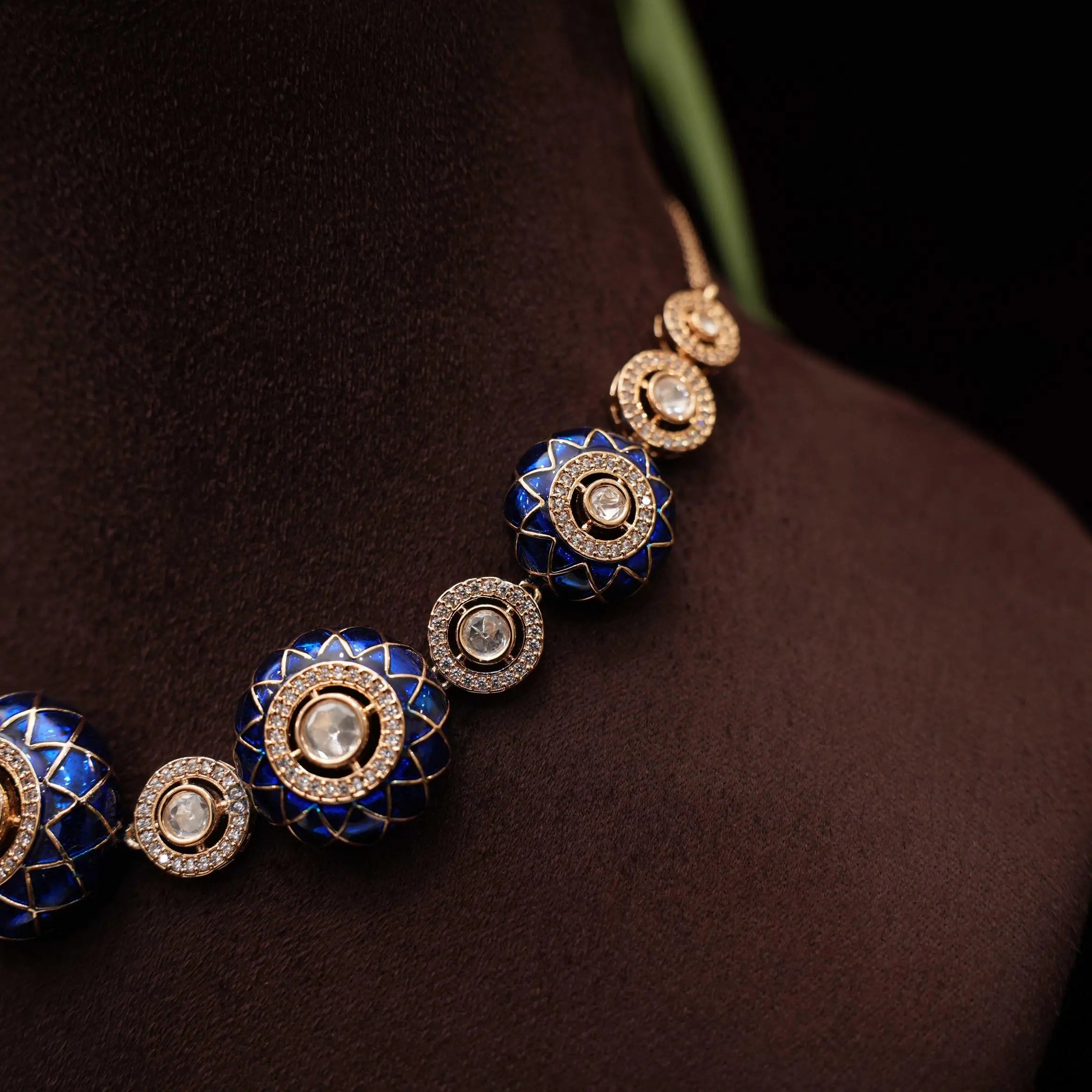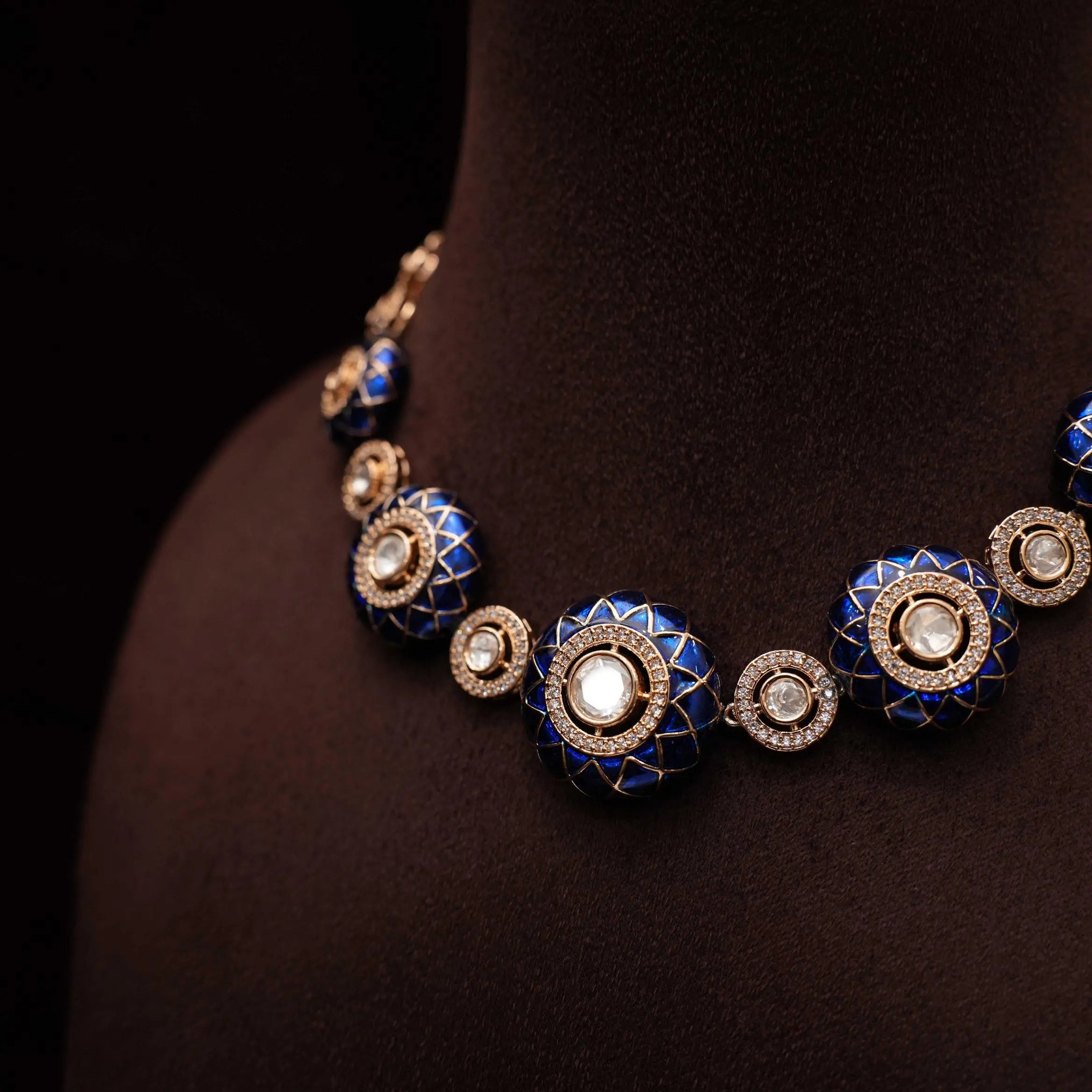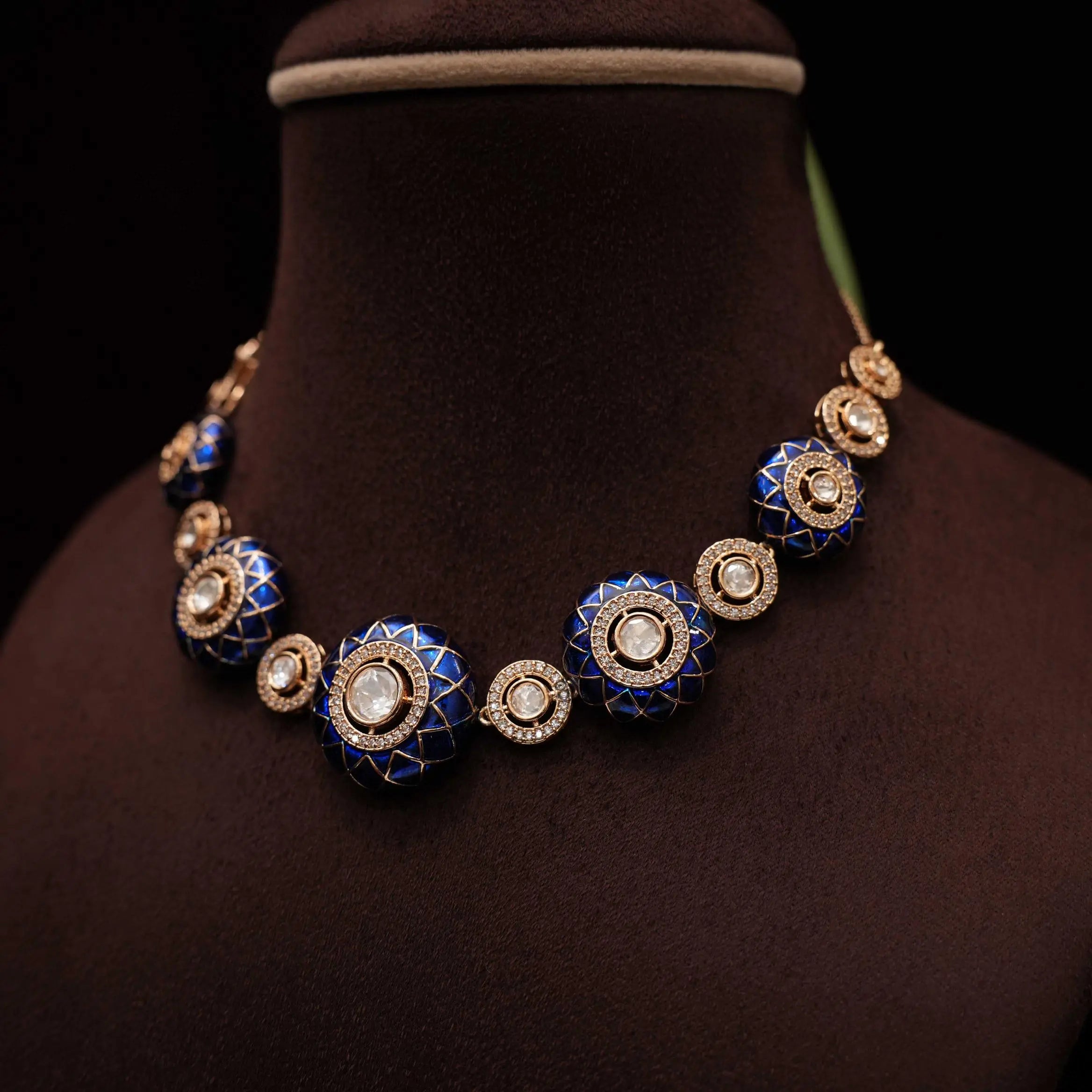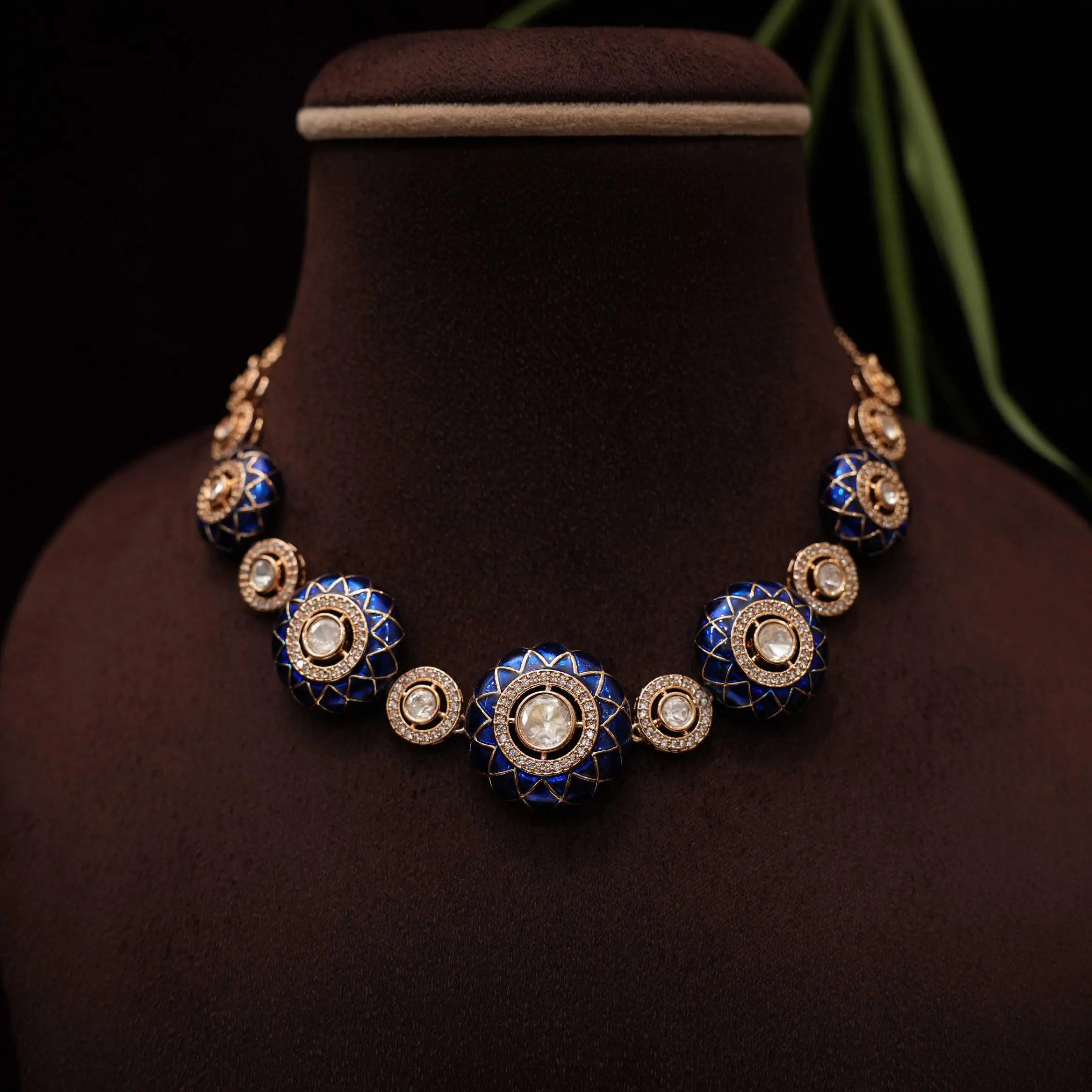 This simple and elegant designer necklace is beautifully handcrafted with shimmering Polki stones and intricate Meenakari enamel work. The delicate craftsmanship and subtle detailing make it a timeless piece, perfect for adding a touch of traditional charm to any outfit. Designed to be both graceful and eye-catching, this necklace set comes complete with a matching pair of earrings, making it an ideal choice for festive occasions, weddings, or elegant gatherings.