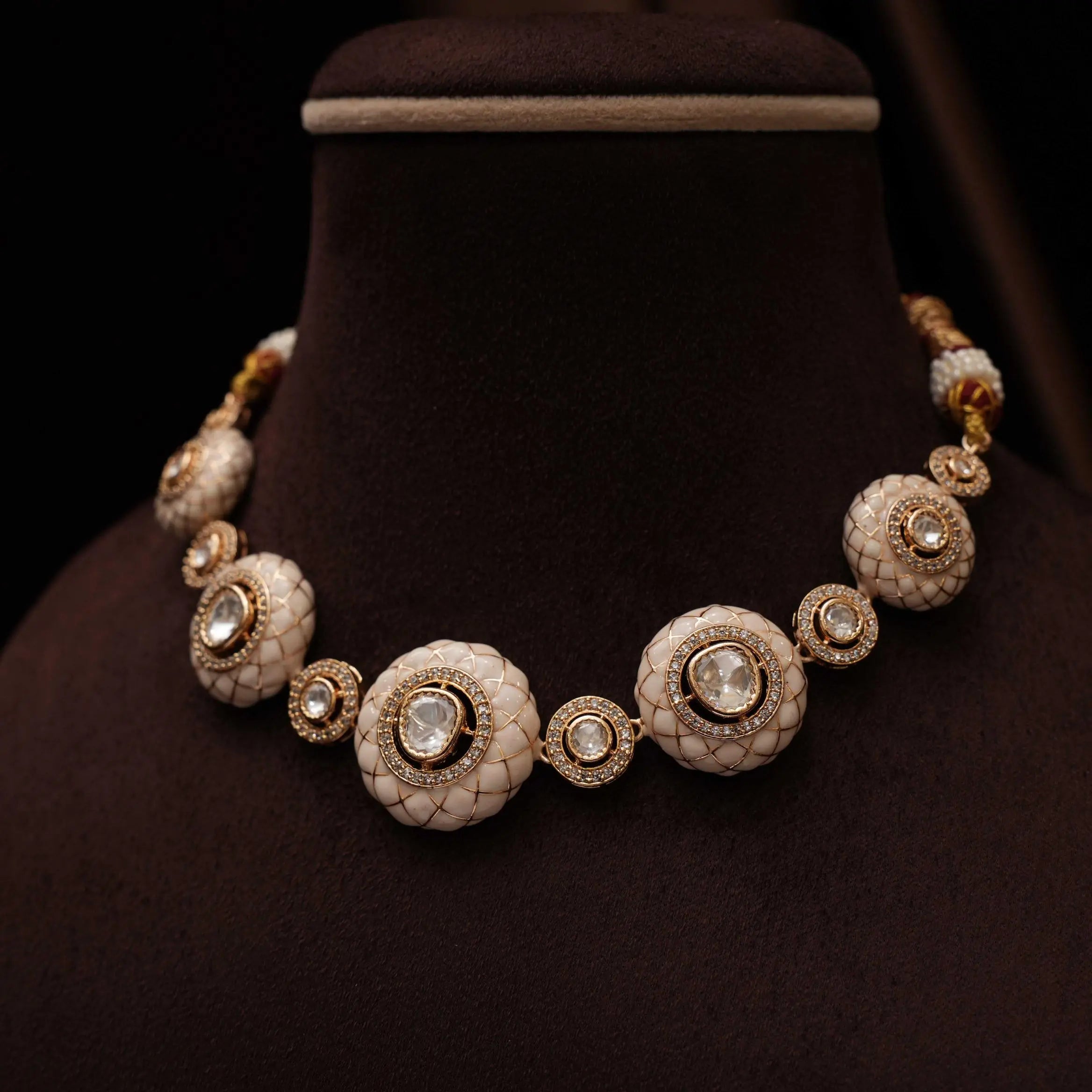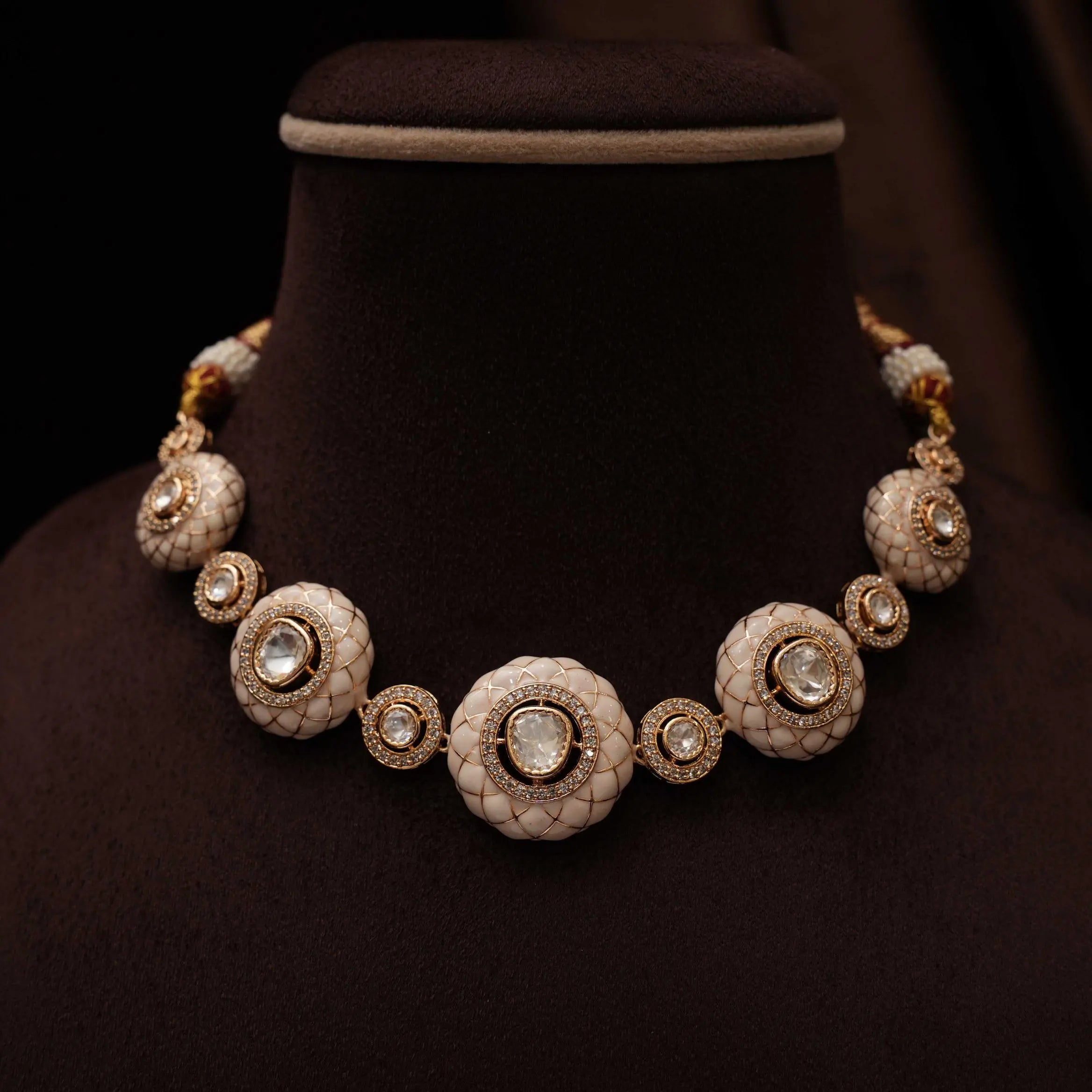 A simple and elegant designer necklace handcrafted with polki stones. This set comes with a pair of earrings.