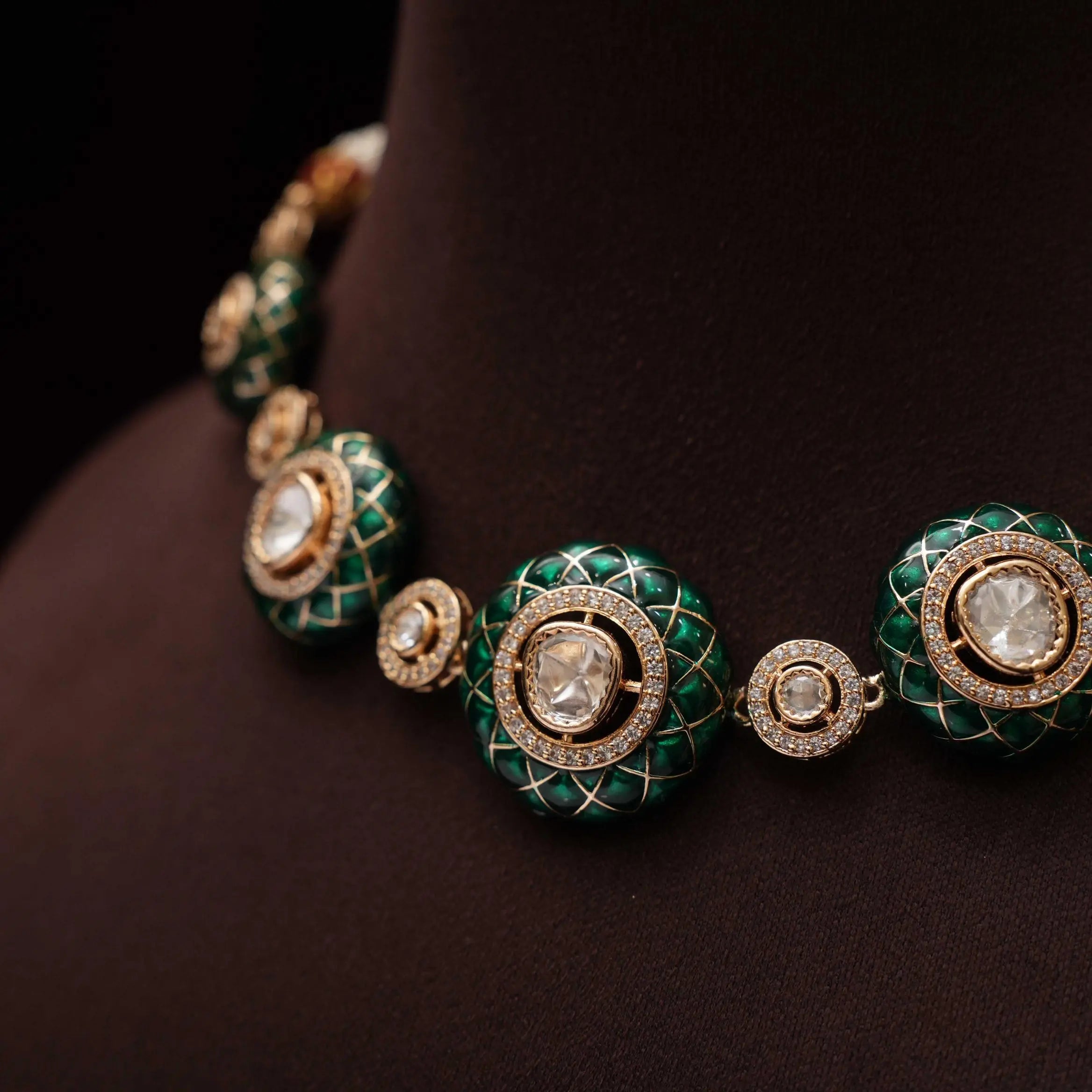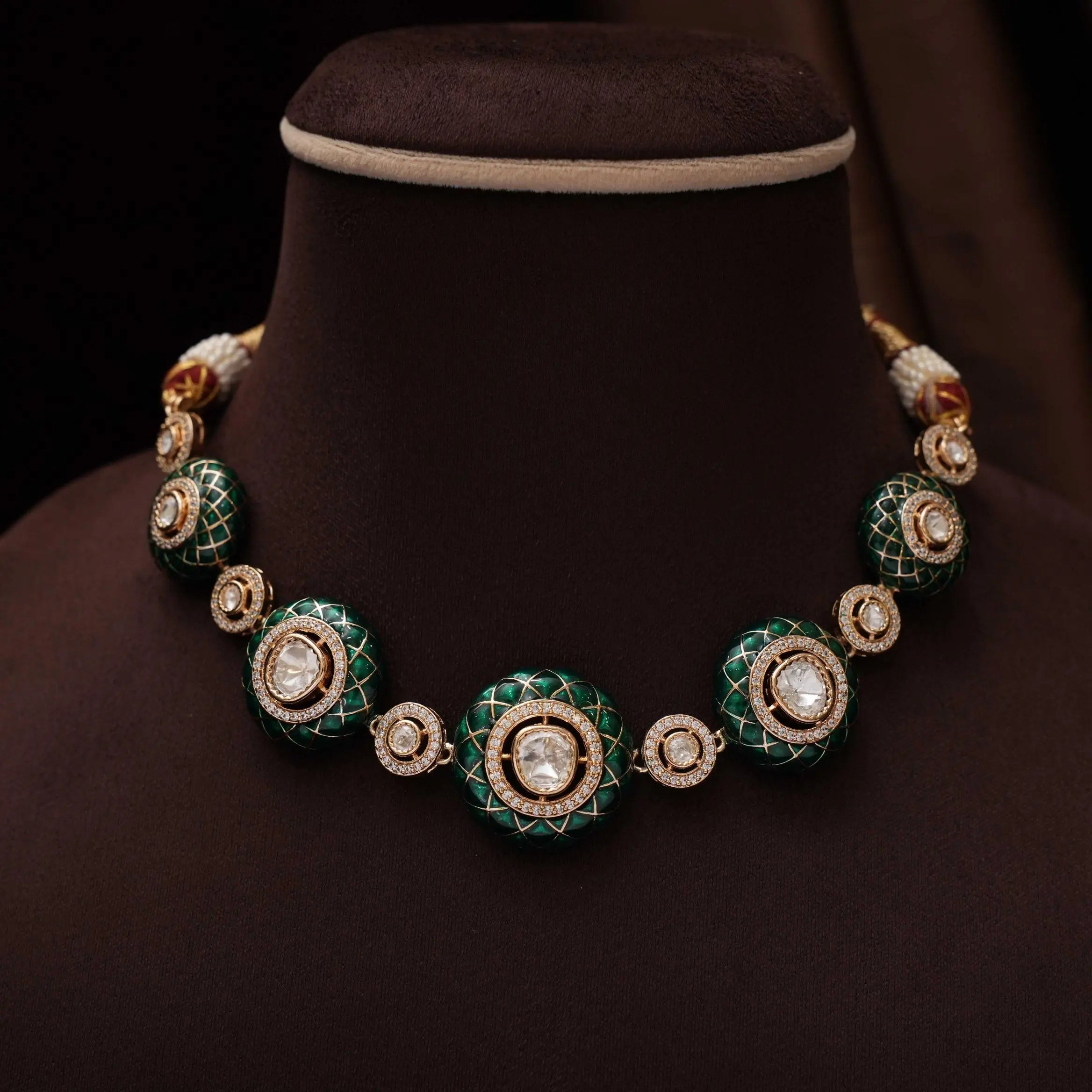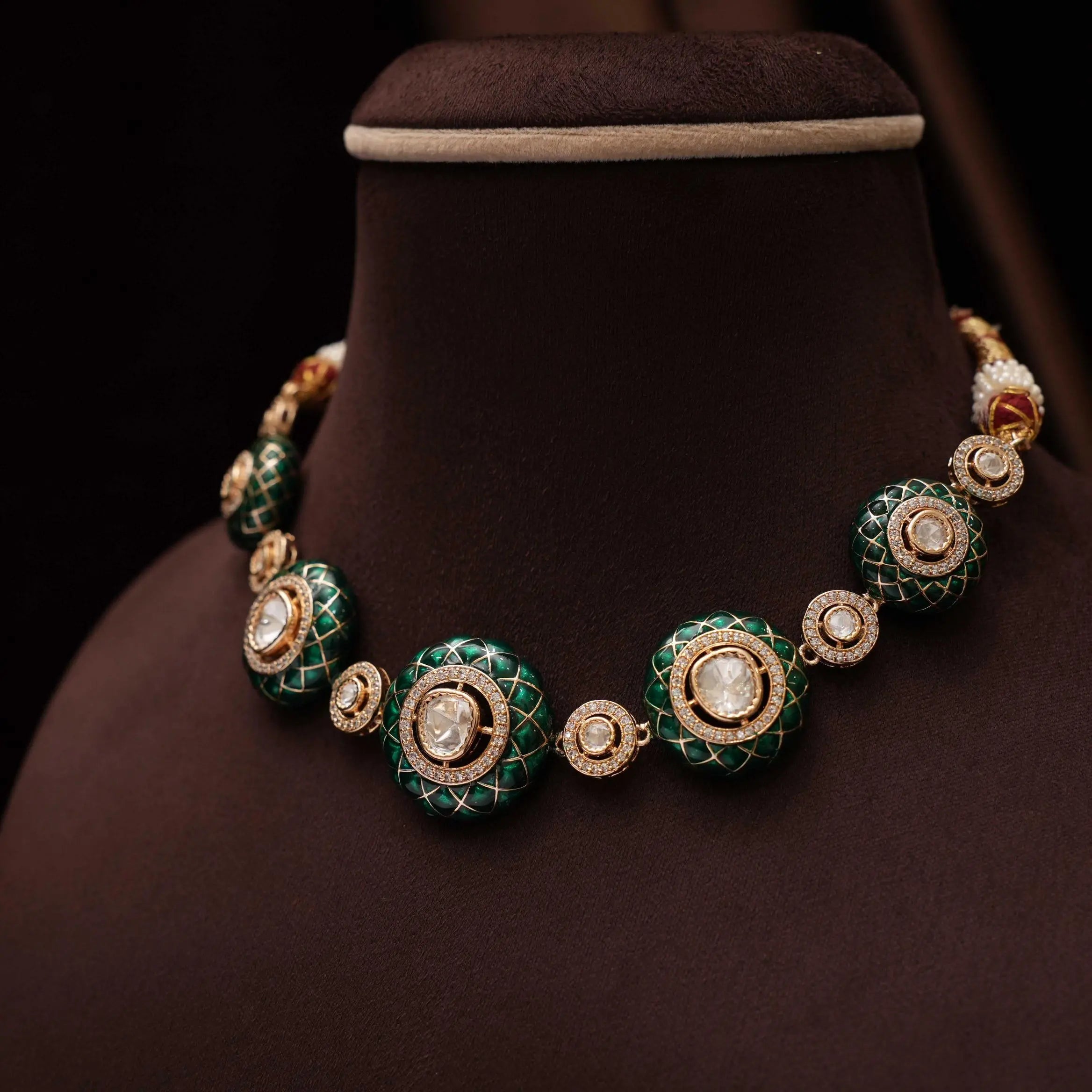 This simple and elegant designer necklace is beautifully handcrafted with shimmering Polki stones and intricate Meenakari enamel work. The delicate craftsmanship and subtle detailing make it a timeless piece, perfect for adding a touch of traditional charm to any outfit.