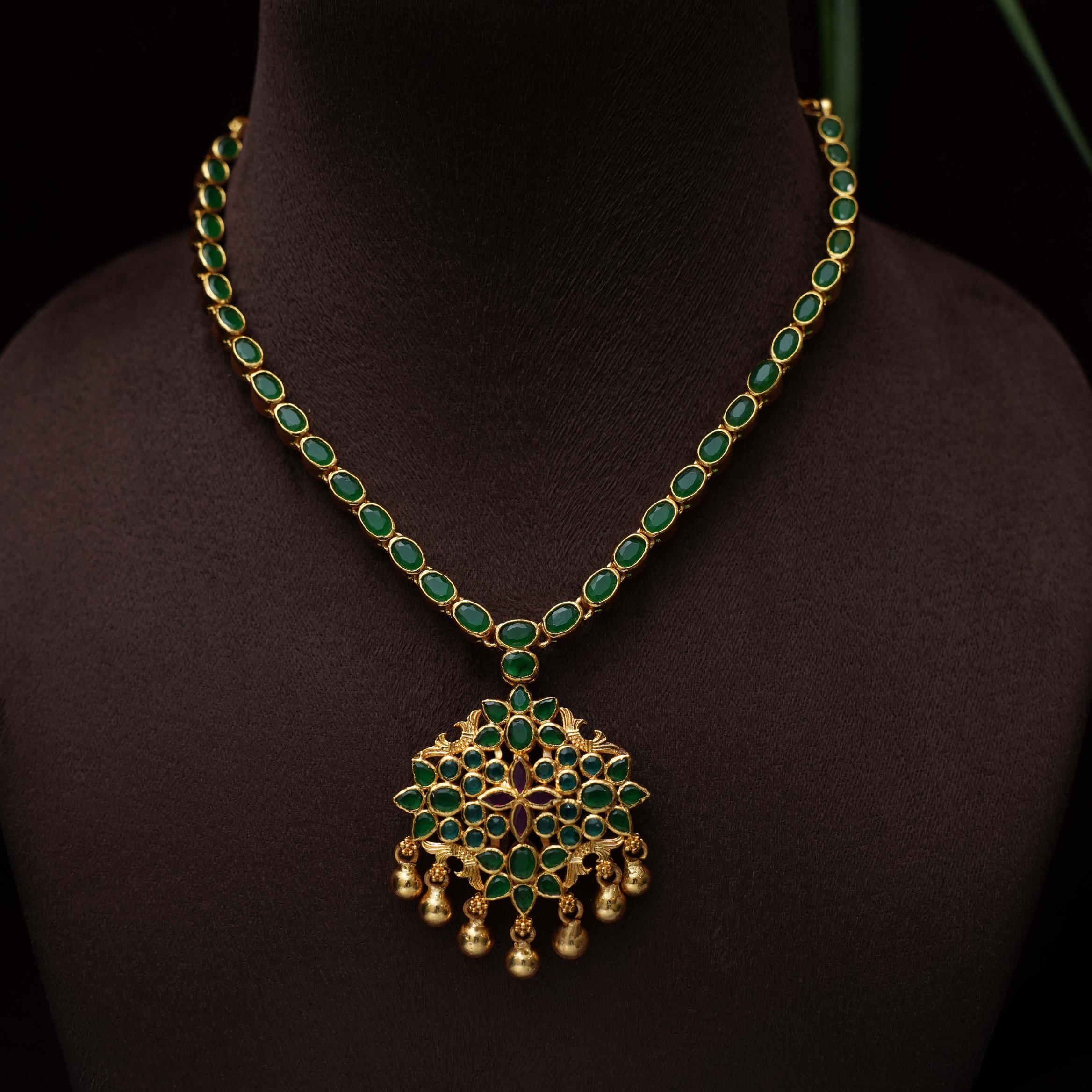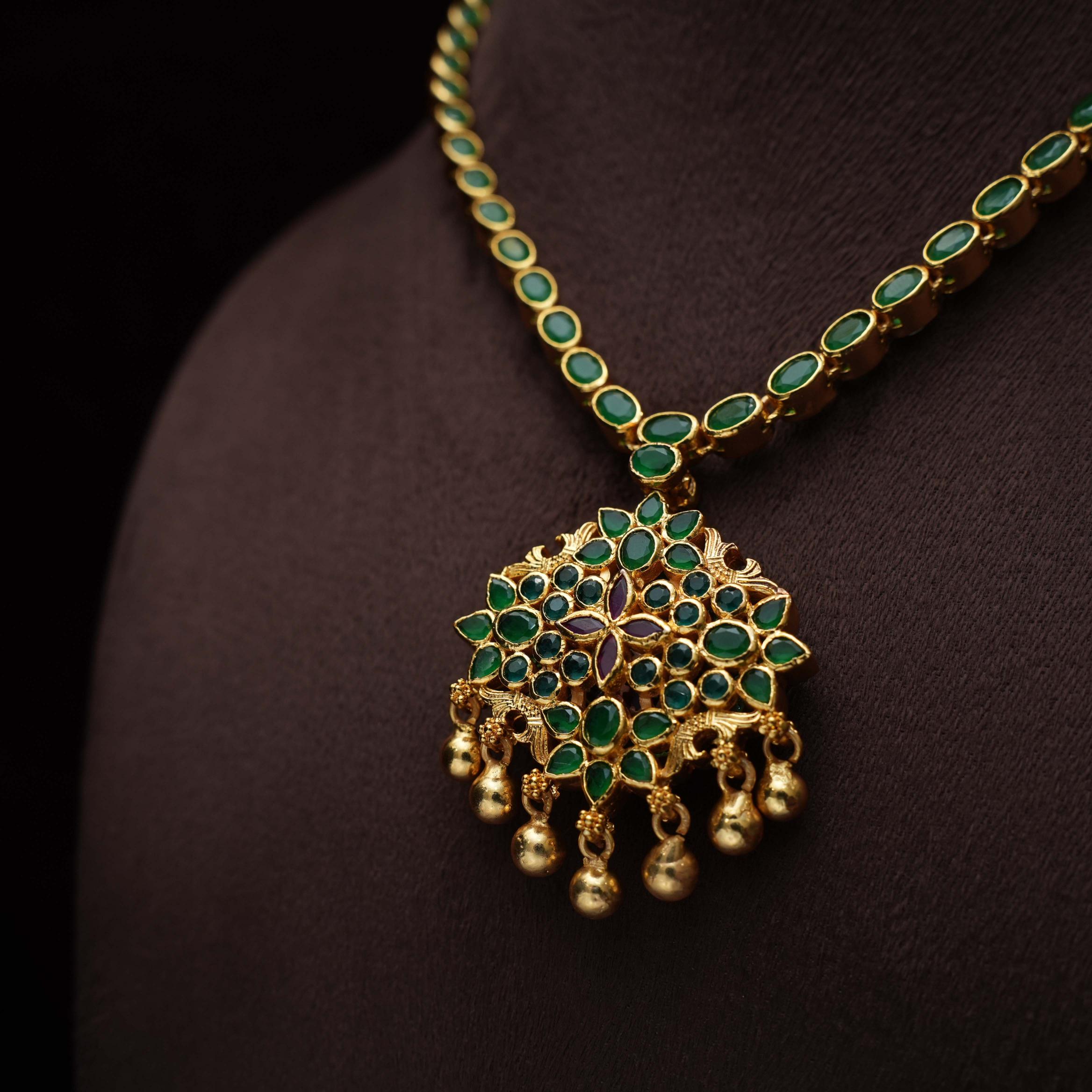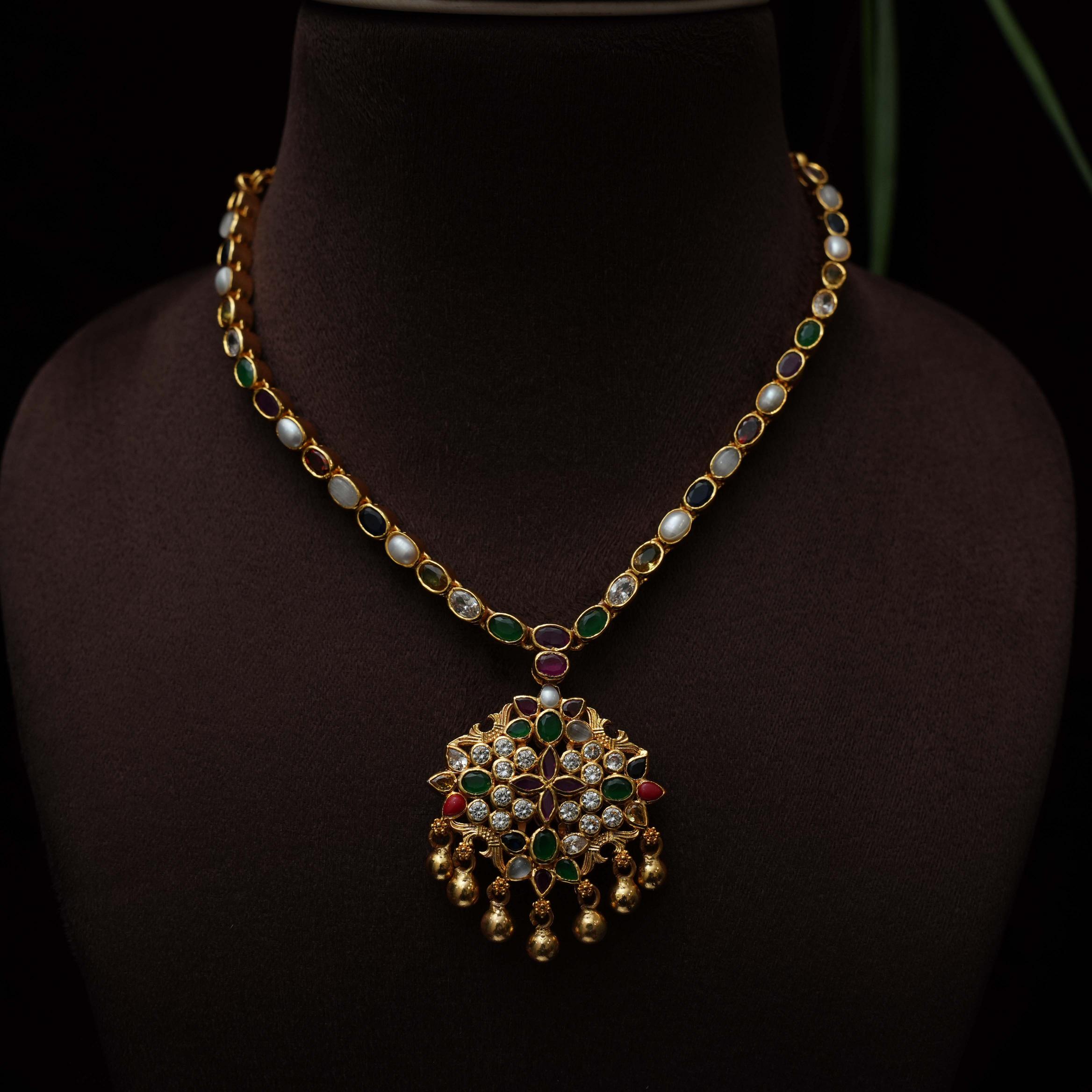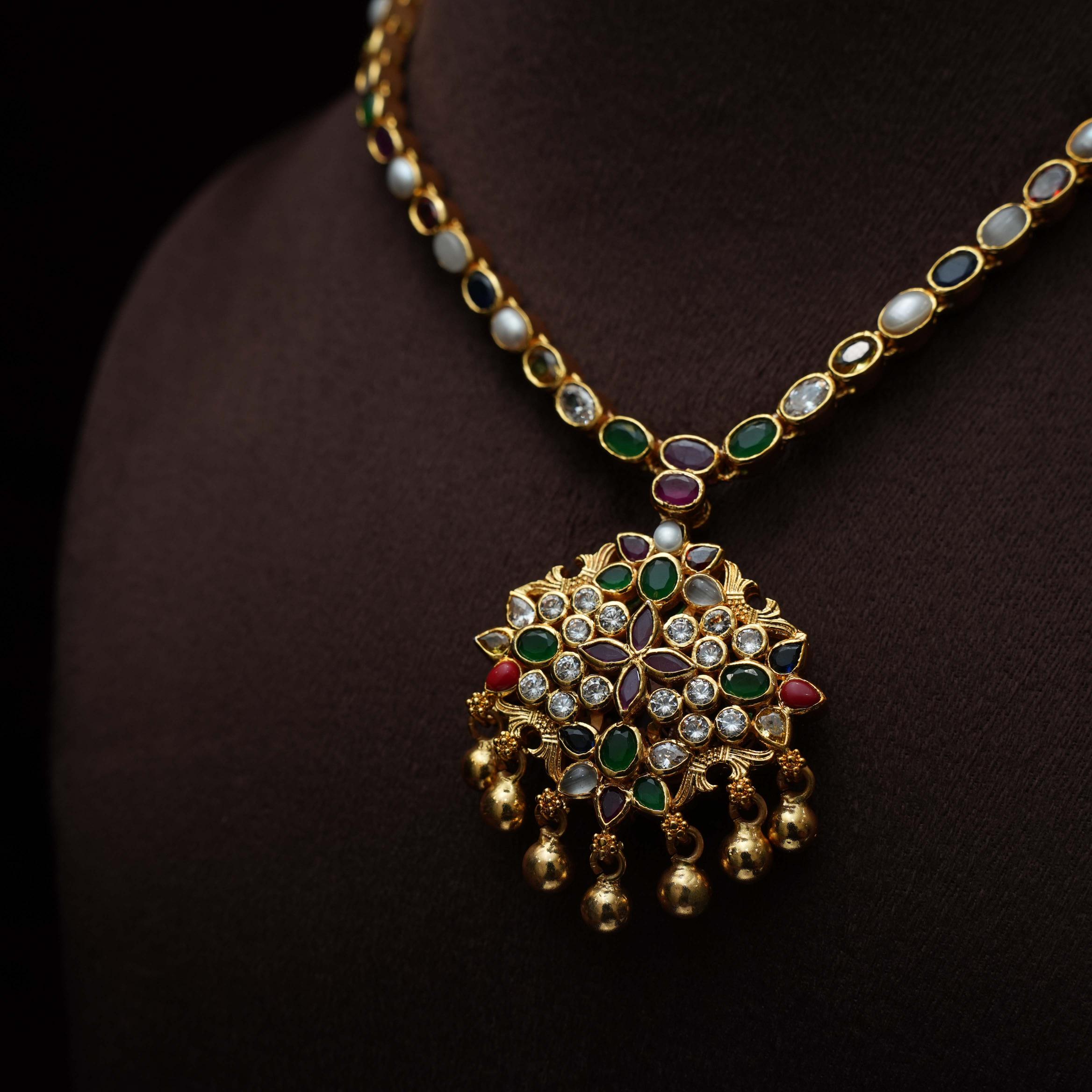A traditional classic silver reversible necklace studded with vibrant Navaratna stones on one side and rich green stones on the other. This versatile design offers two timeless looks in one elegant piece, perfect for festive occasions and traditional celebrations.