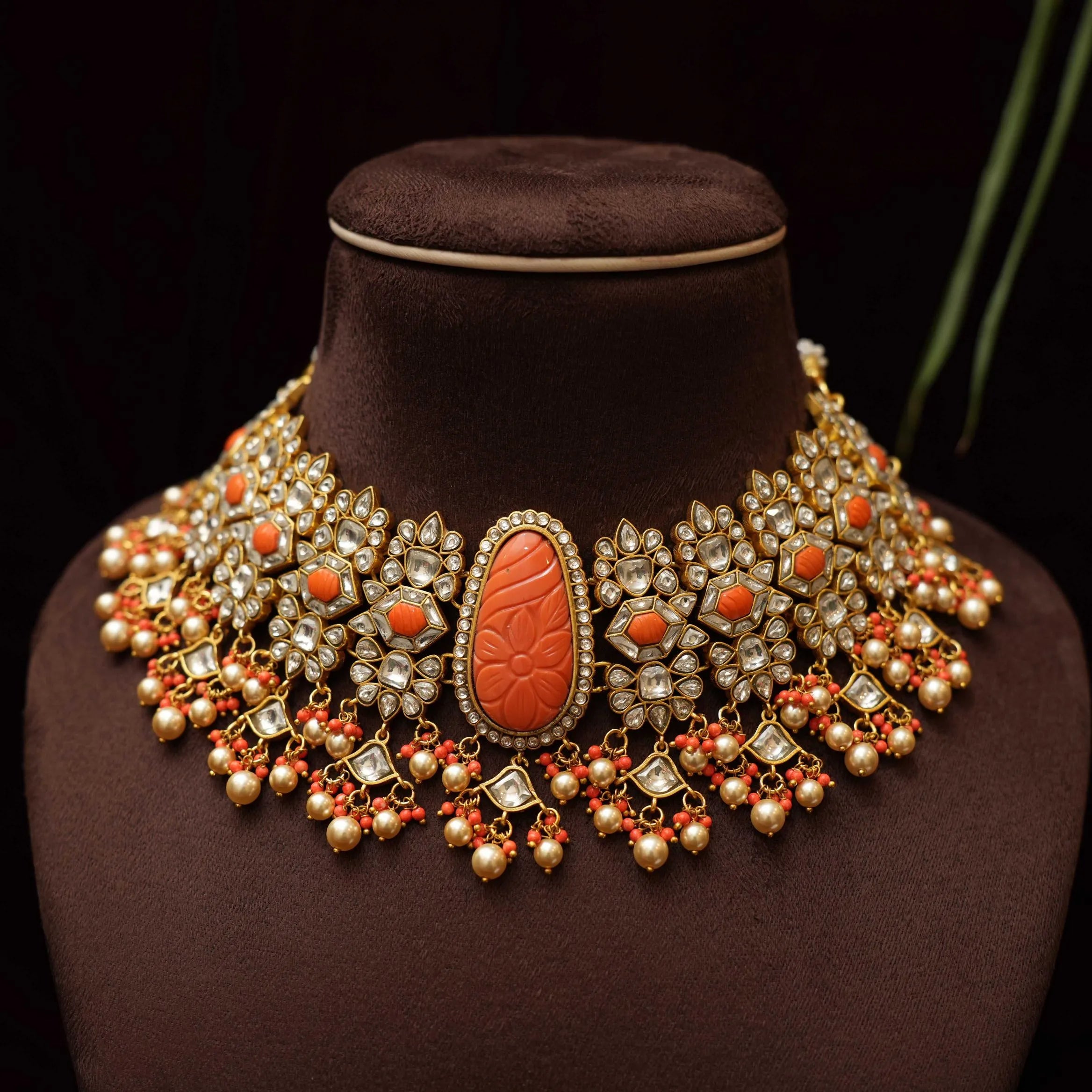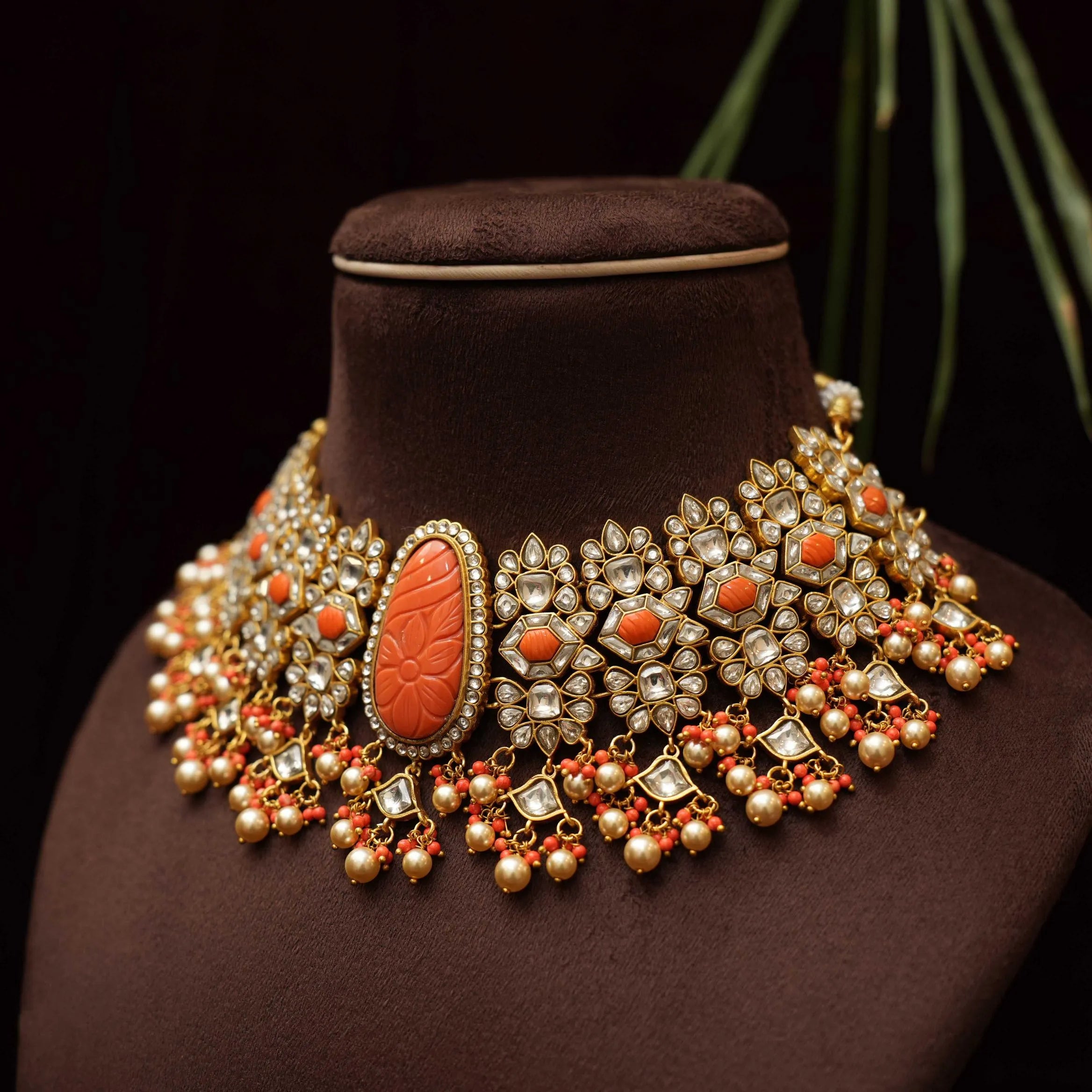 Introducing the exquisite Coral Dhruvi Polki Necklace Set – a perfect blend of timeless tradition and refined elegance. This captivating piece is adorned with premium uncut polki stones, each hand-set to reflect classic Indian craftsmanship. The warm, vibrant tones of coral agate infuse the design with energy and sophistication, beautifully contrasted by the soft glow of gleaming golden beads.
