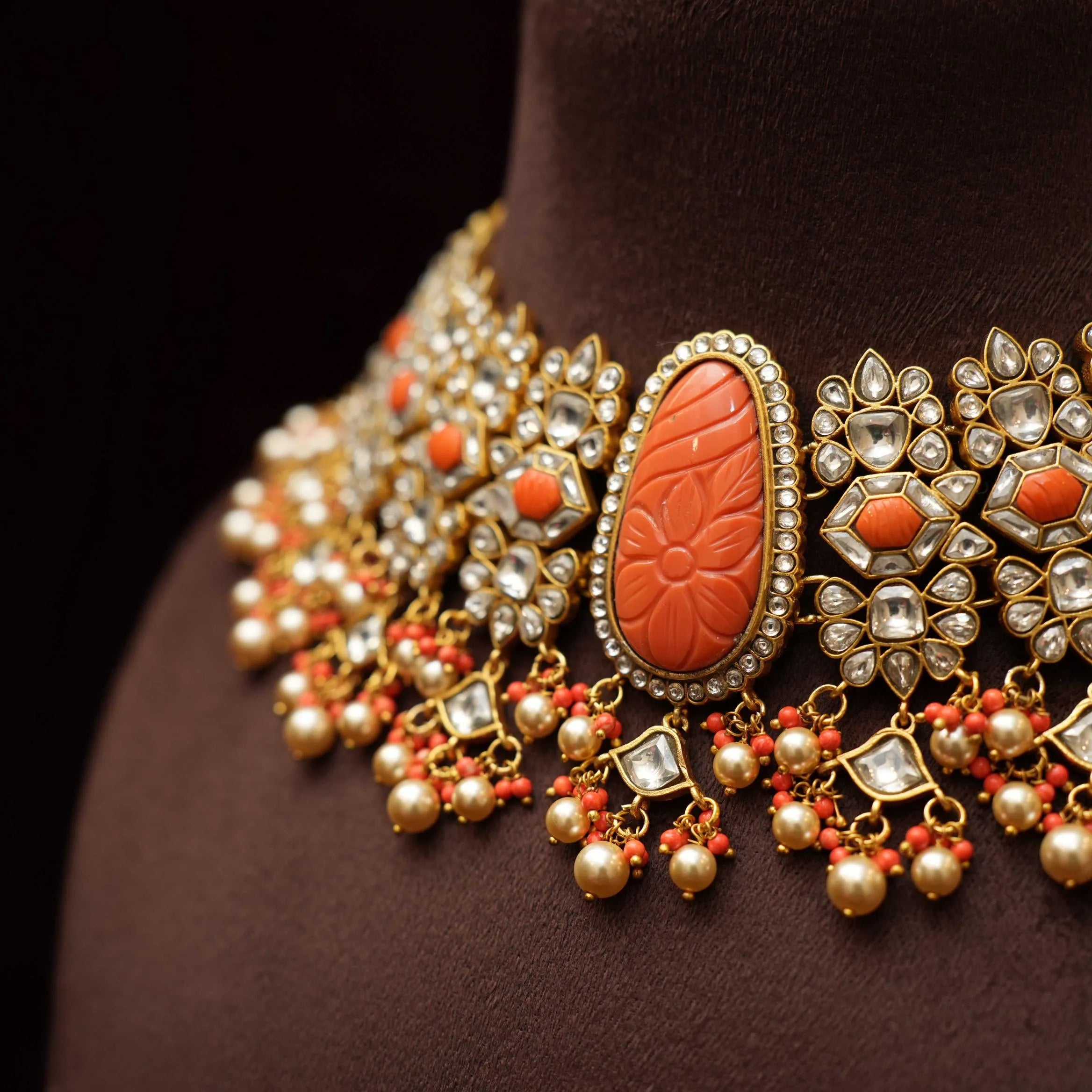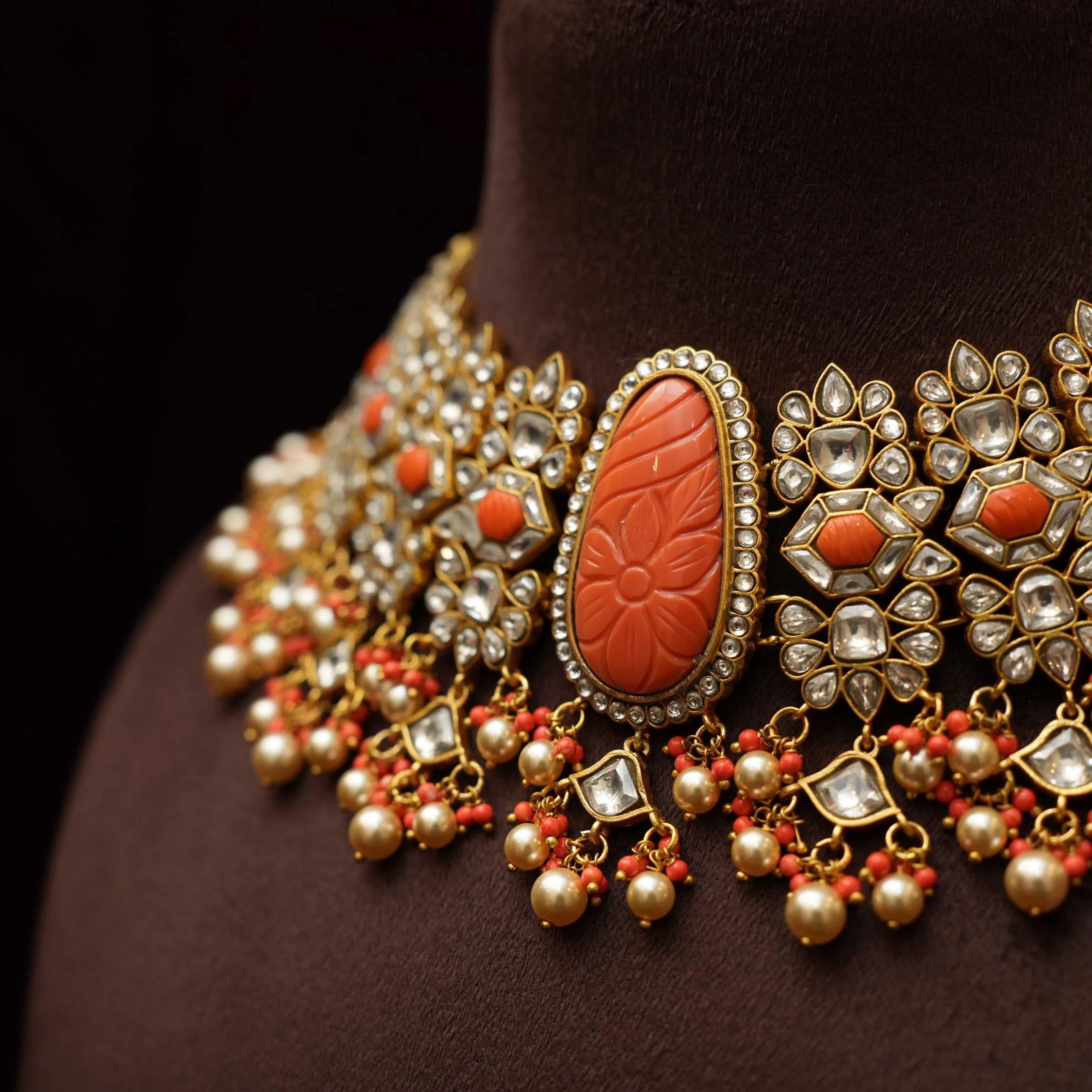 Whether you're looking to enhance a traditional outfit or add a touch of heritage charm to a modern ensemble, the Coral Dhruvi Polki Necklace Set promises to elevate your style. Now available online for the discerning woman who values craftsmanship, beauty, and authenticity.