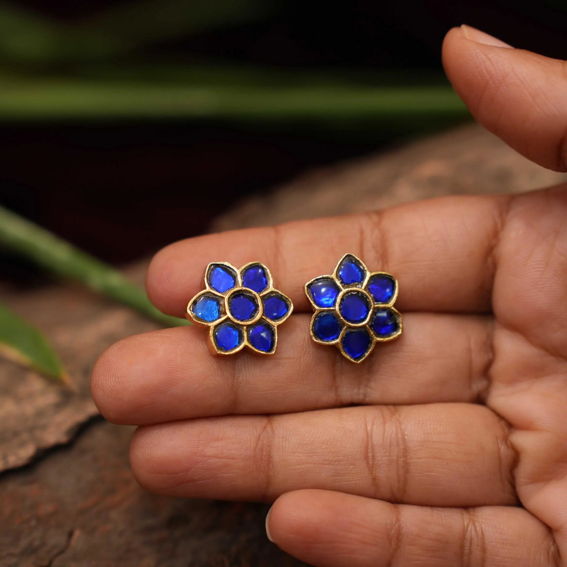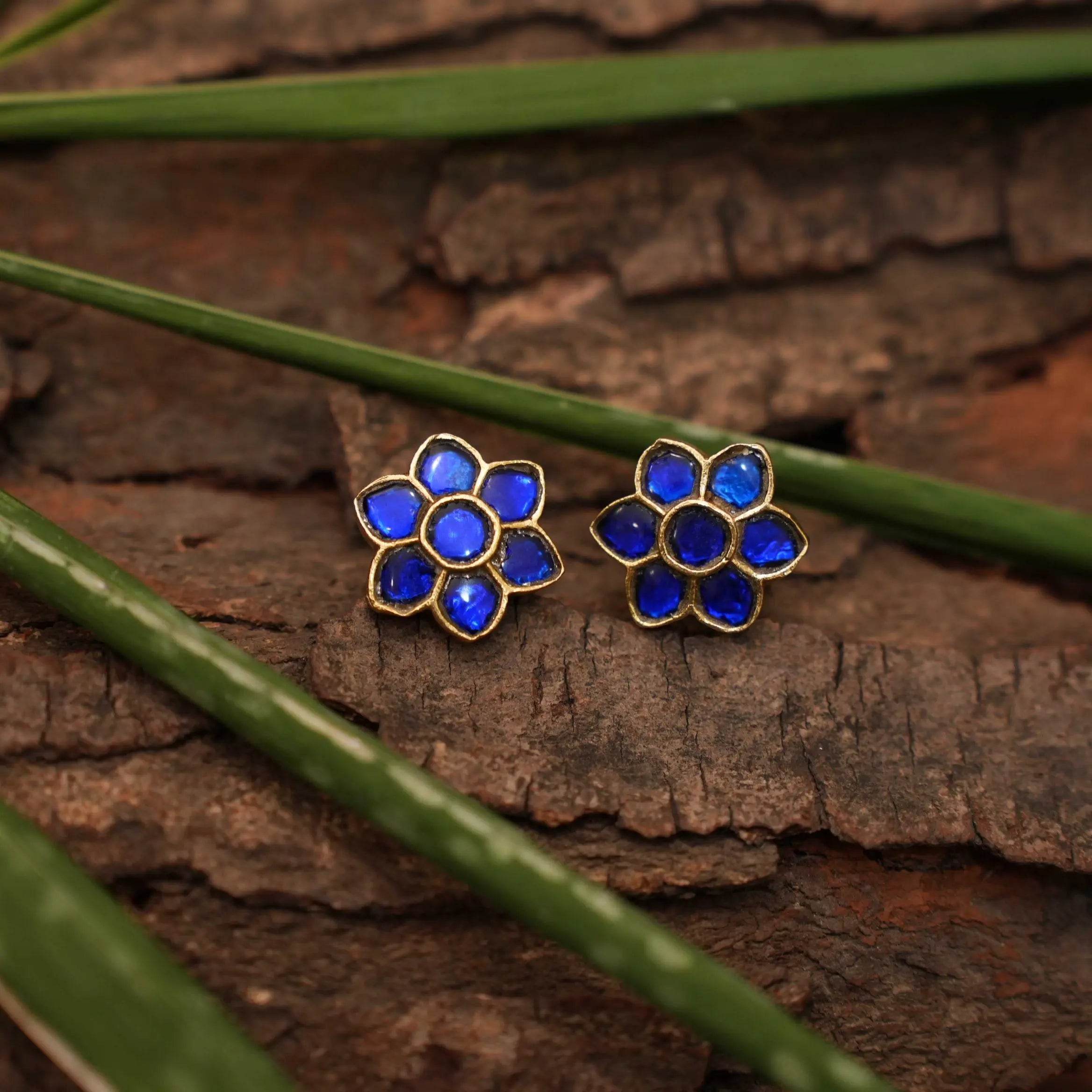 Highlighting tradition, our 92.5 gold-plated silver ear stud in floral motif boasts a vibrant blue stones. This intricately designed piece resonates with cultural heritage, embodying timeless sophistication and artistic finesse.