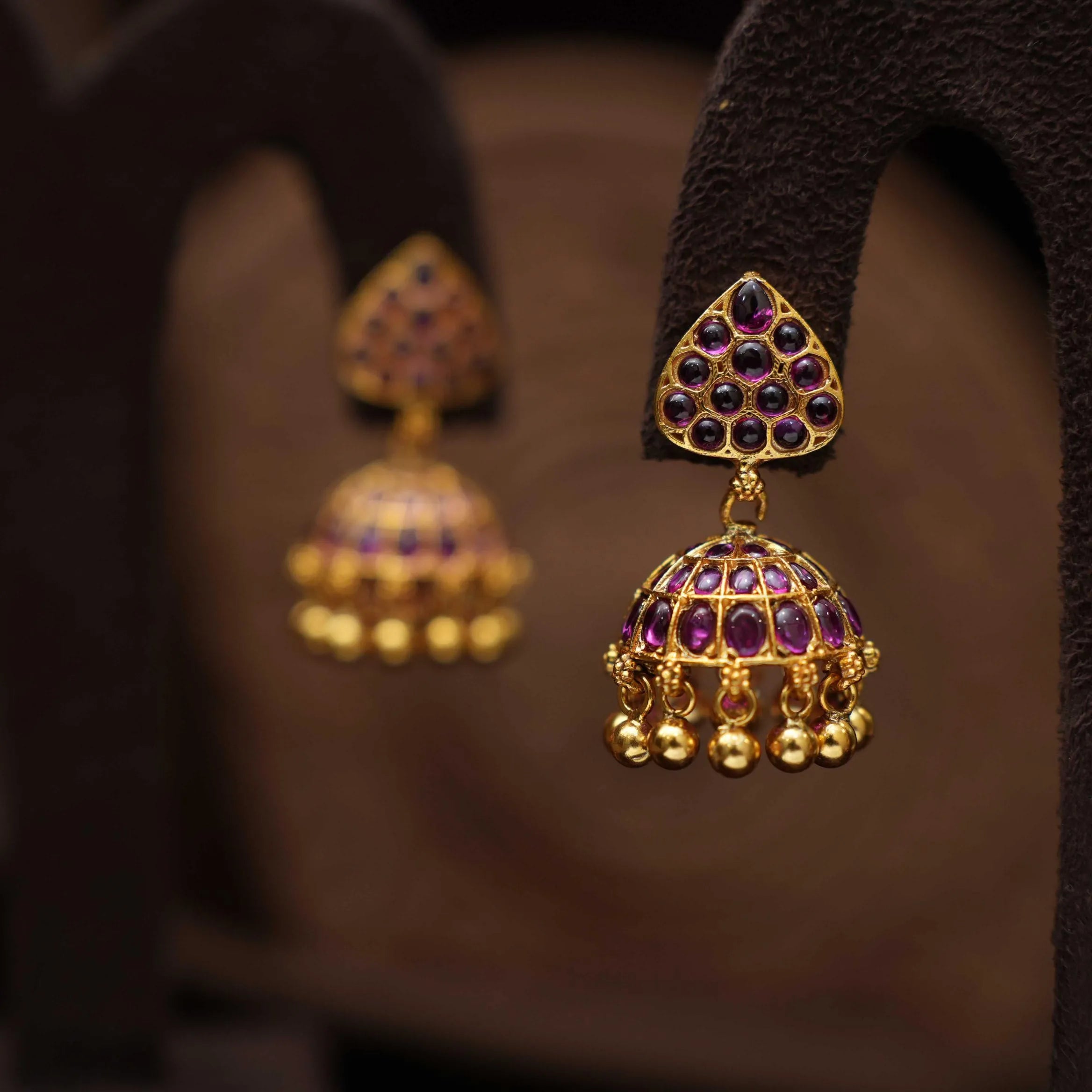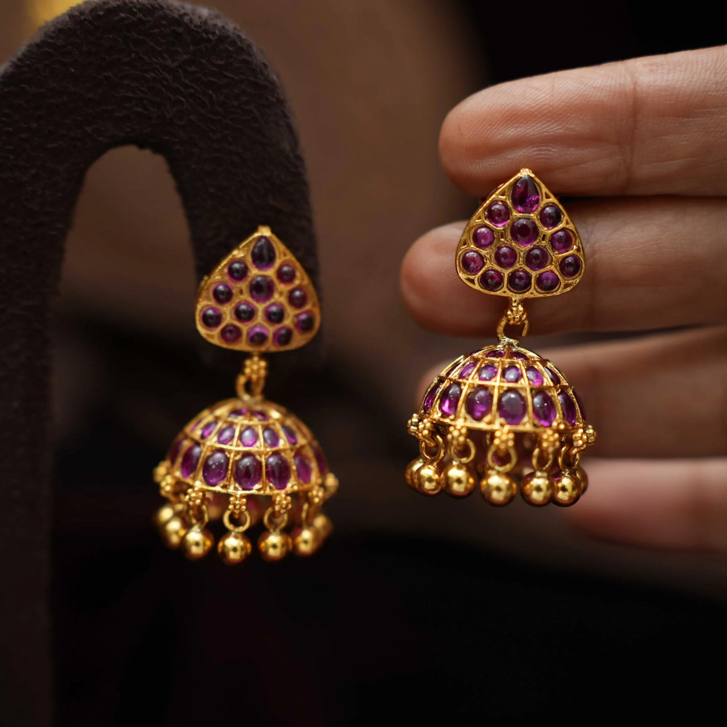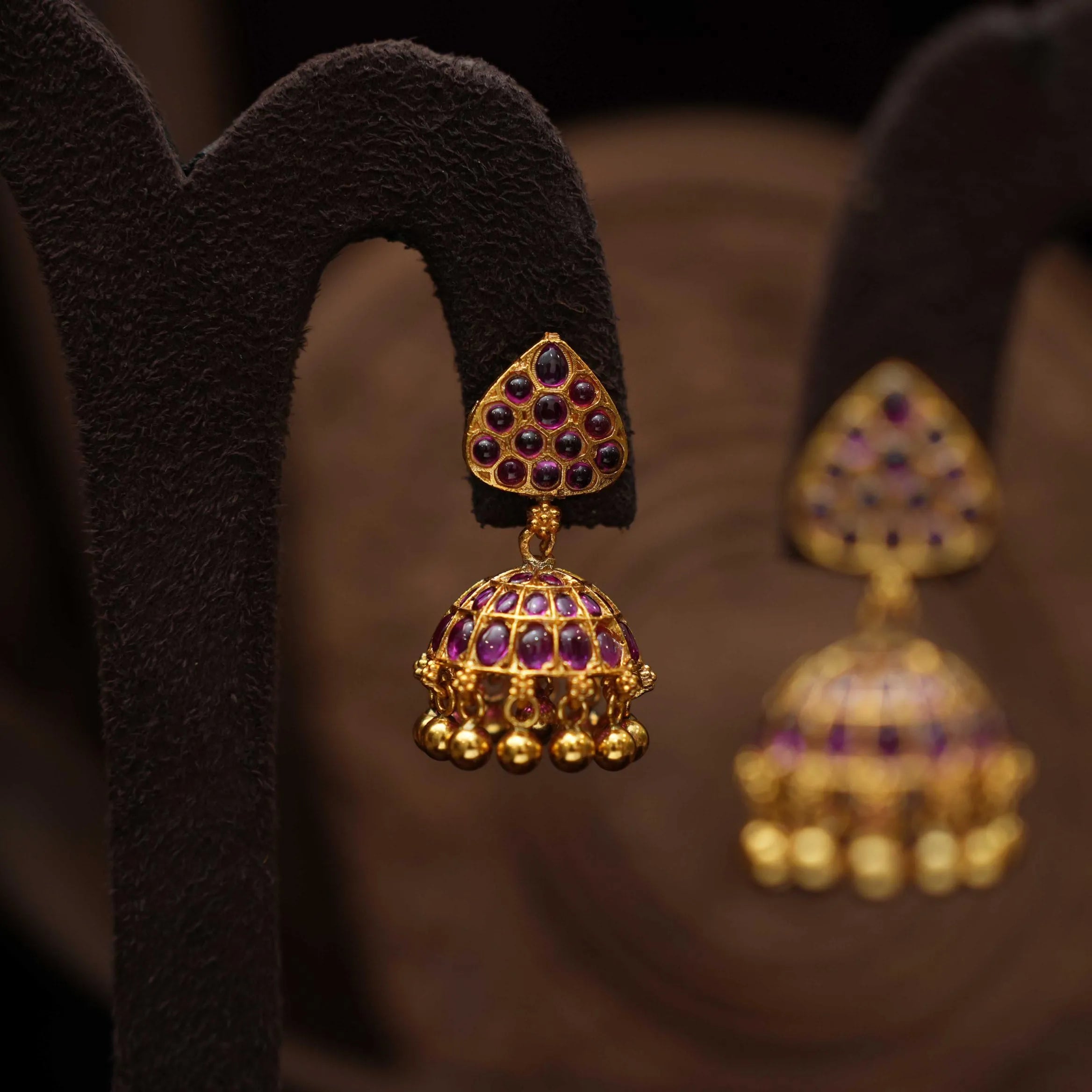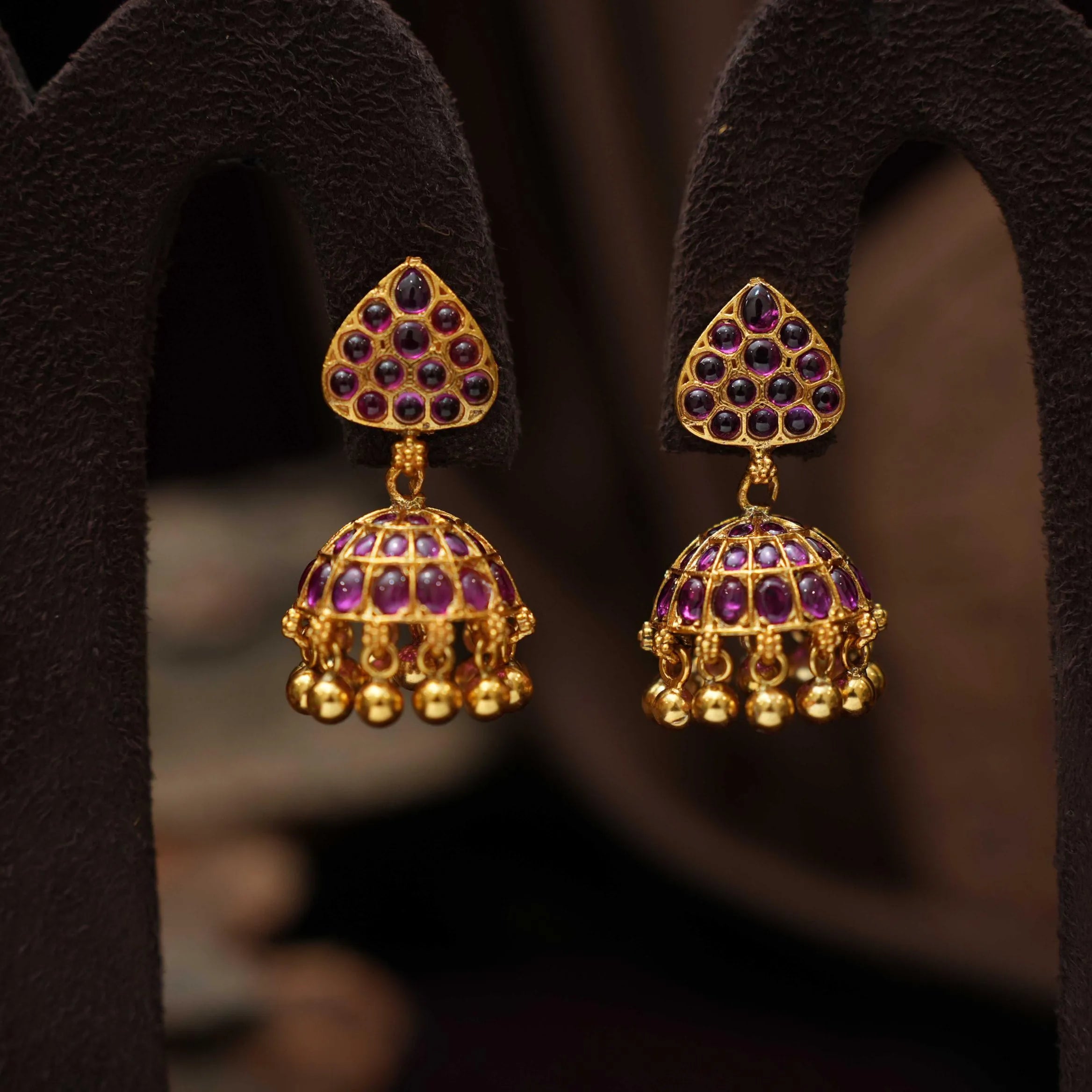 Discover a classic charm with our 92.5 gold-plated silver jhumka, showcasing vibrant red stones adorned with ghungroos, harmonized by a geometric motif. This intricately crafted piece radiates cultural elegance and timeless allure.