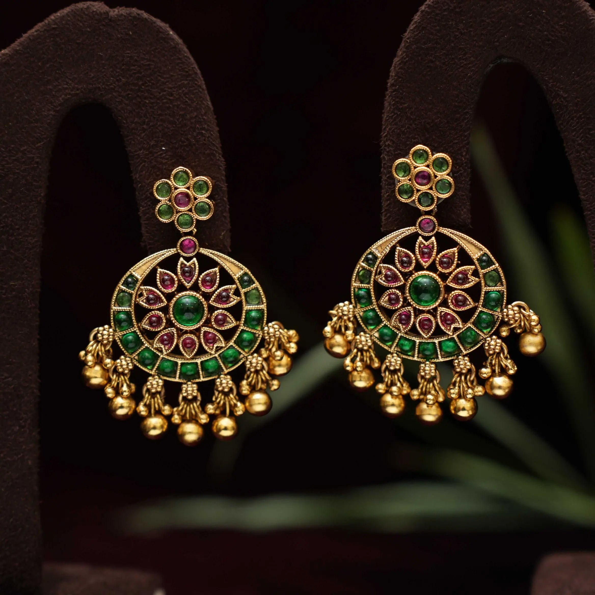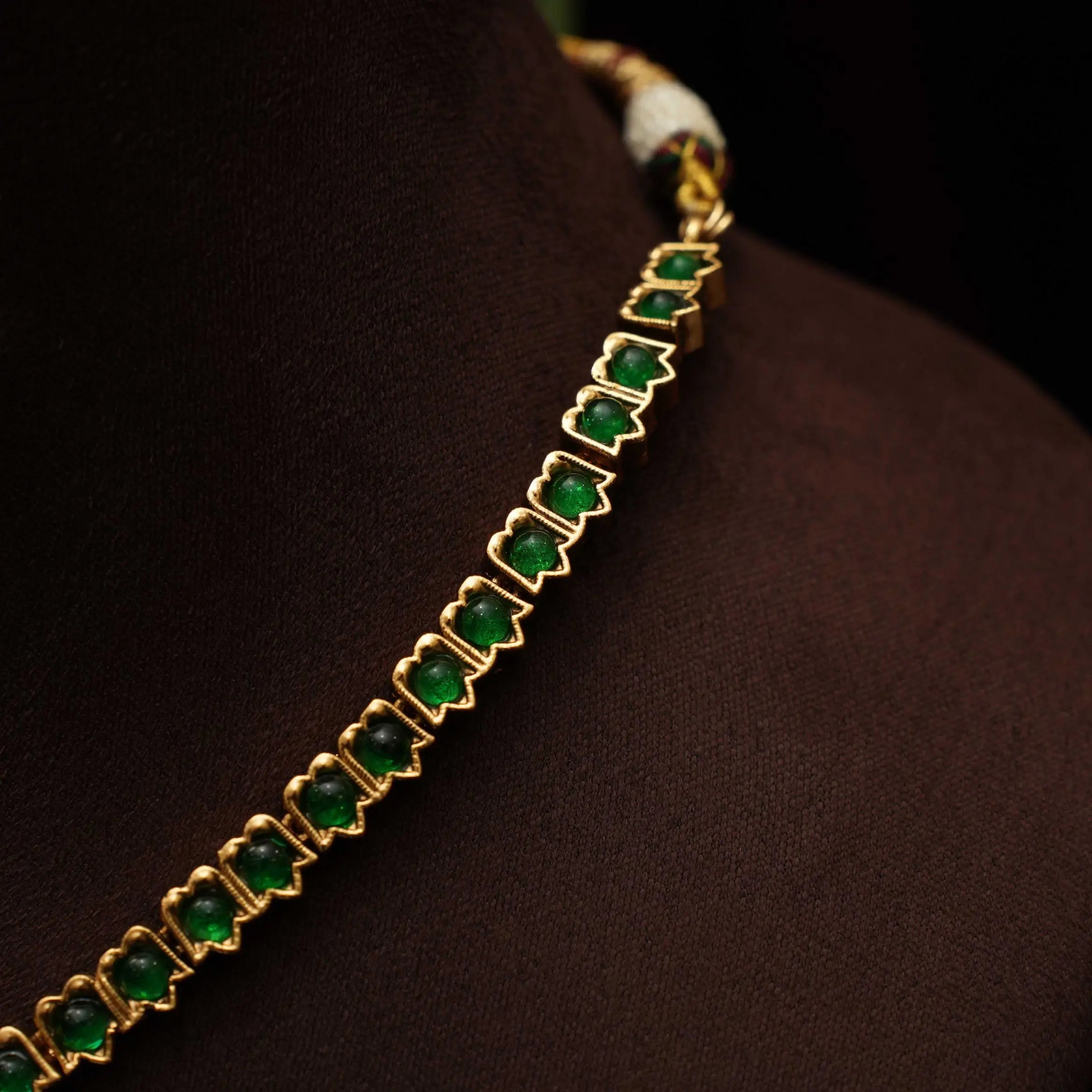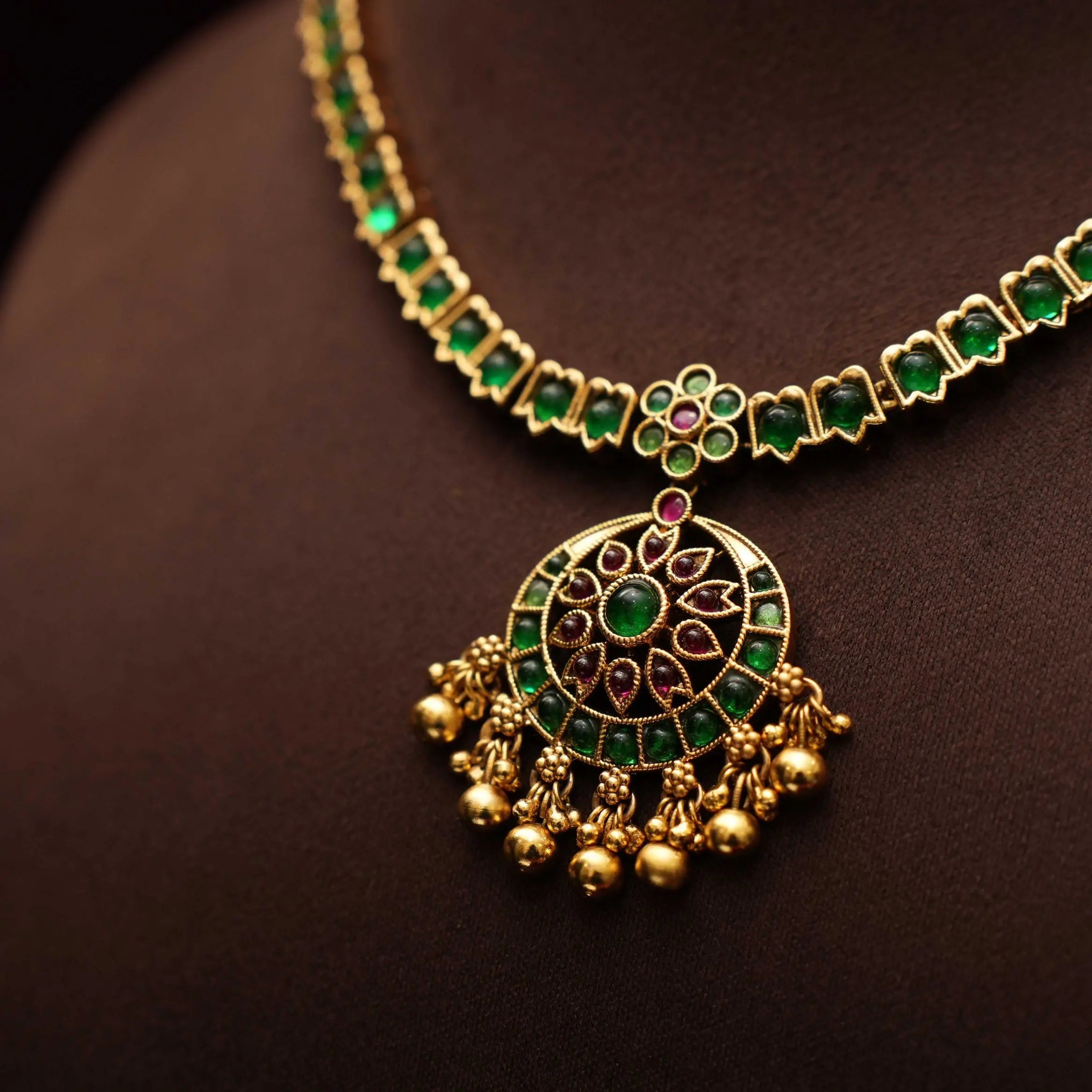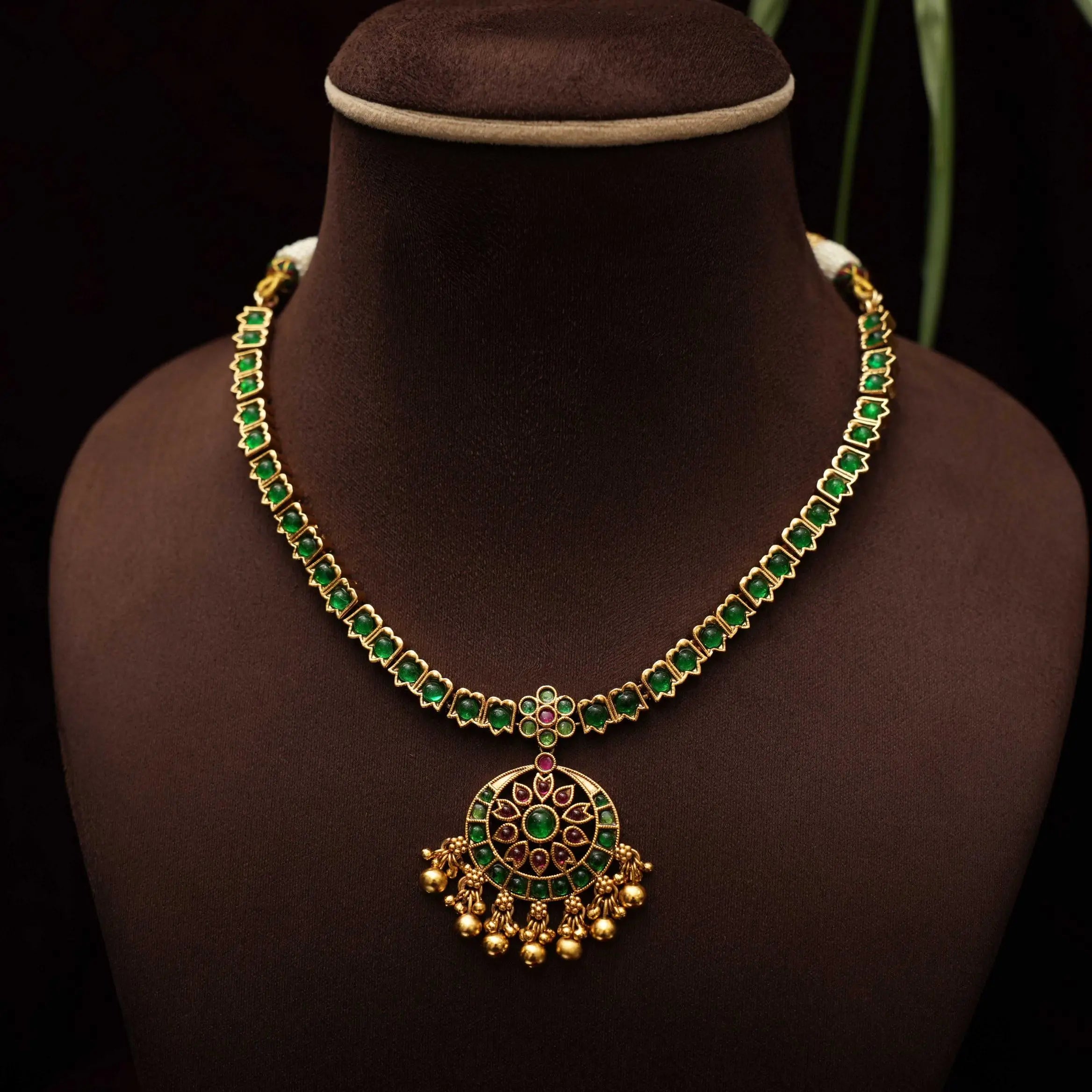 An elegant antique necklace in chand motif pendant studded with green kemp stones. This set comes with a pair of earrings.