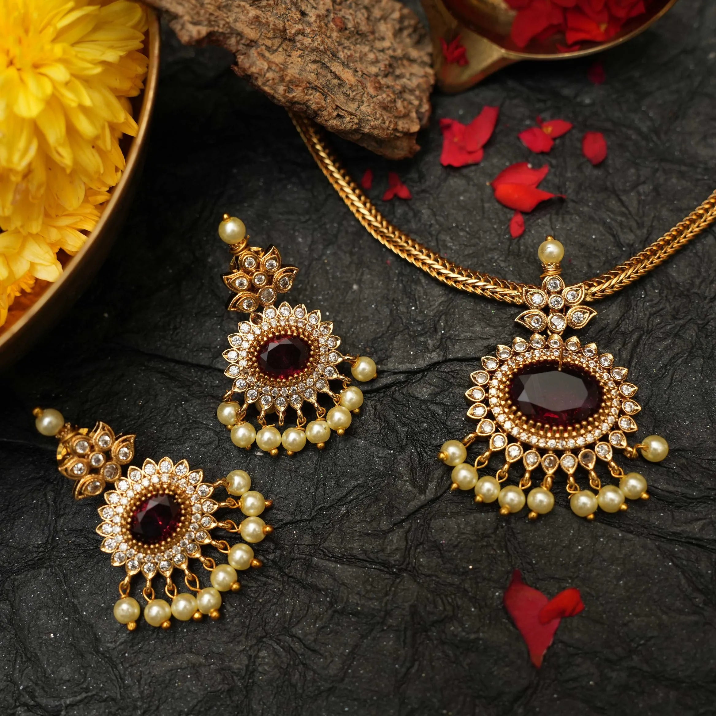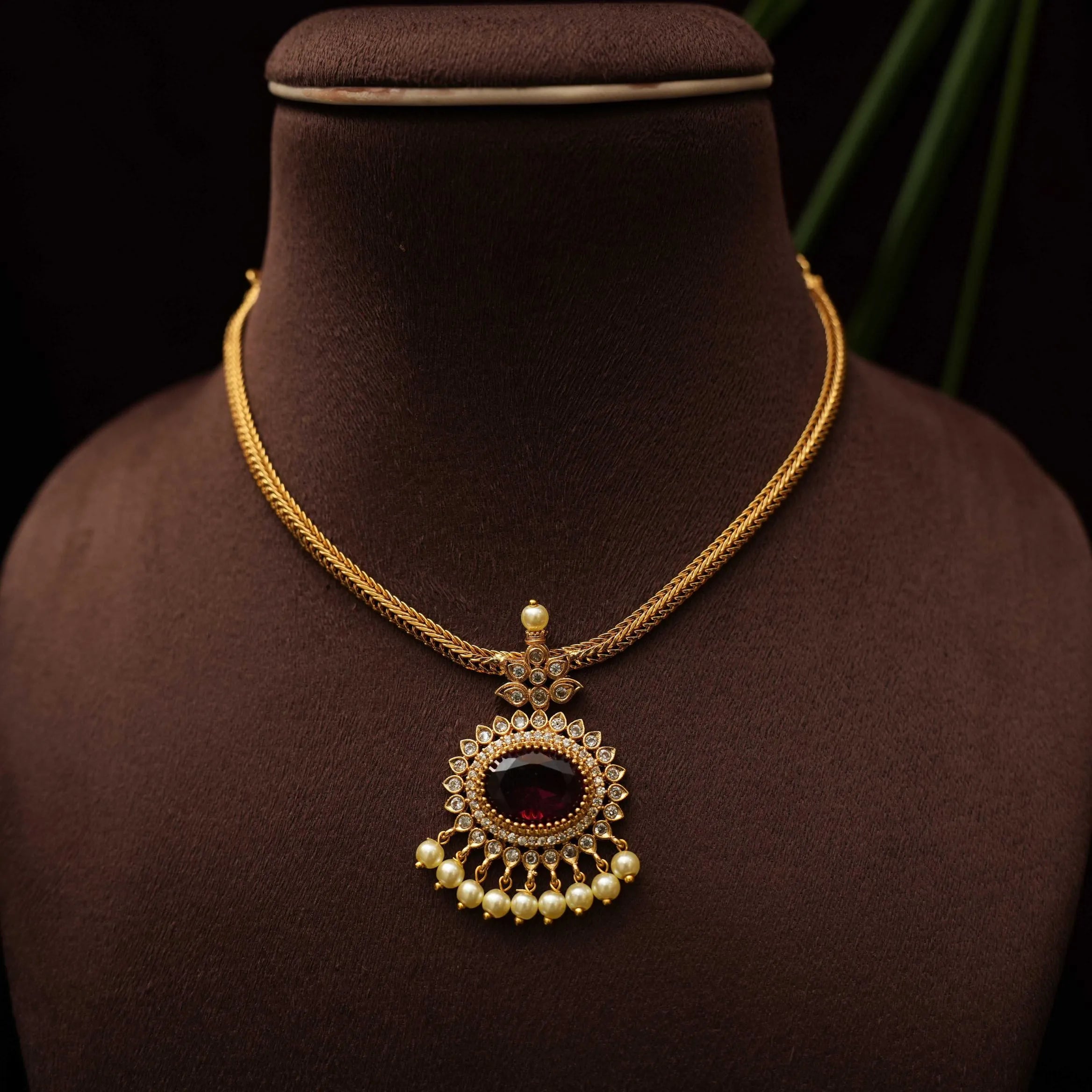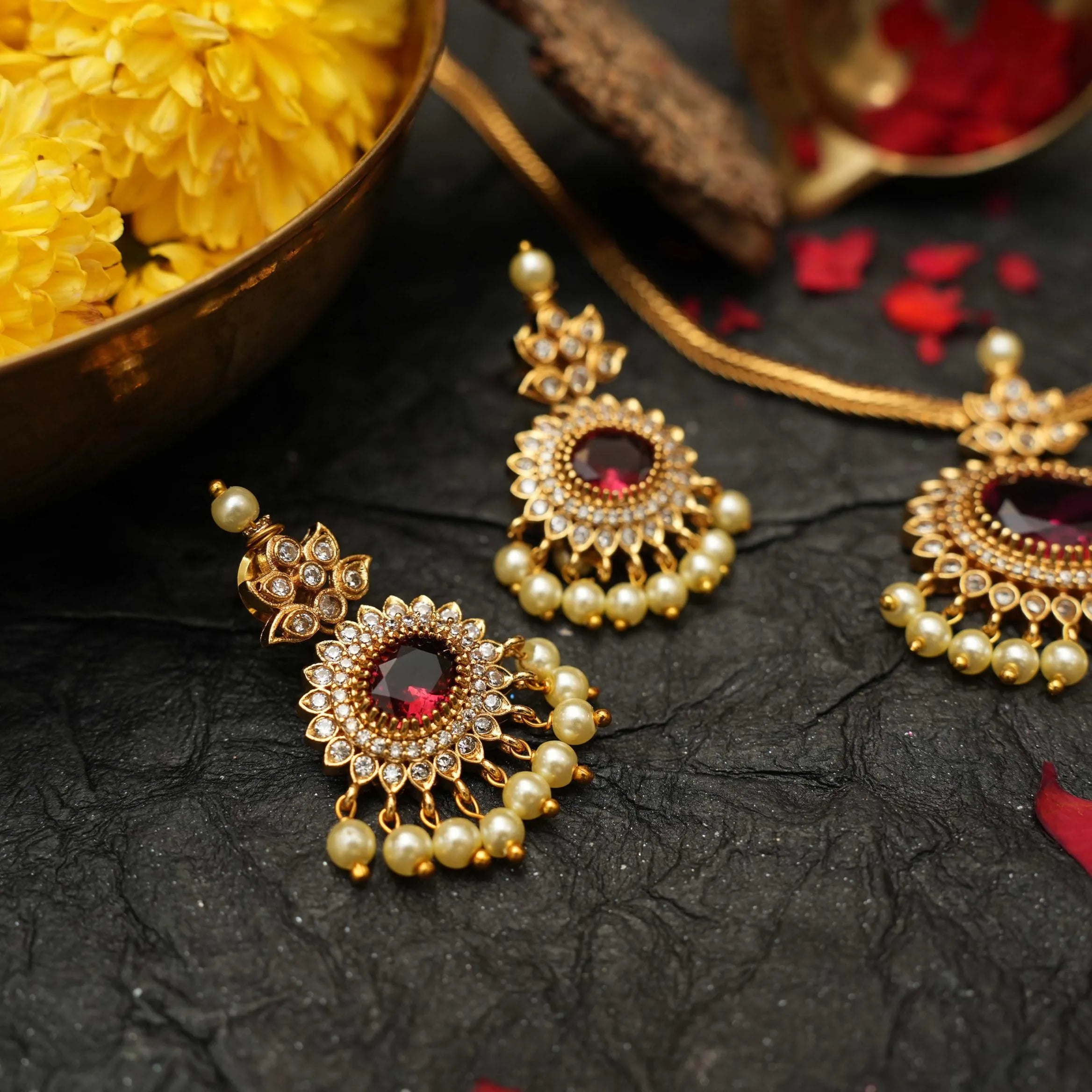 A simple & classic antique necklace paired to red agate pendant adorn with pearls. This set comes with a pair of earrings.