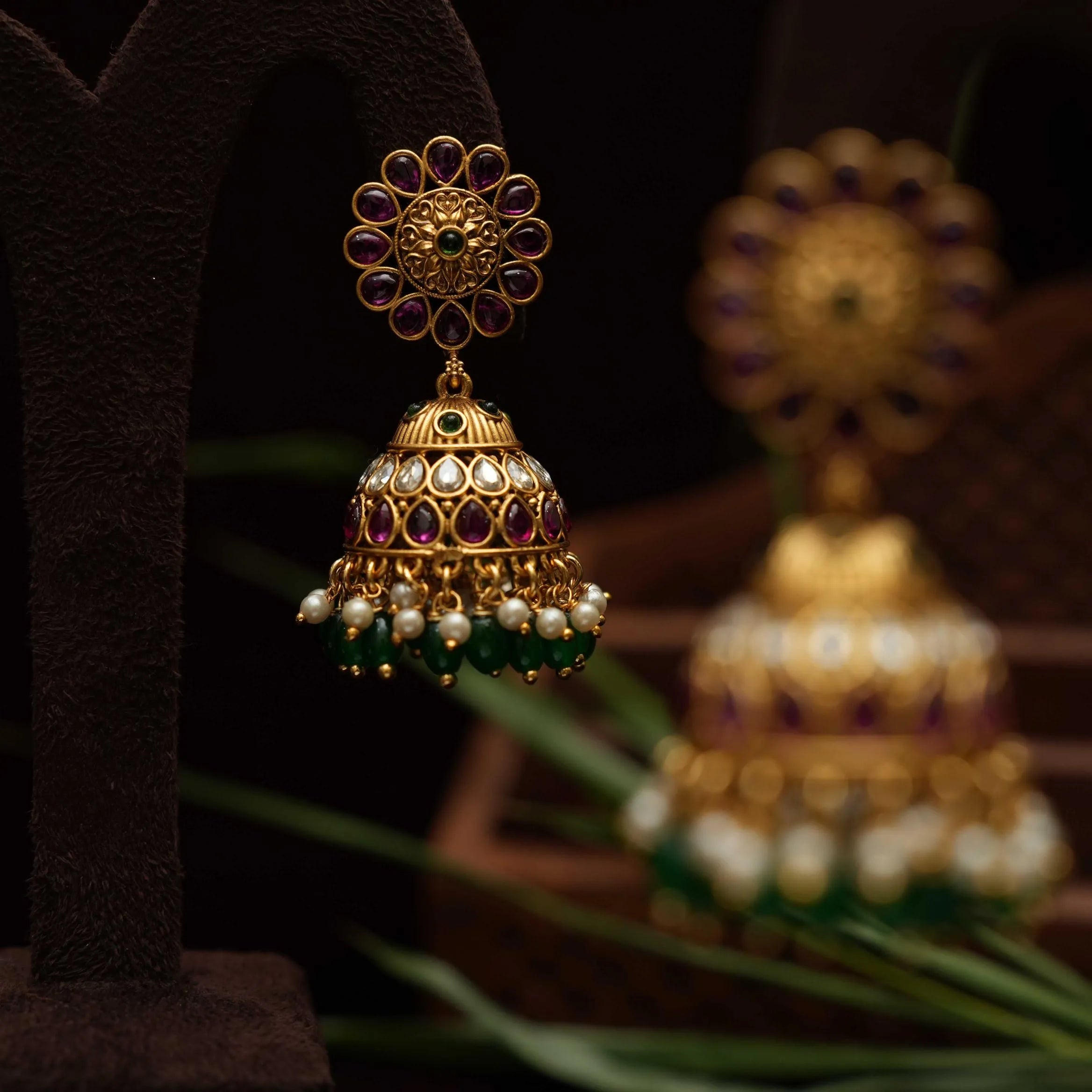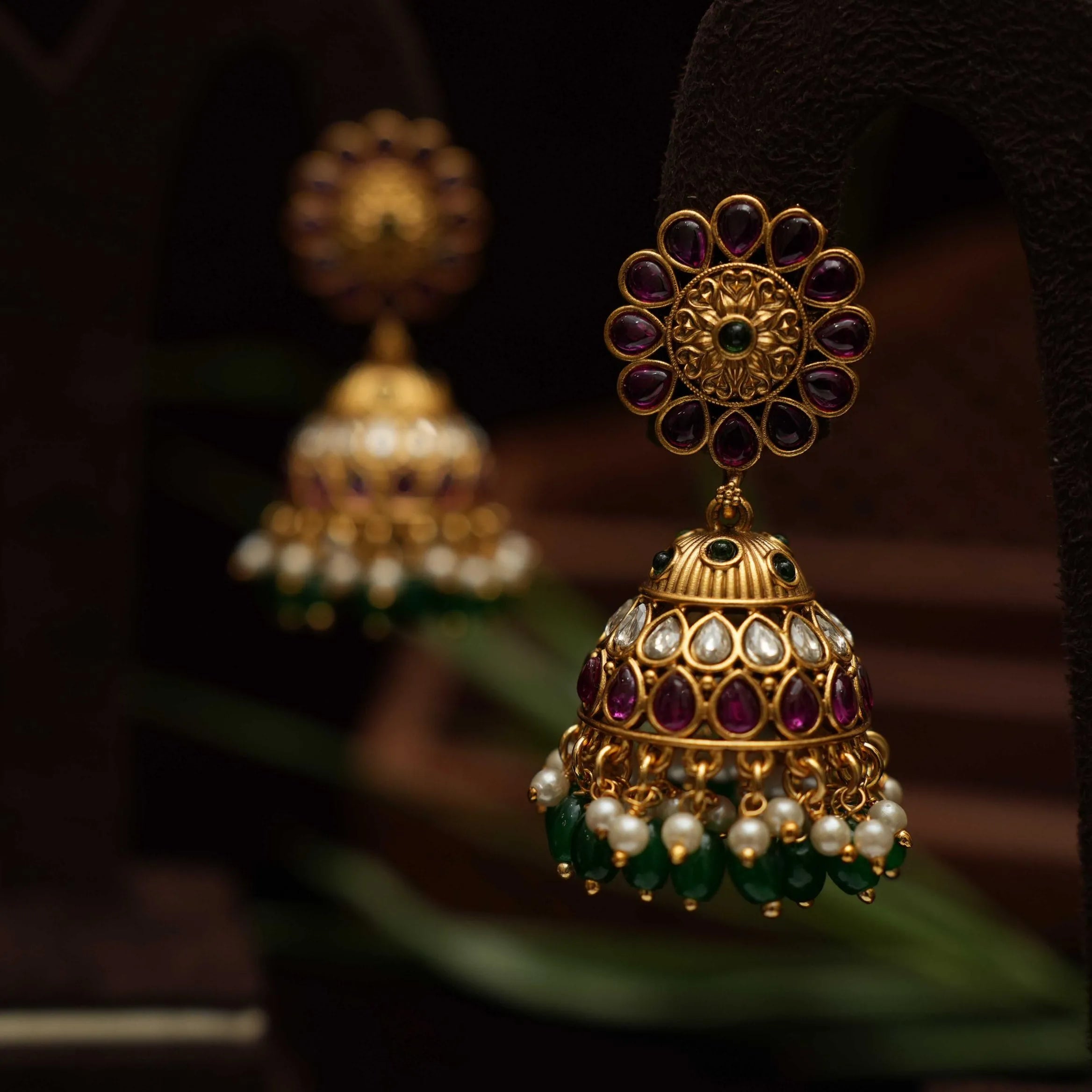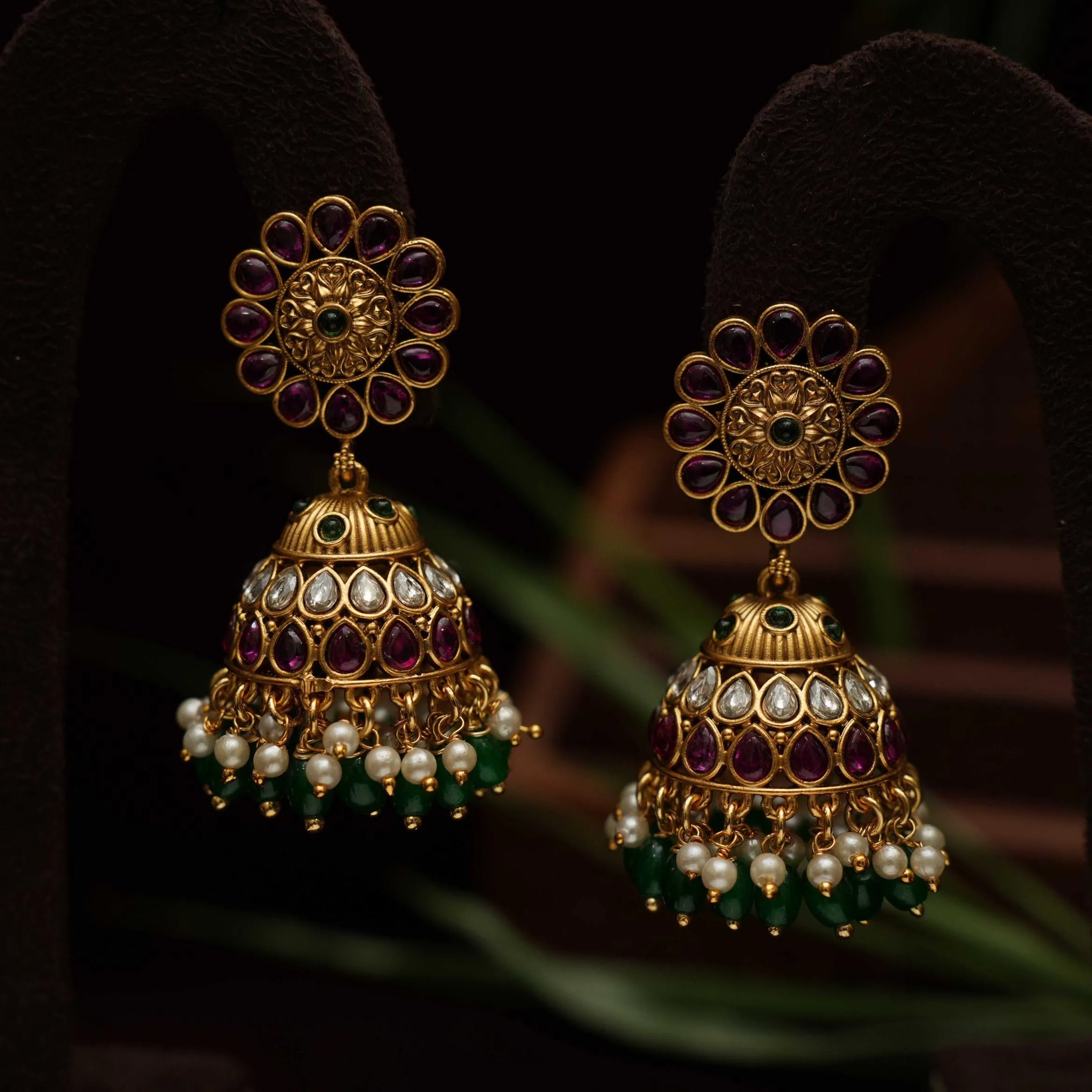 A regal antique jhumka earrings studded with kemp stones, pearls & beads.