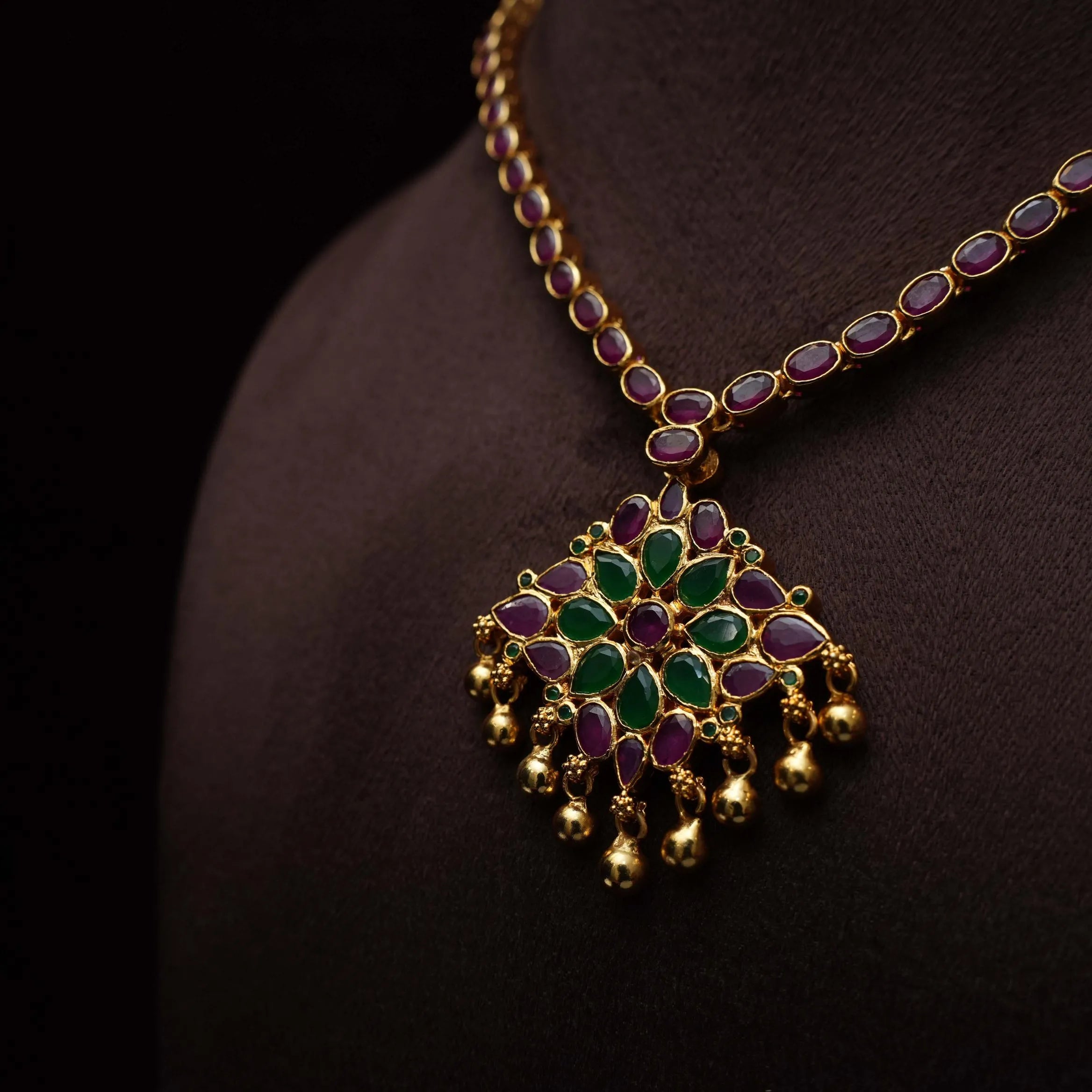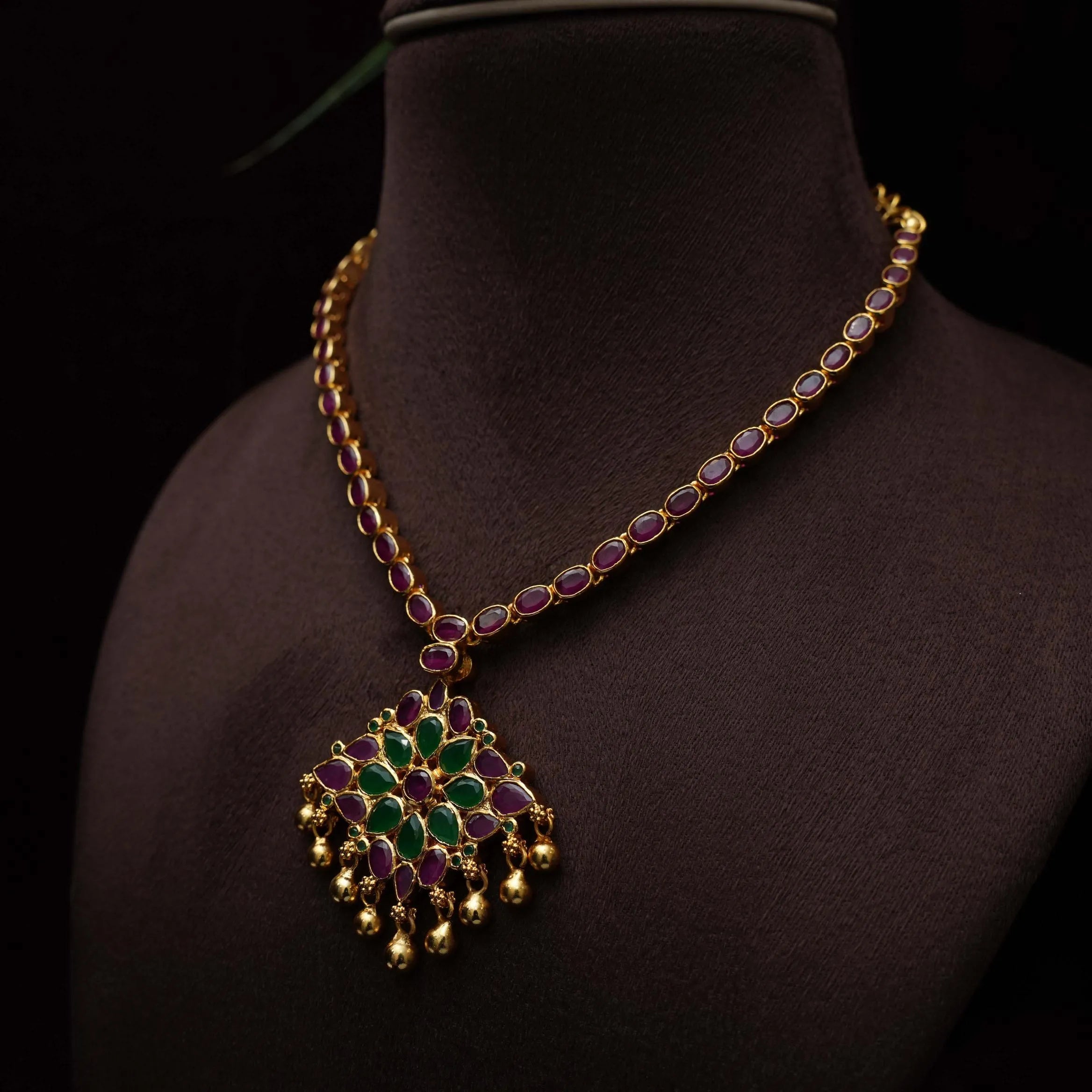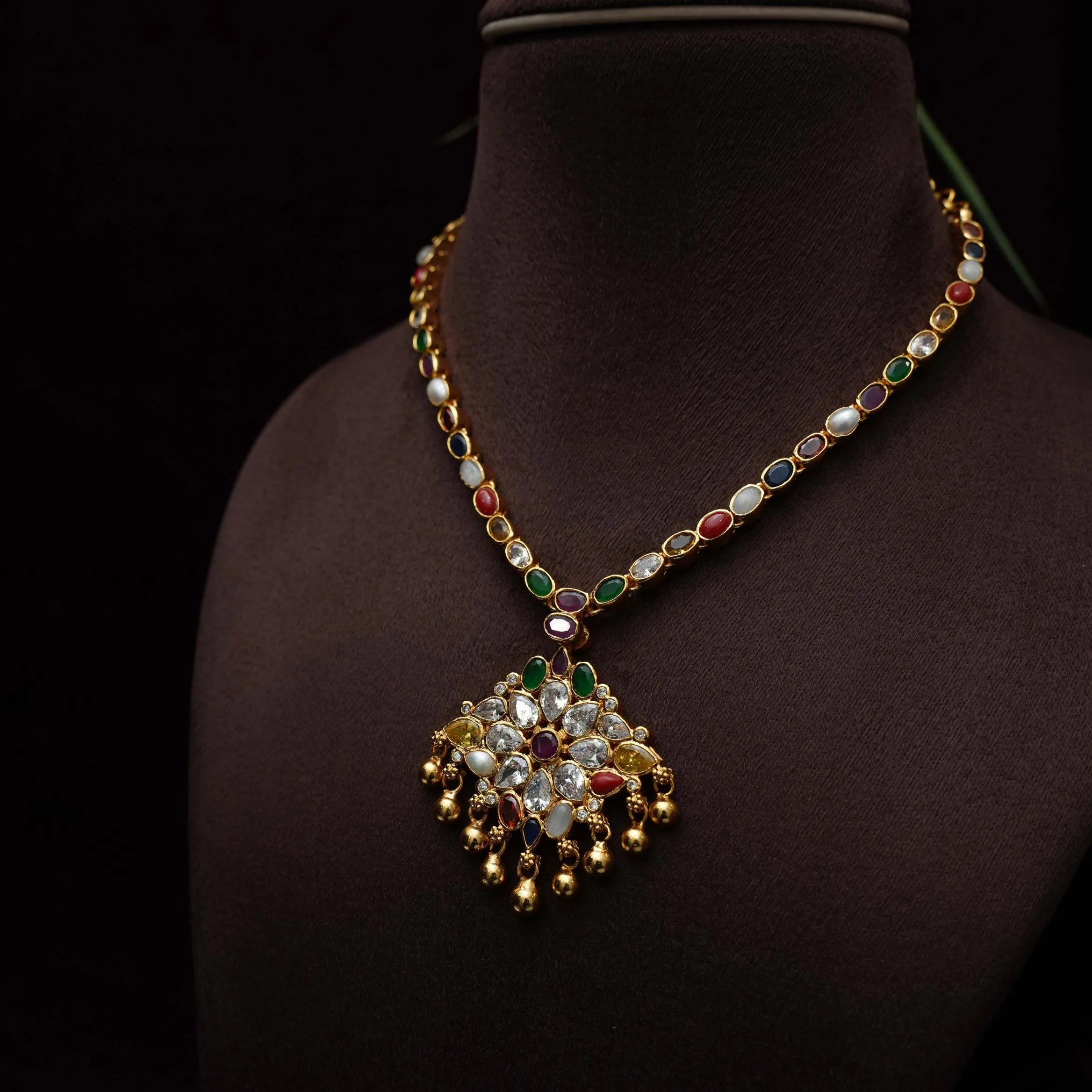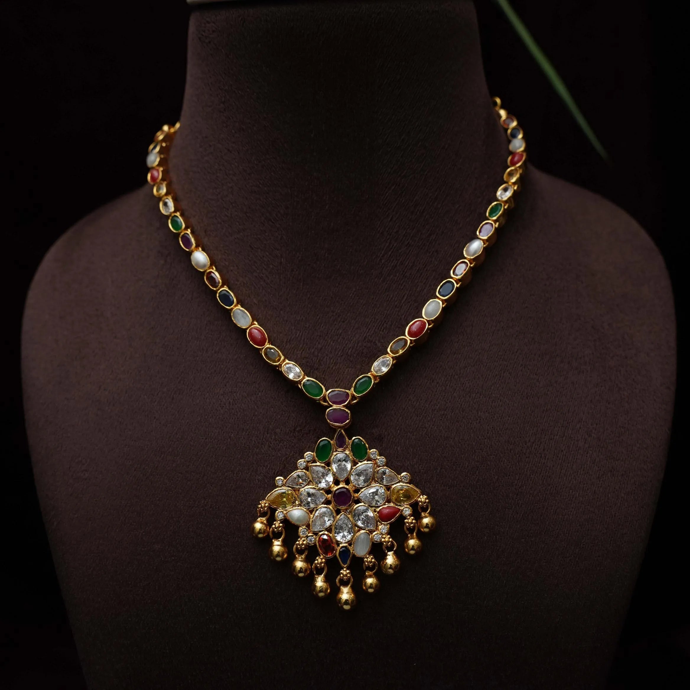 A traditional silver reversible necklace adorned with vibrant Navaratna stones on one side and rich red kemp stones on the other. This versatile piece combines traditional charm with elegant craftsmanship, making it perfect for festive and special occasions.