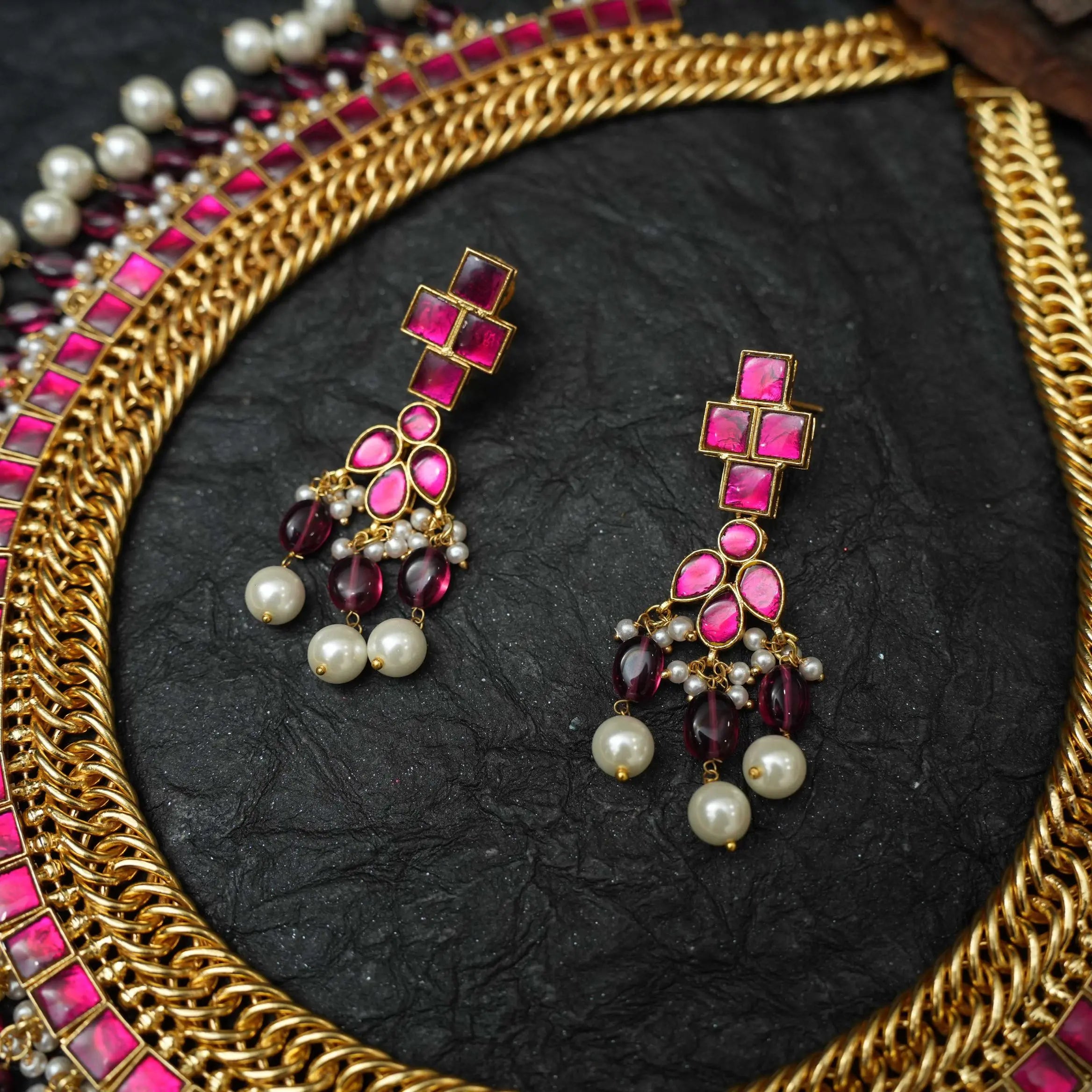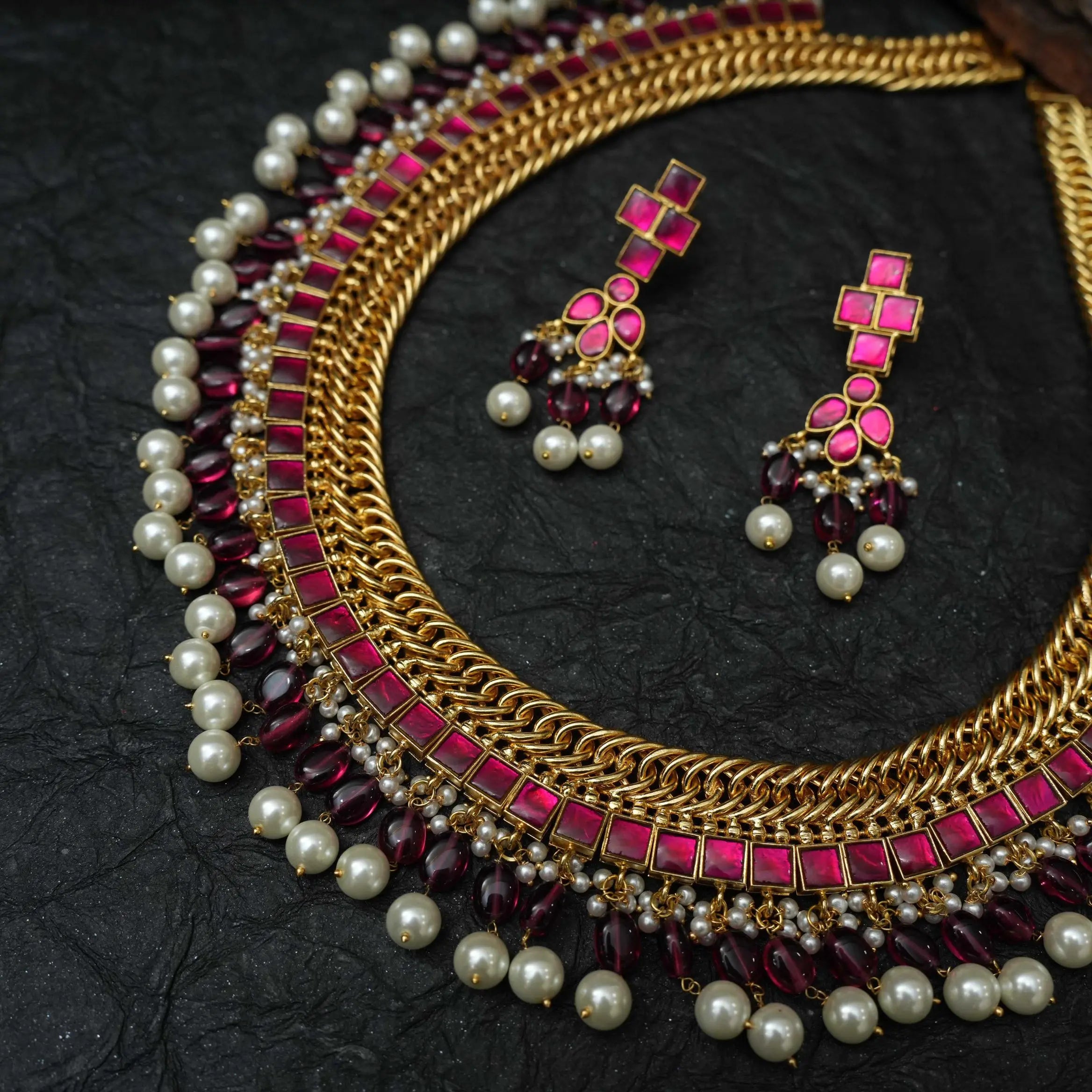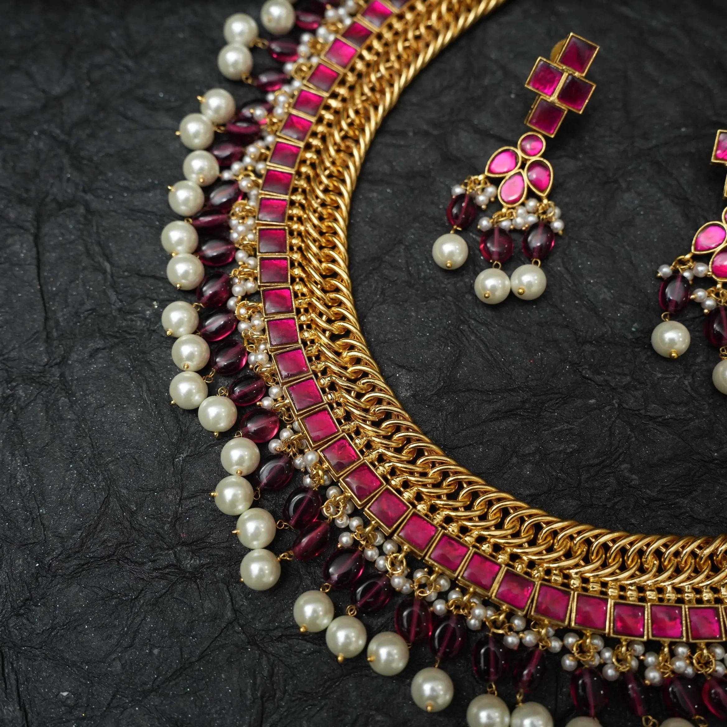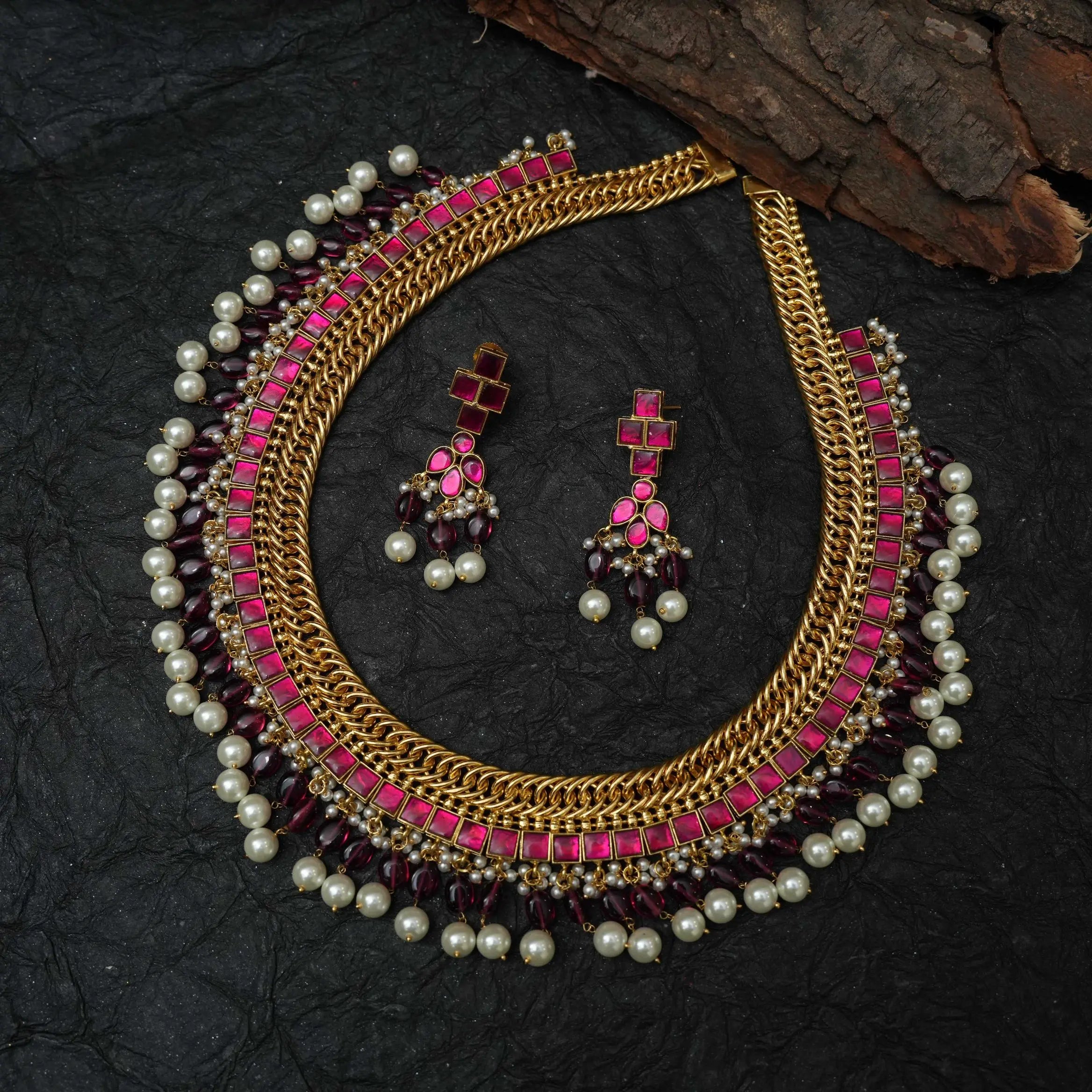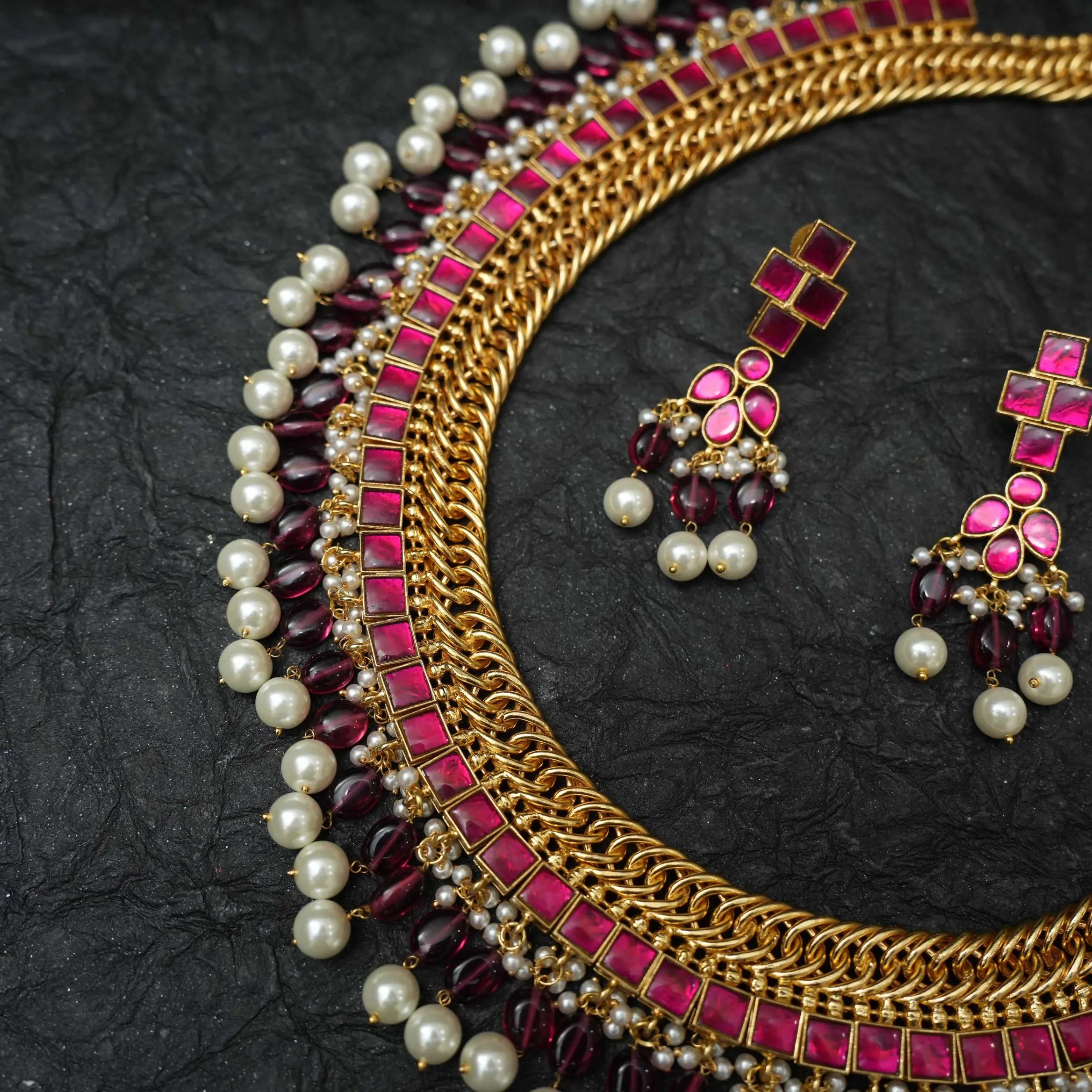 A stunning handcrafted statement necklace, intricately designed with traditional kemp stones and adorned with delicate beads and lustrous pearls. This exquisite piece effortlessly blends heritage charm with timeless elegance. The set is beautifully completed with a matching pair of earrings, making it perfect for festive occasions, weddings, or special celebrations.