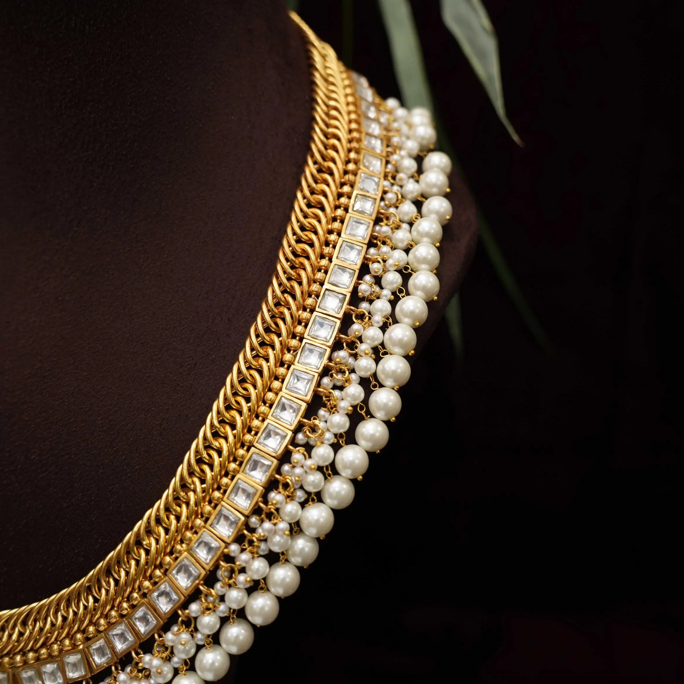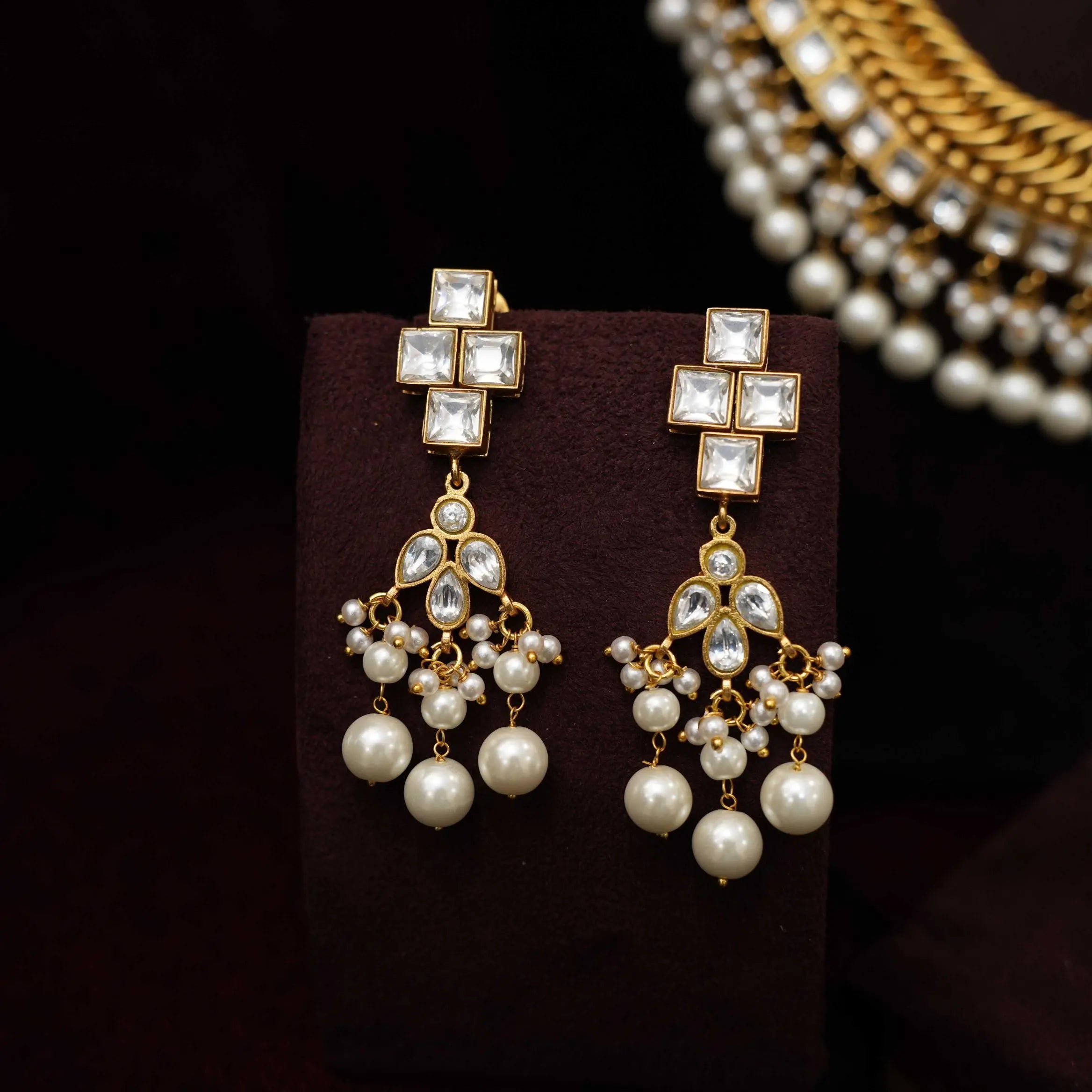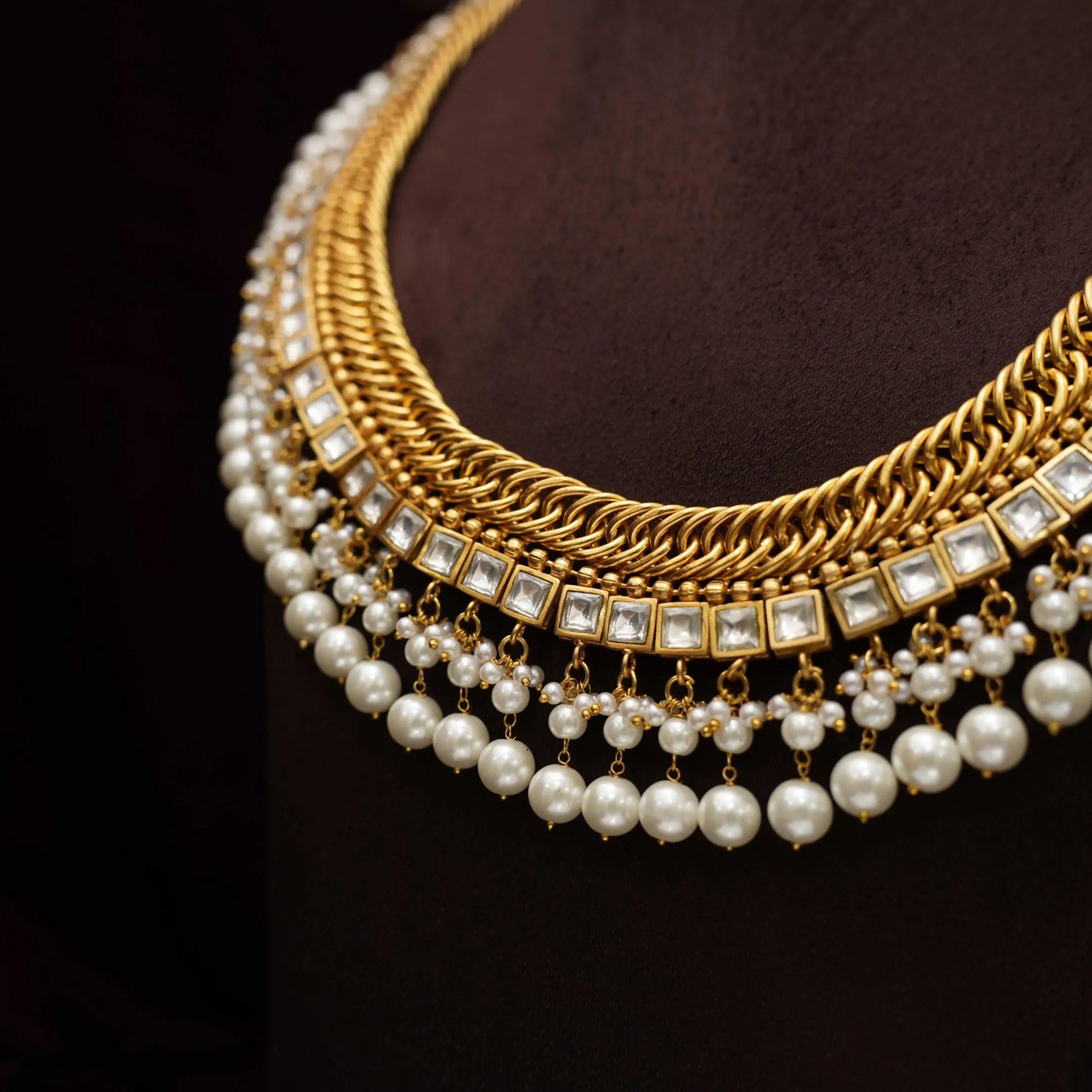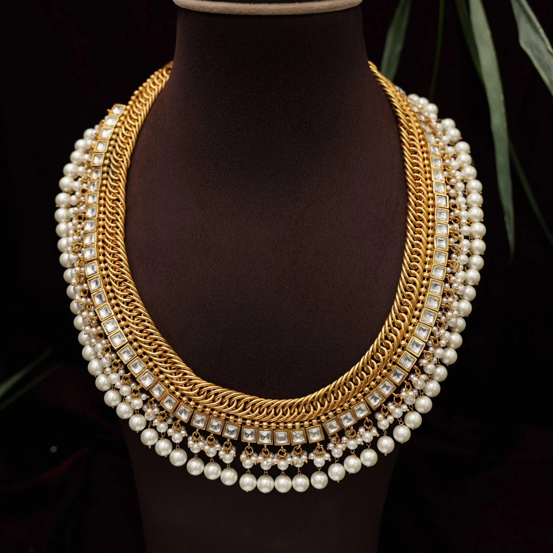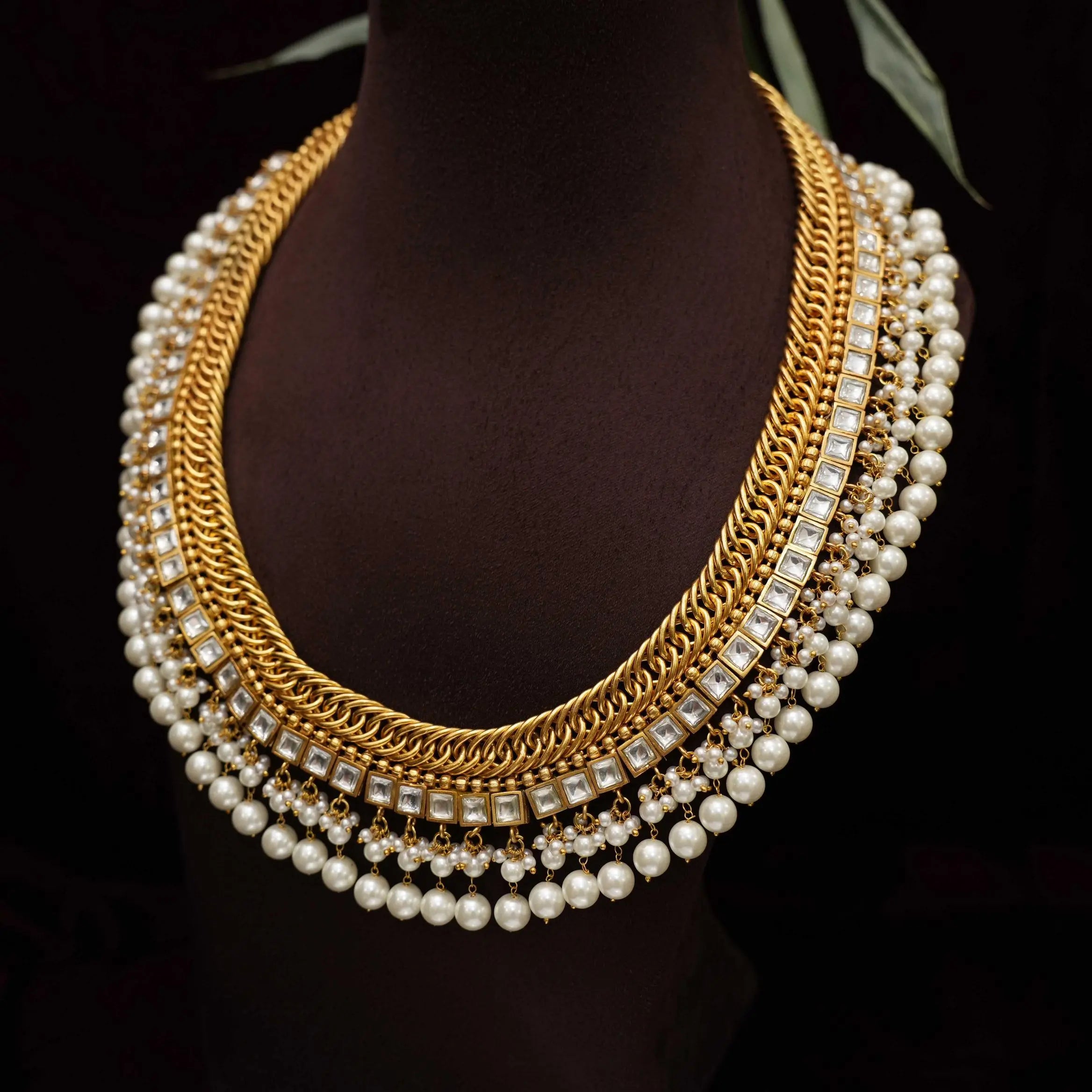 A stunning handcrafted statement necklace, intricately designed with traditional white stones and adorned with delicate beads and lustrous pearls. This exquisite piece effortlessly blends heritage charm with timeless elegance. The set is beautifully completed with a matching pair of earrings, making it perfect for festive occasions, weddings, or special celebrations.