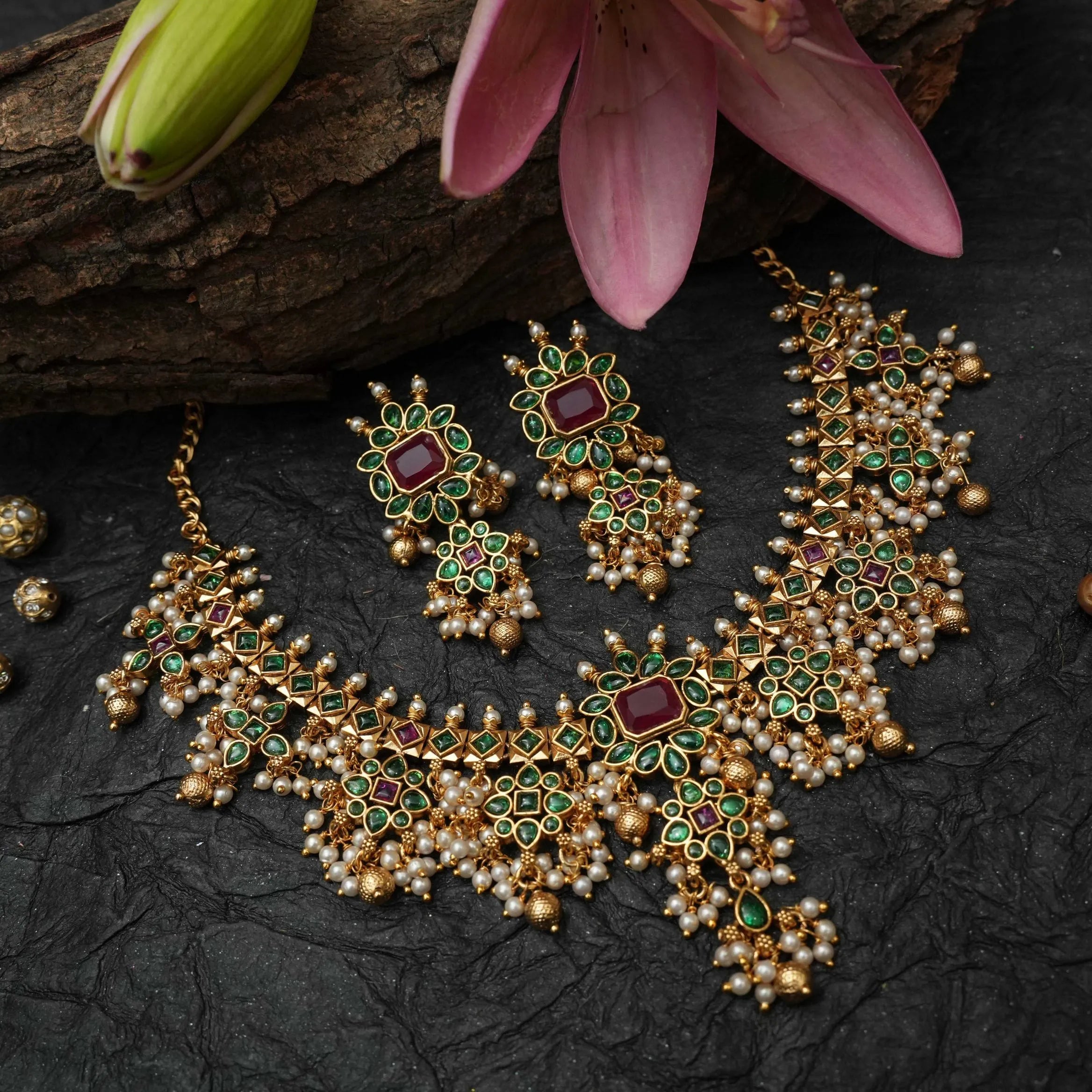 A traditional statement antique necklace studded with kemp stones adorned by fresh water pearls.