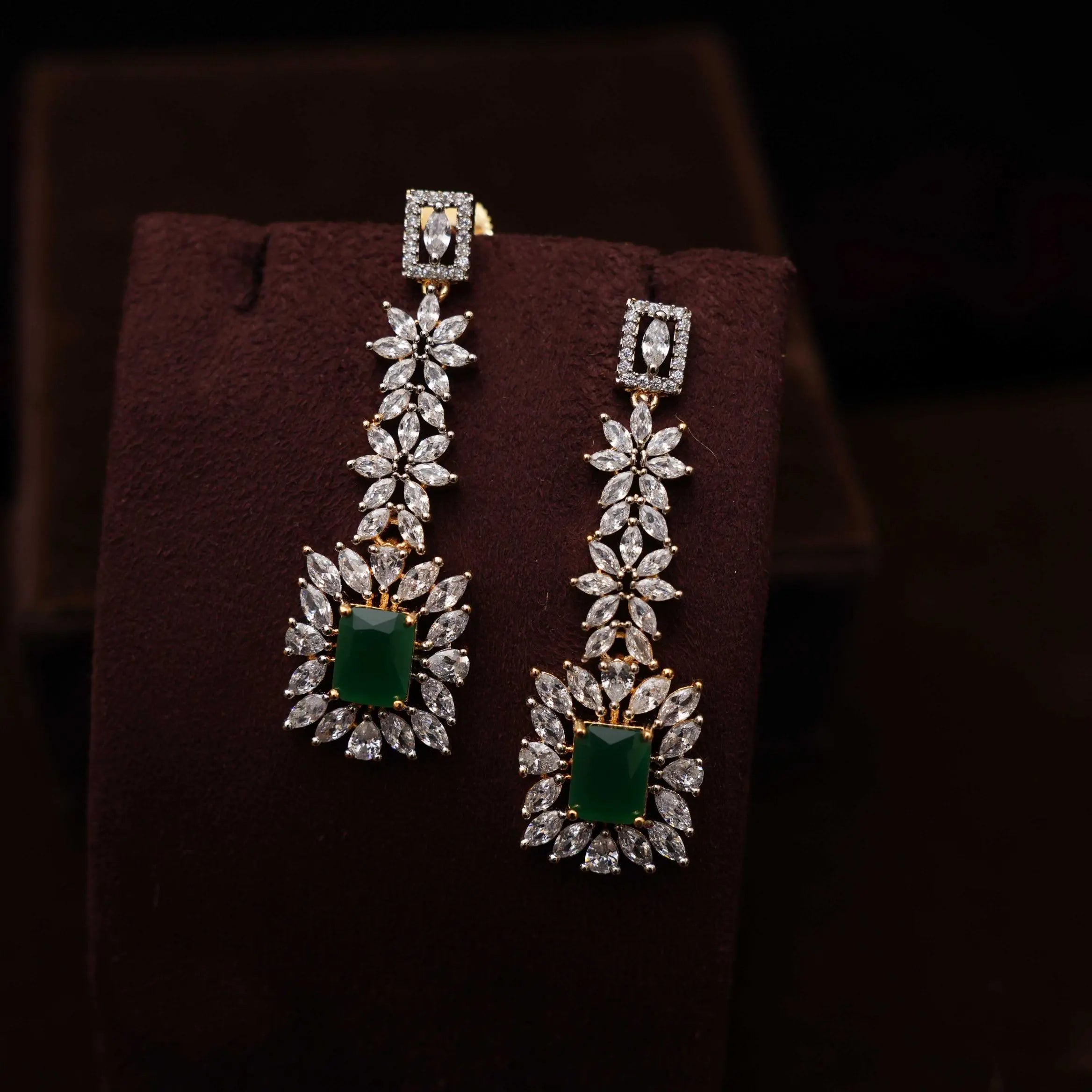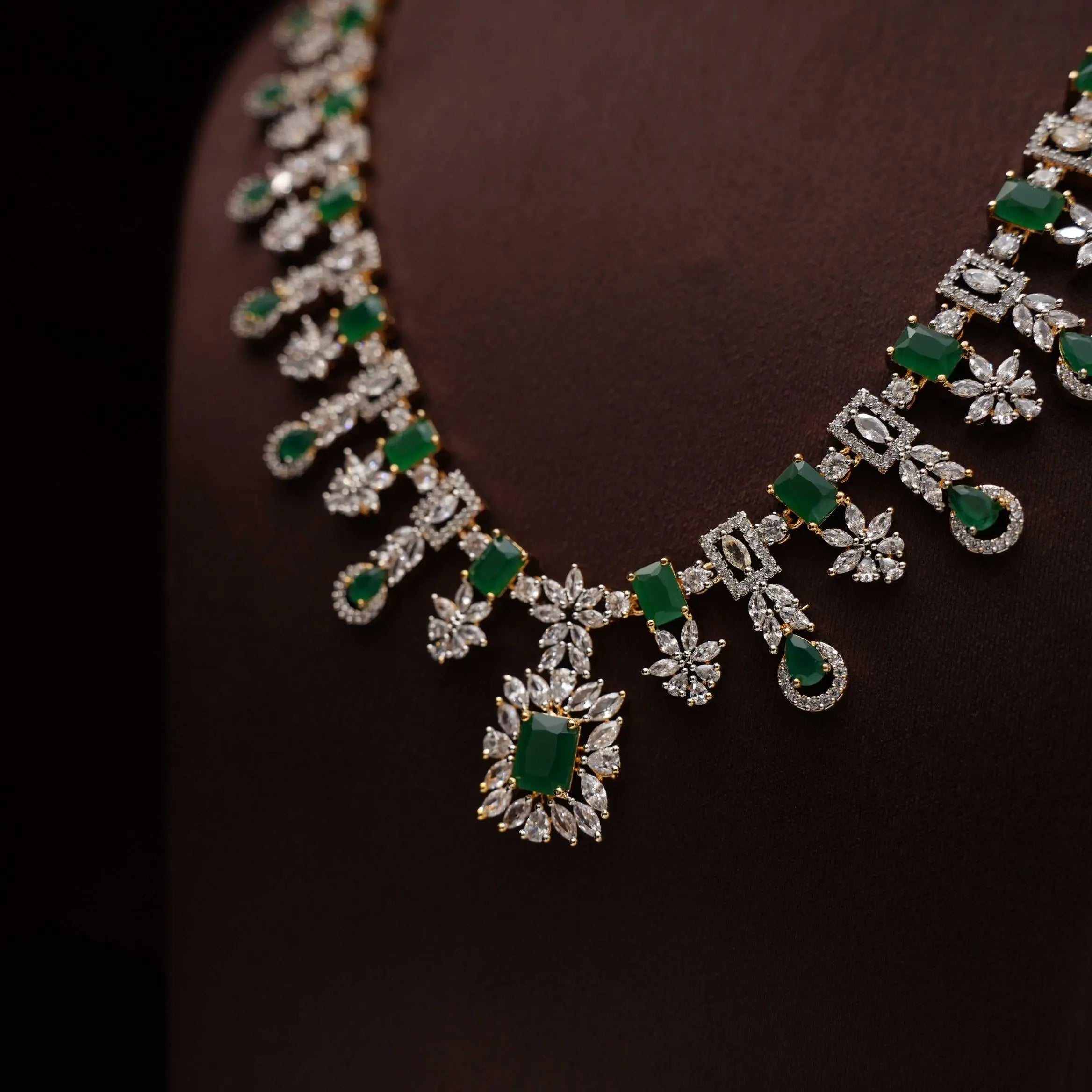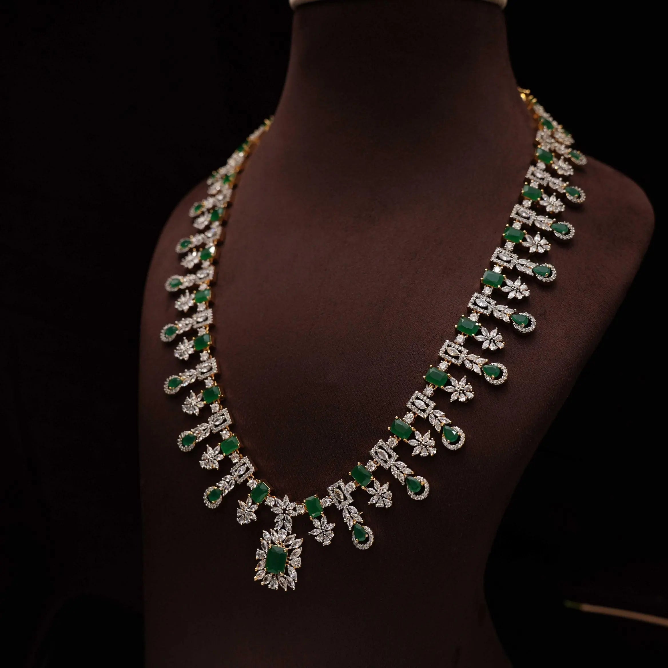 A long beautiful designer necklace handcrafted in zircon stones and green agates. This set comes with a pair of earrings.