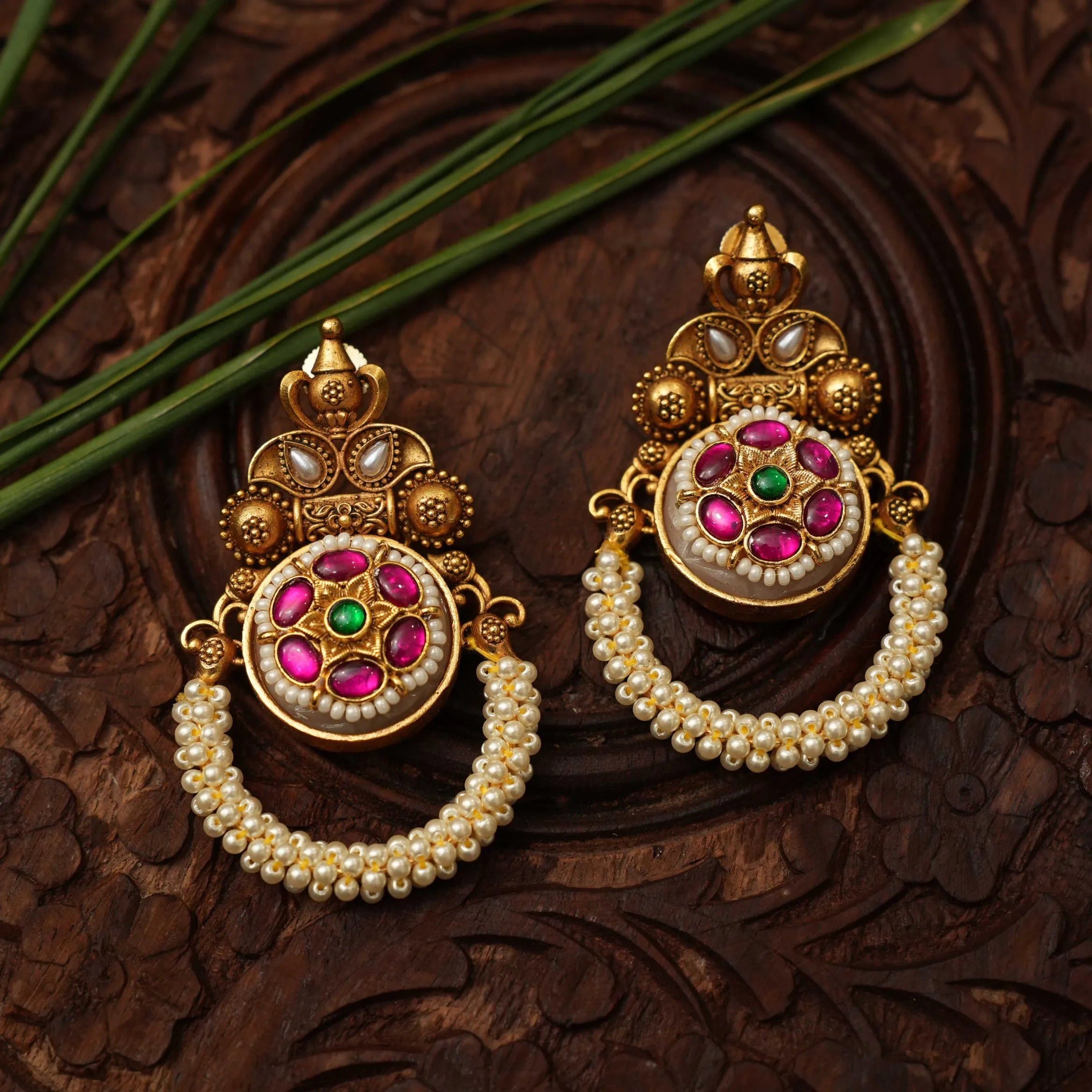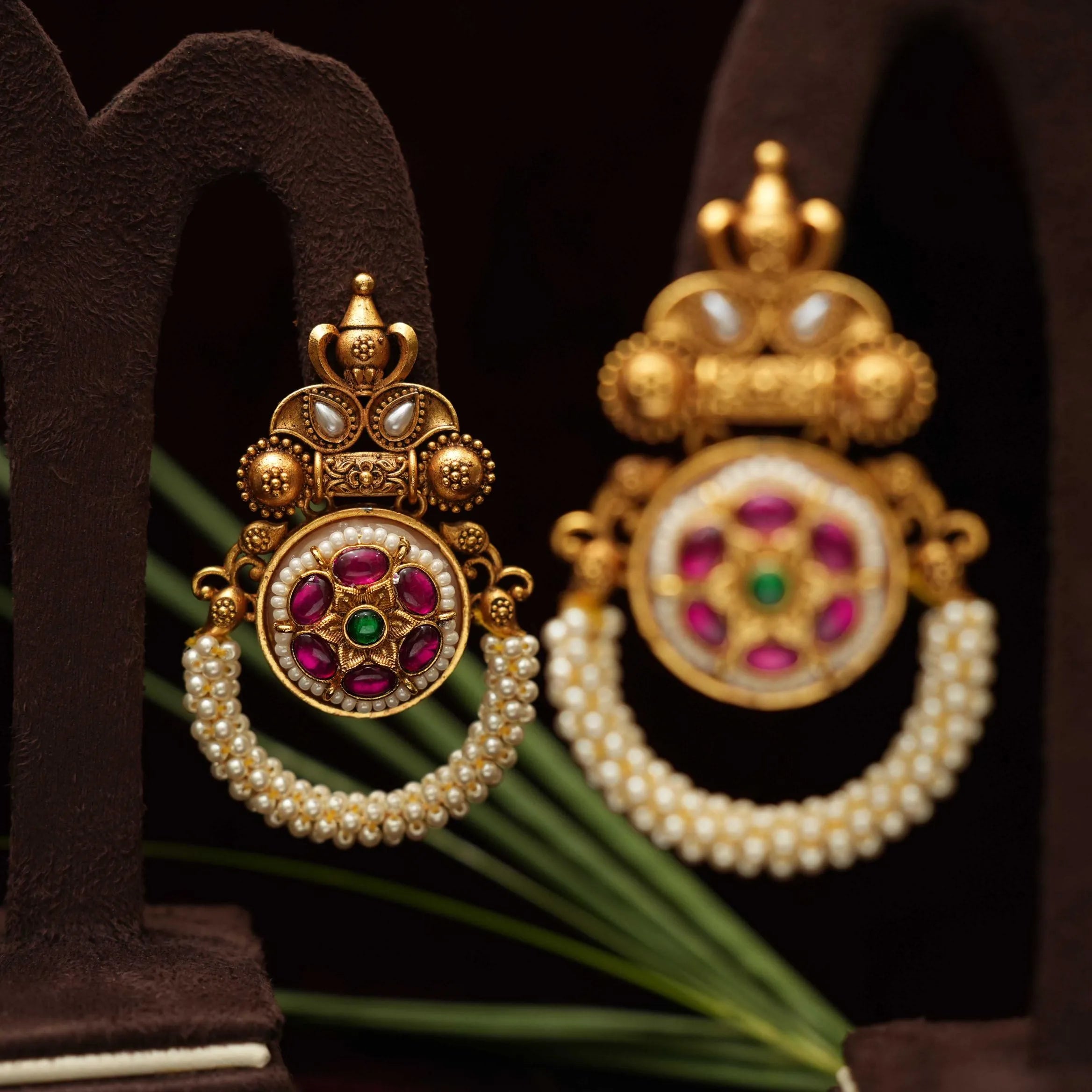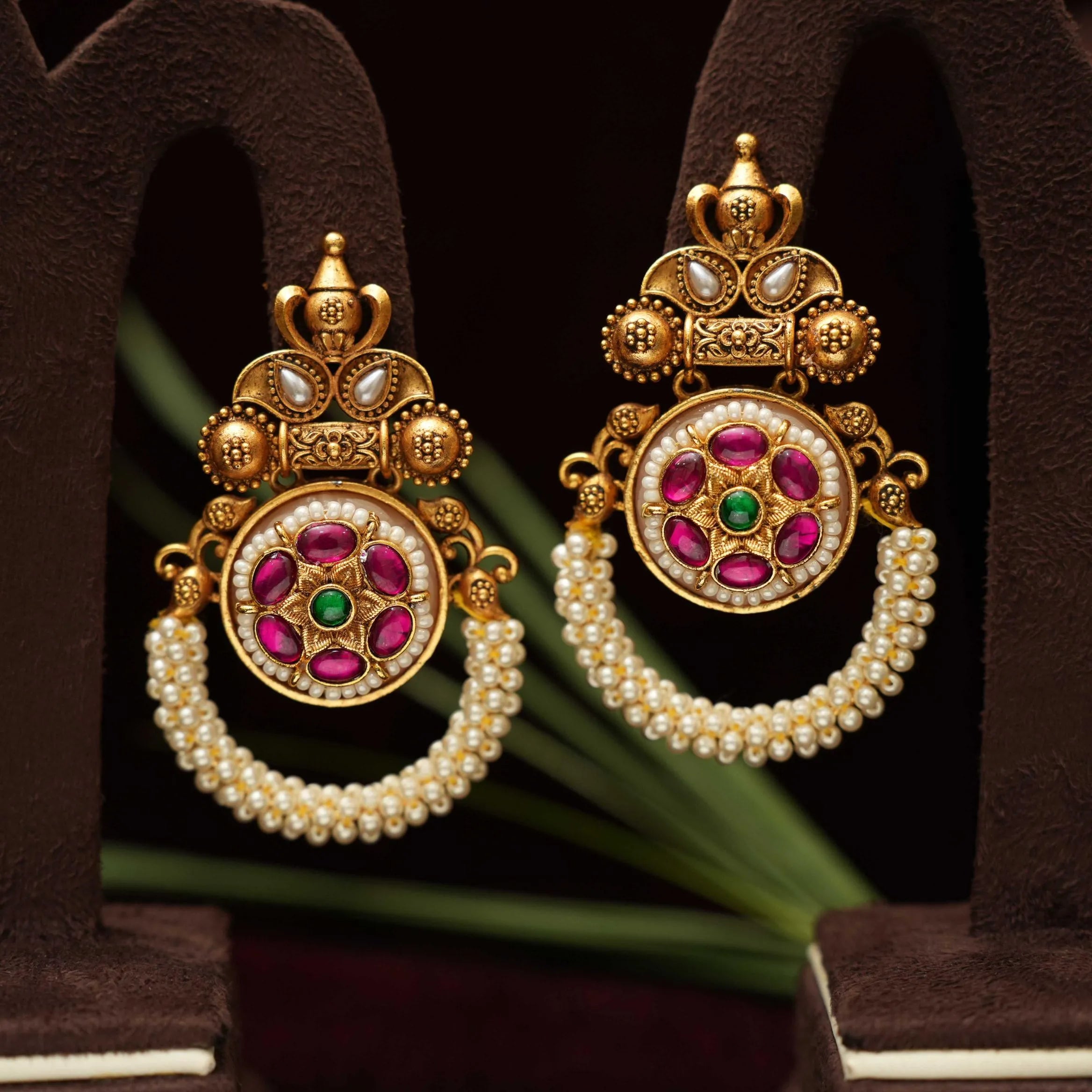 A beautiful chandbali antique earrings adorn with pearls and kemp stones.