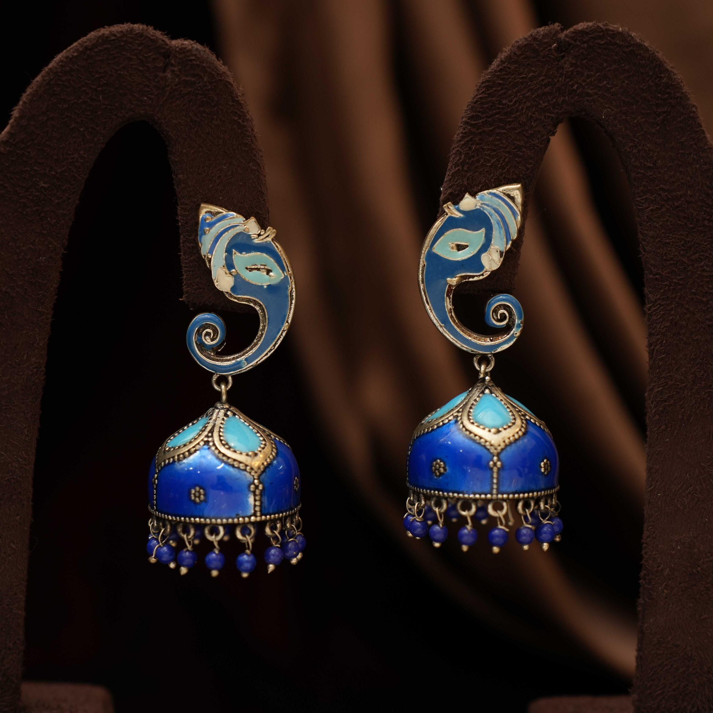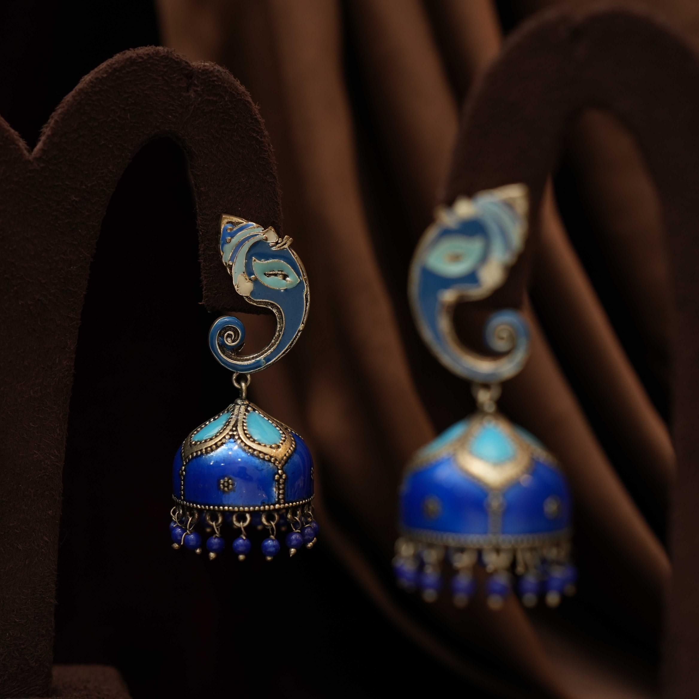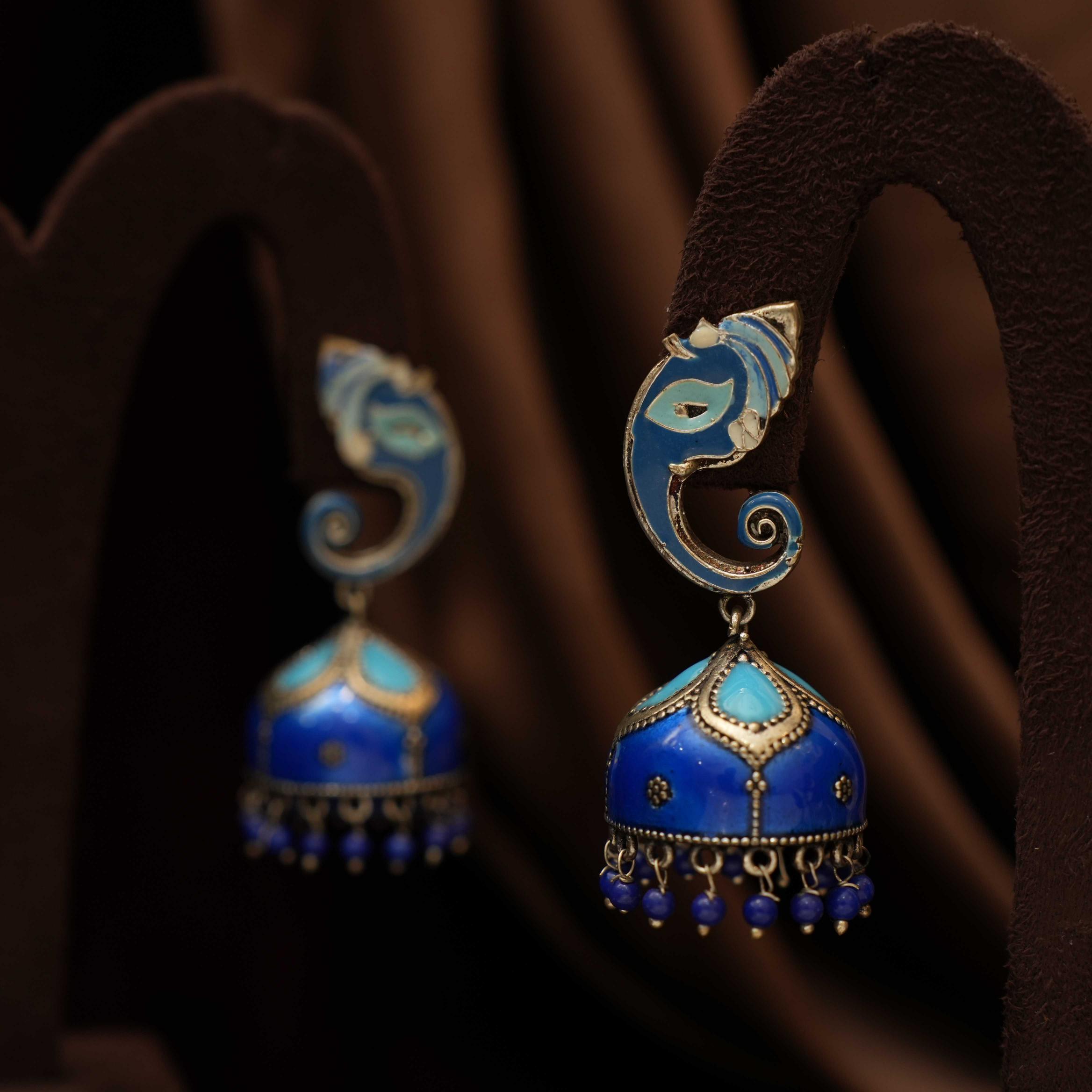 A statement jhumka earrings in Ganesha motif adorn with blue beads.