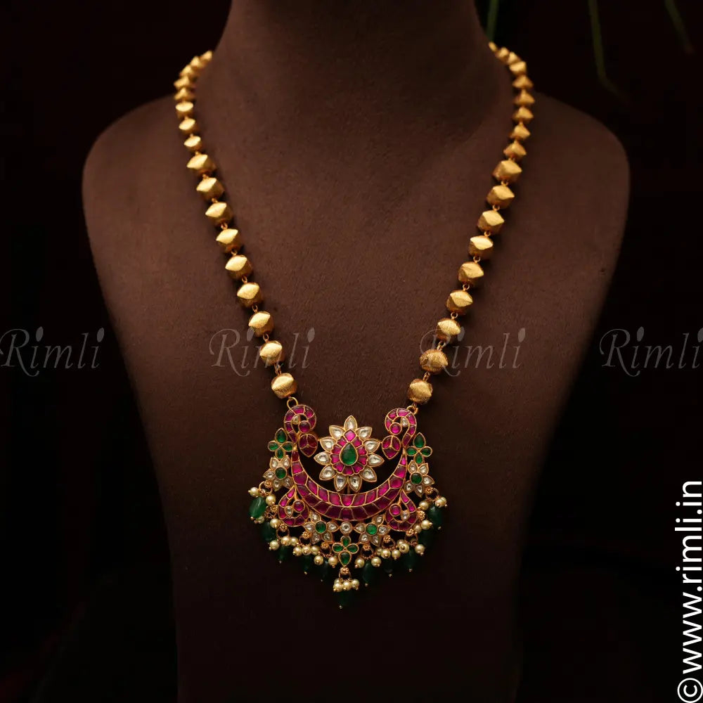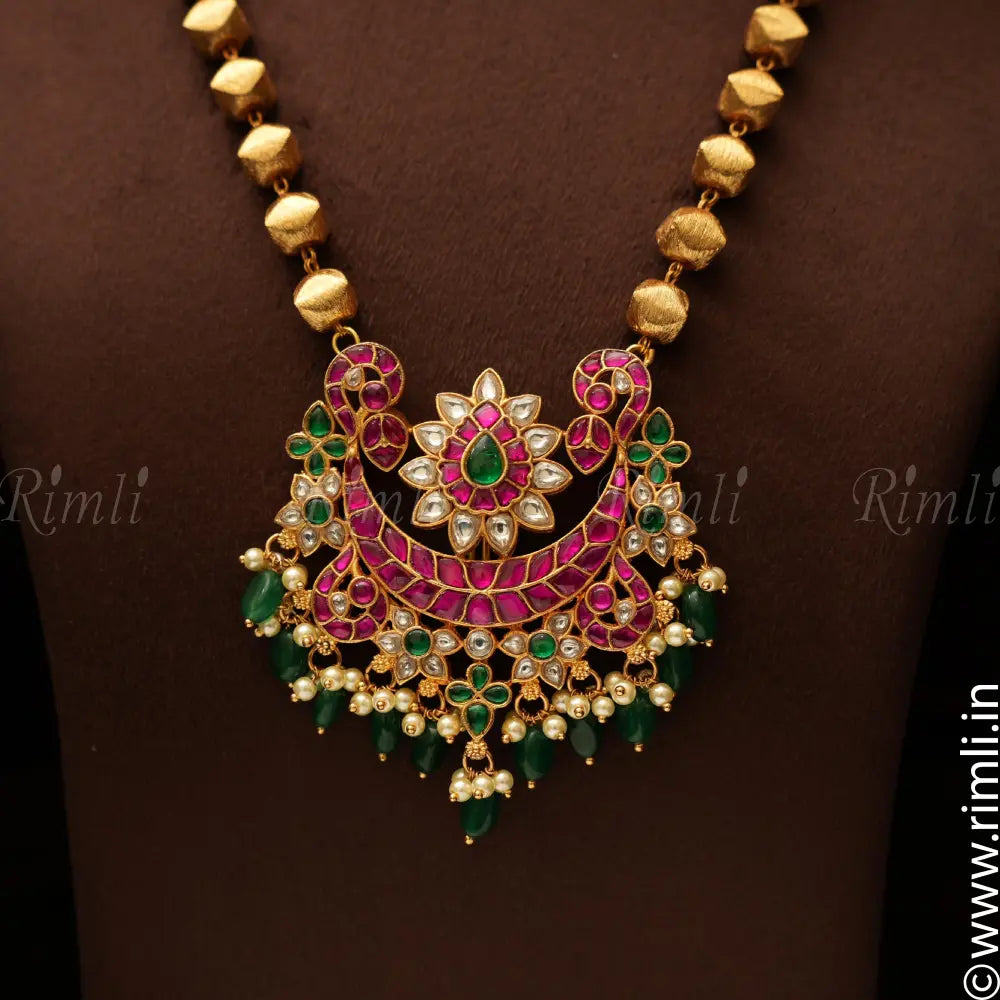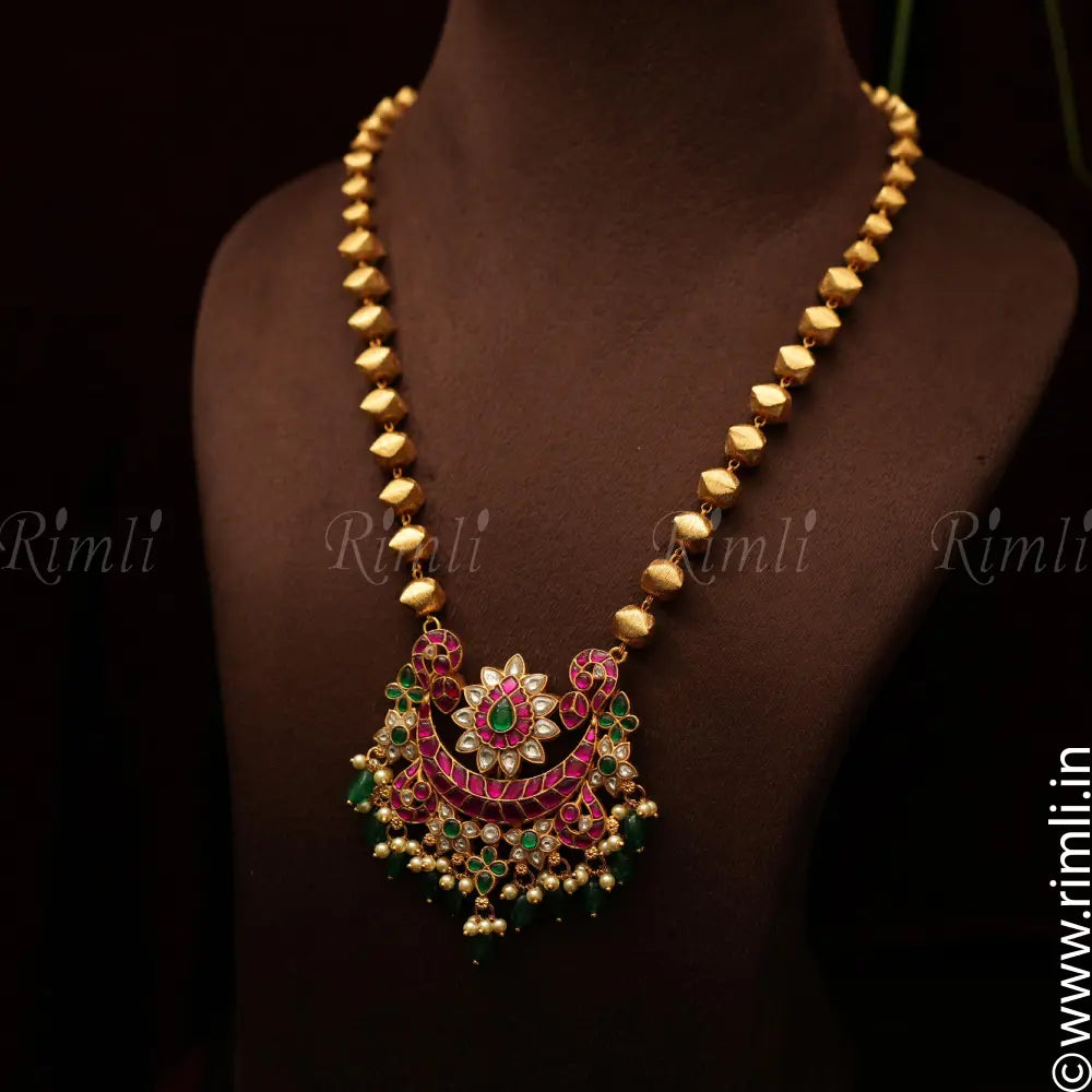 A beautiful necklace handcrafted in golden balls paired to chand polki pendant highlighted by beads & pearls.