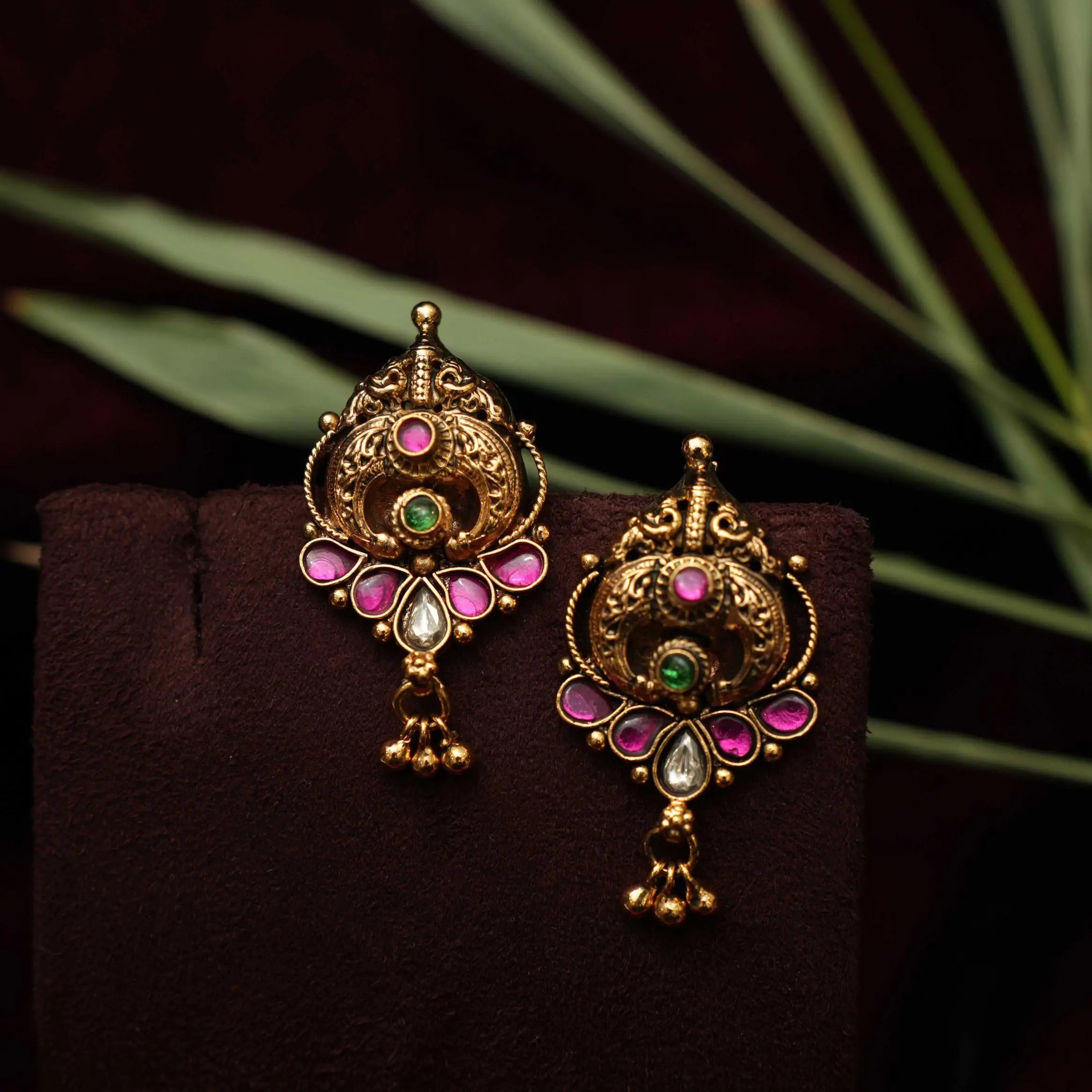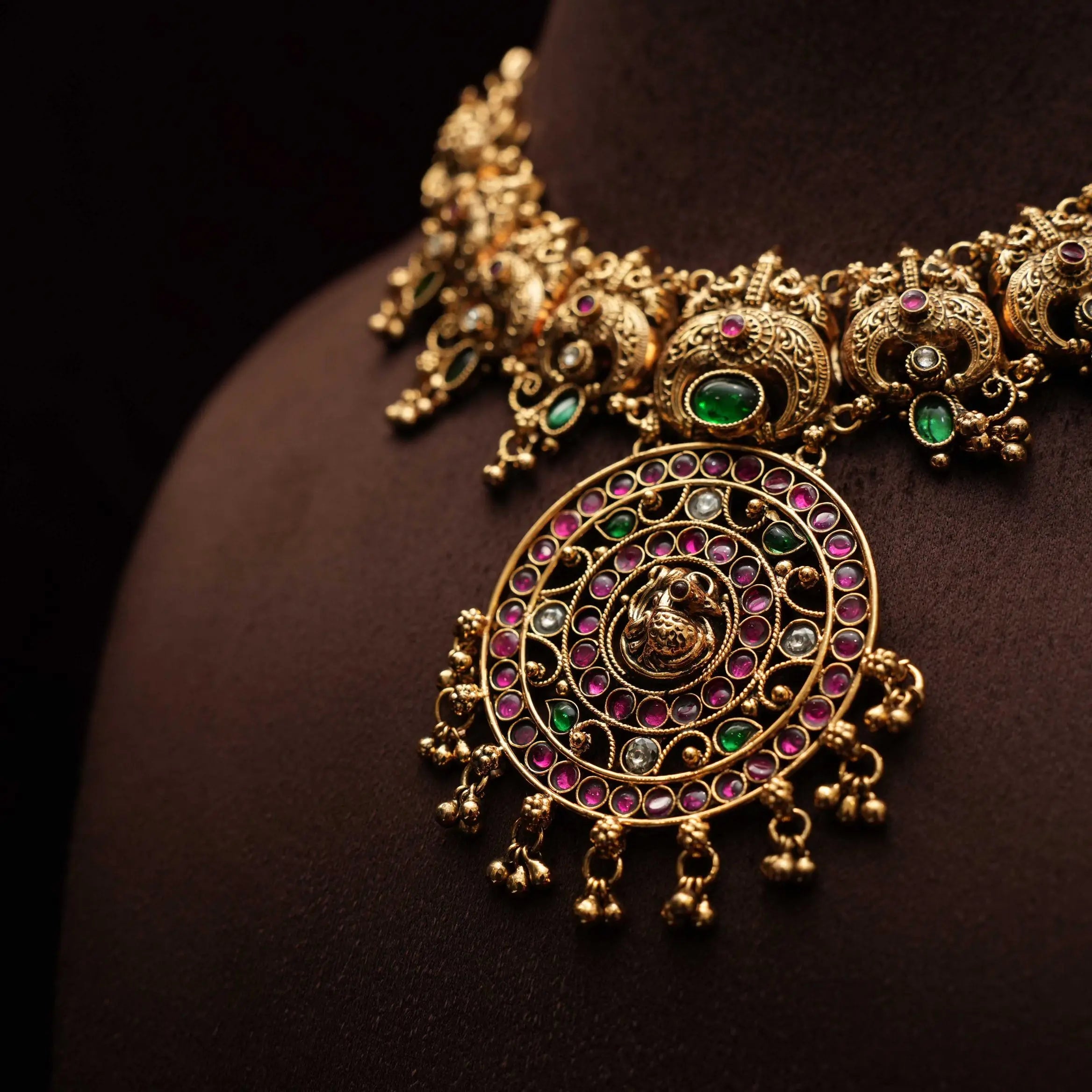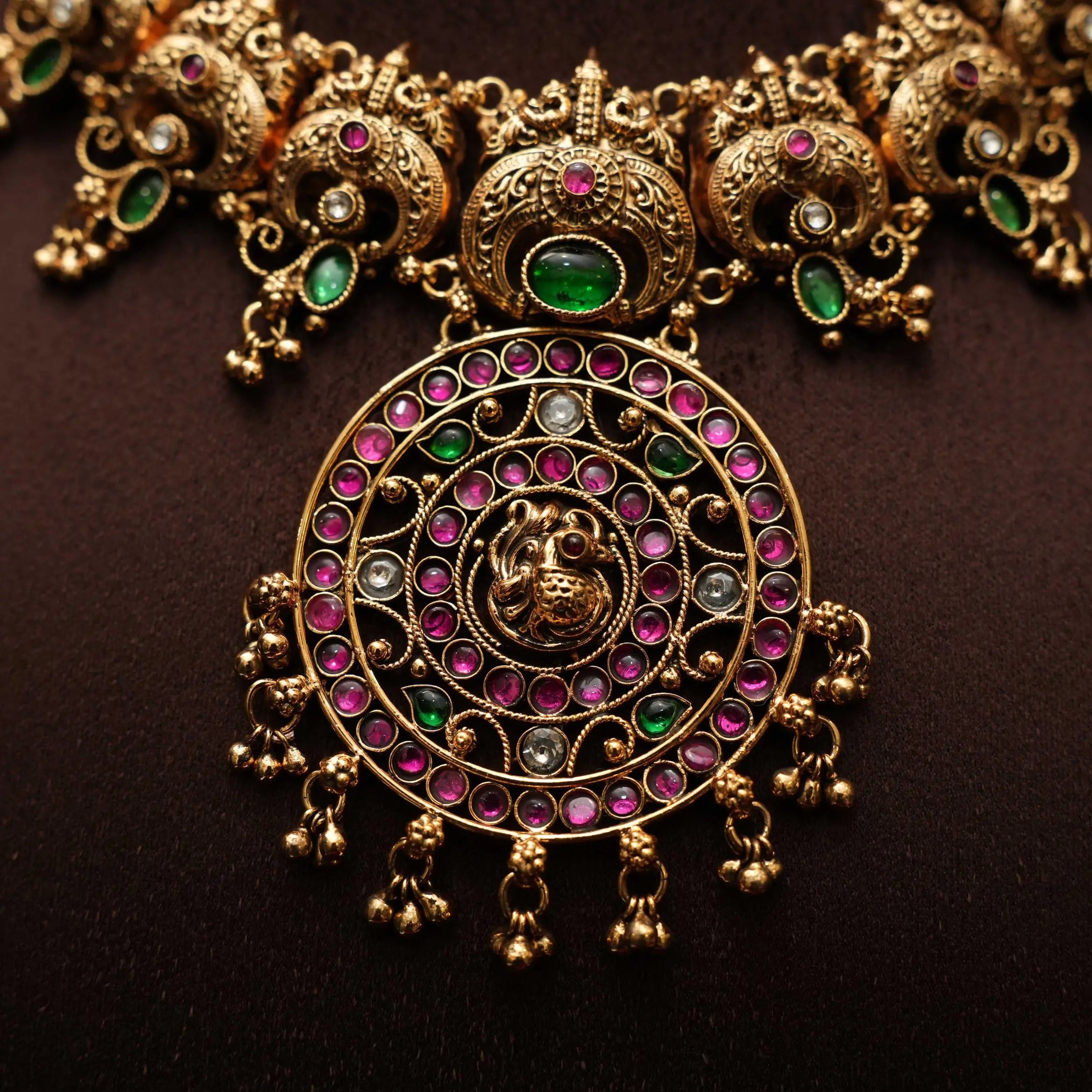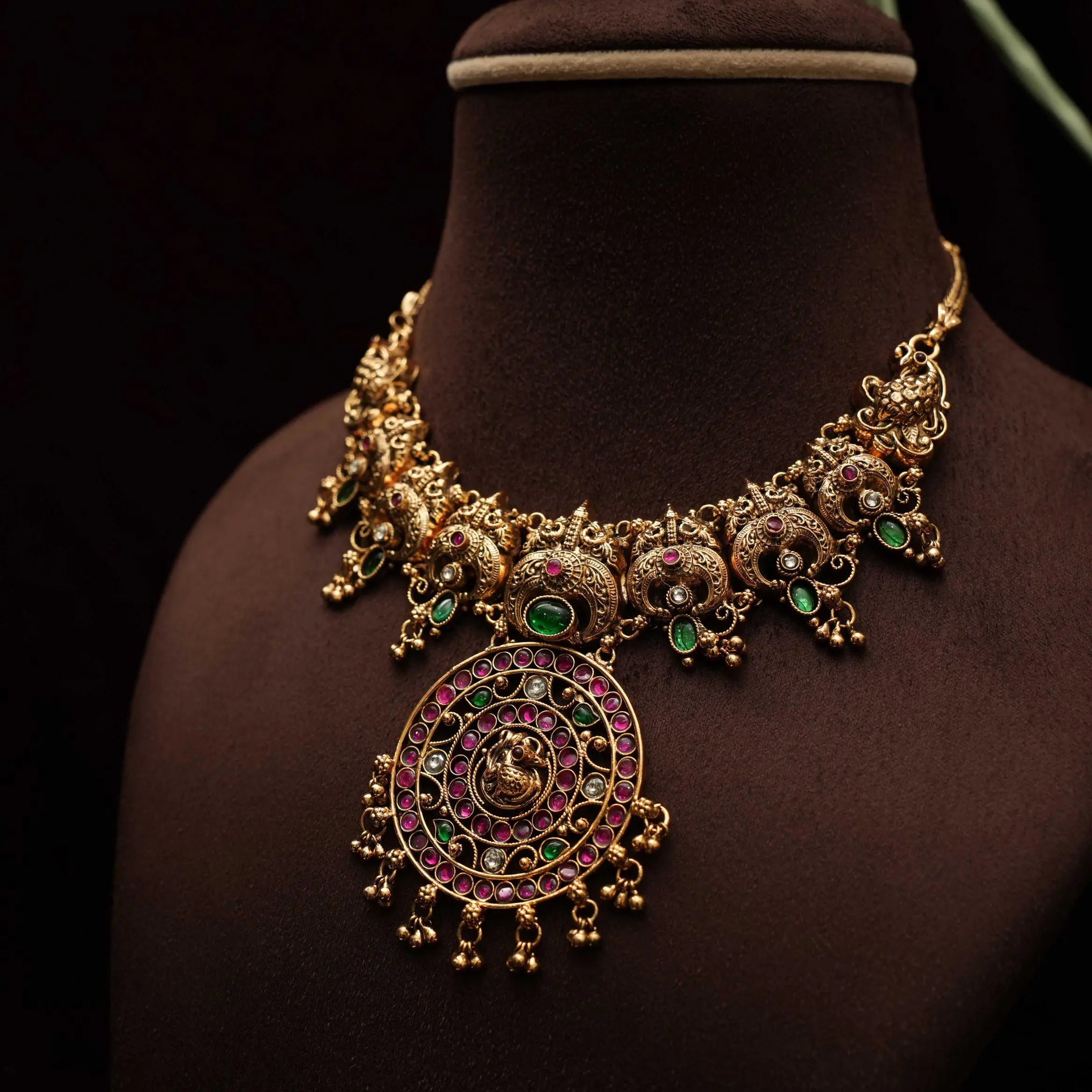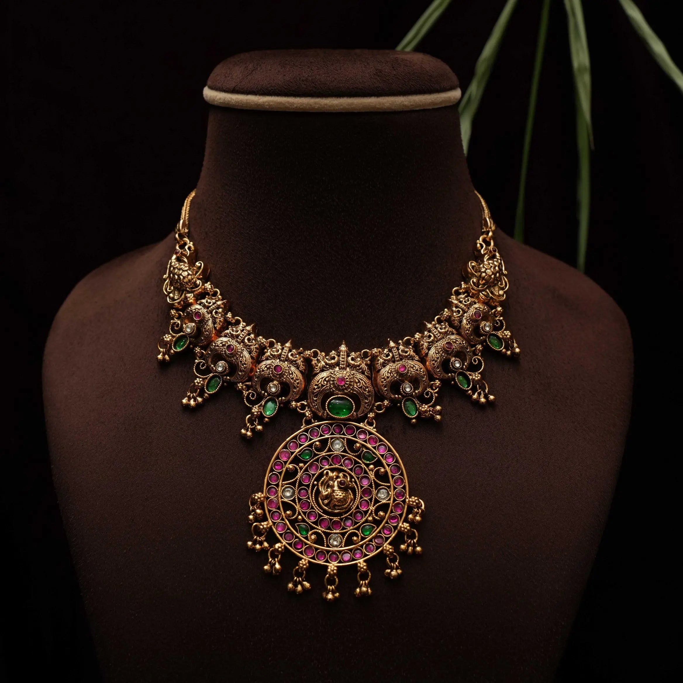 A stunning statement antique necklace, expertly handcrafted in a blend of peacock and contemporary designs. Embellished with vibrant Kemp stones and adorned with golden ball accents, the piece is gracefully finished in traditional Nagas style. This elegant set is complemented by a matching pair of earrings, perfect for enhancing any ethnic ensemble.