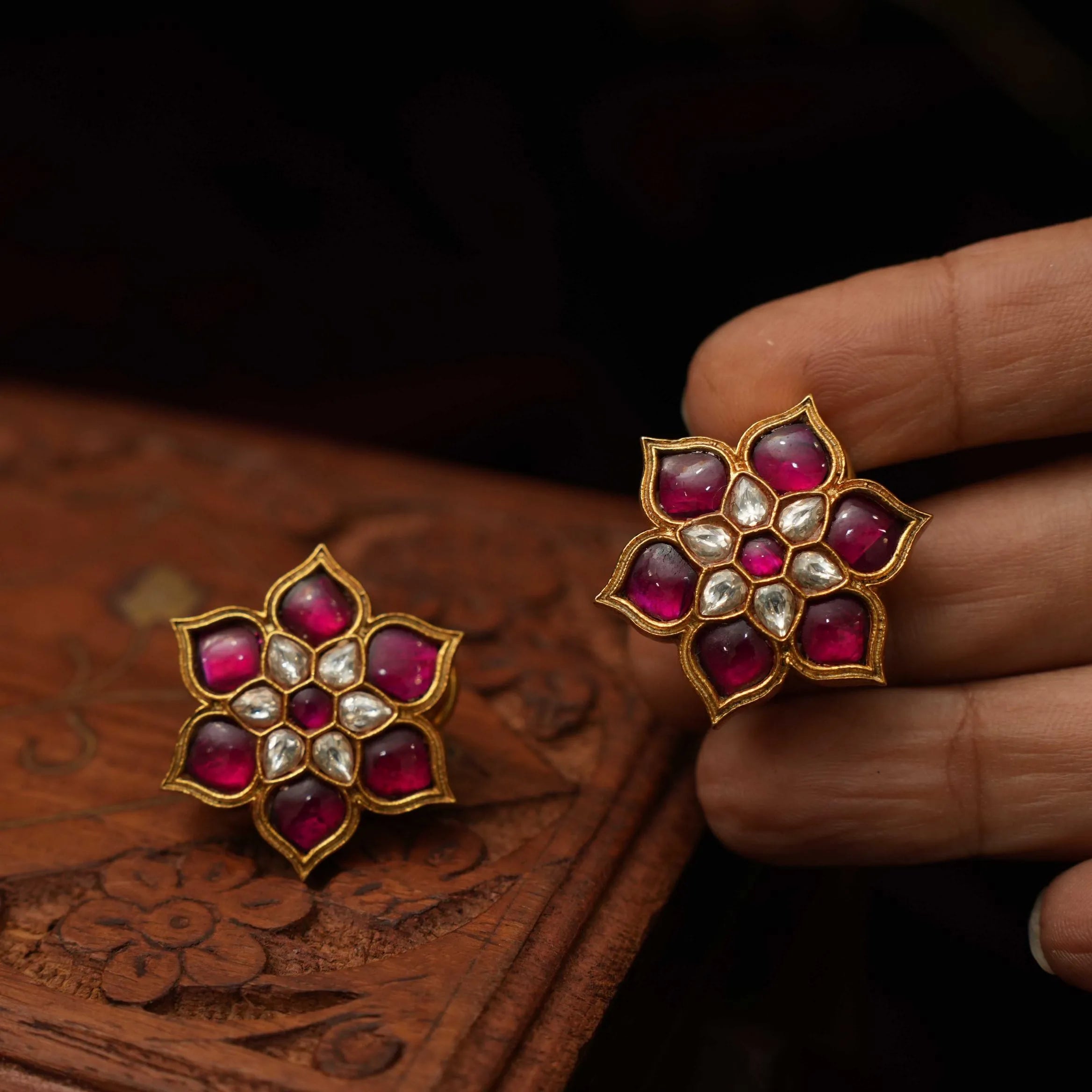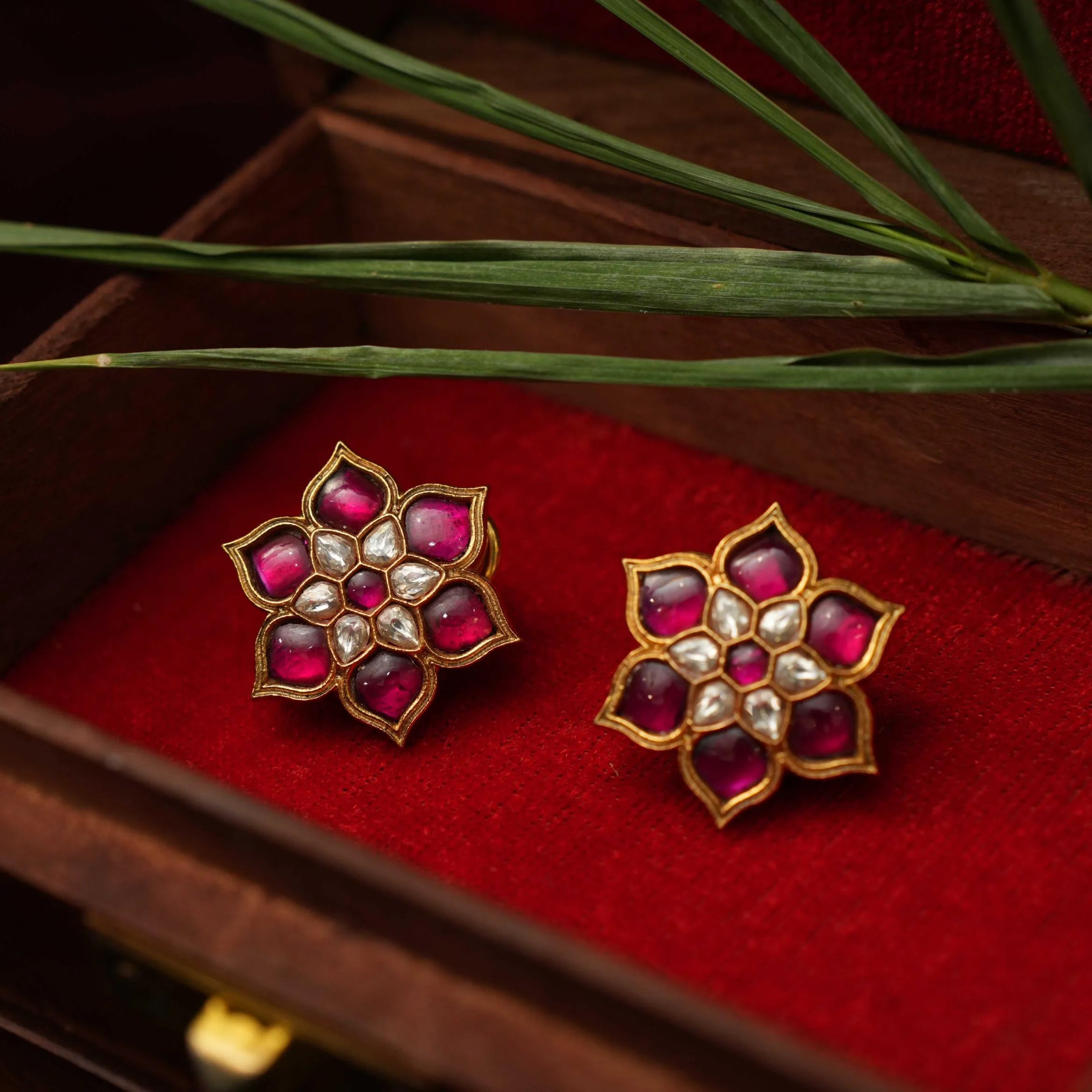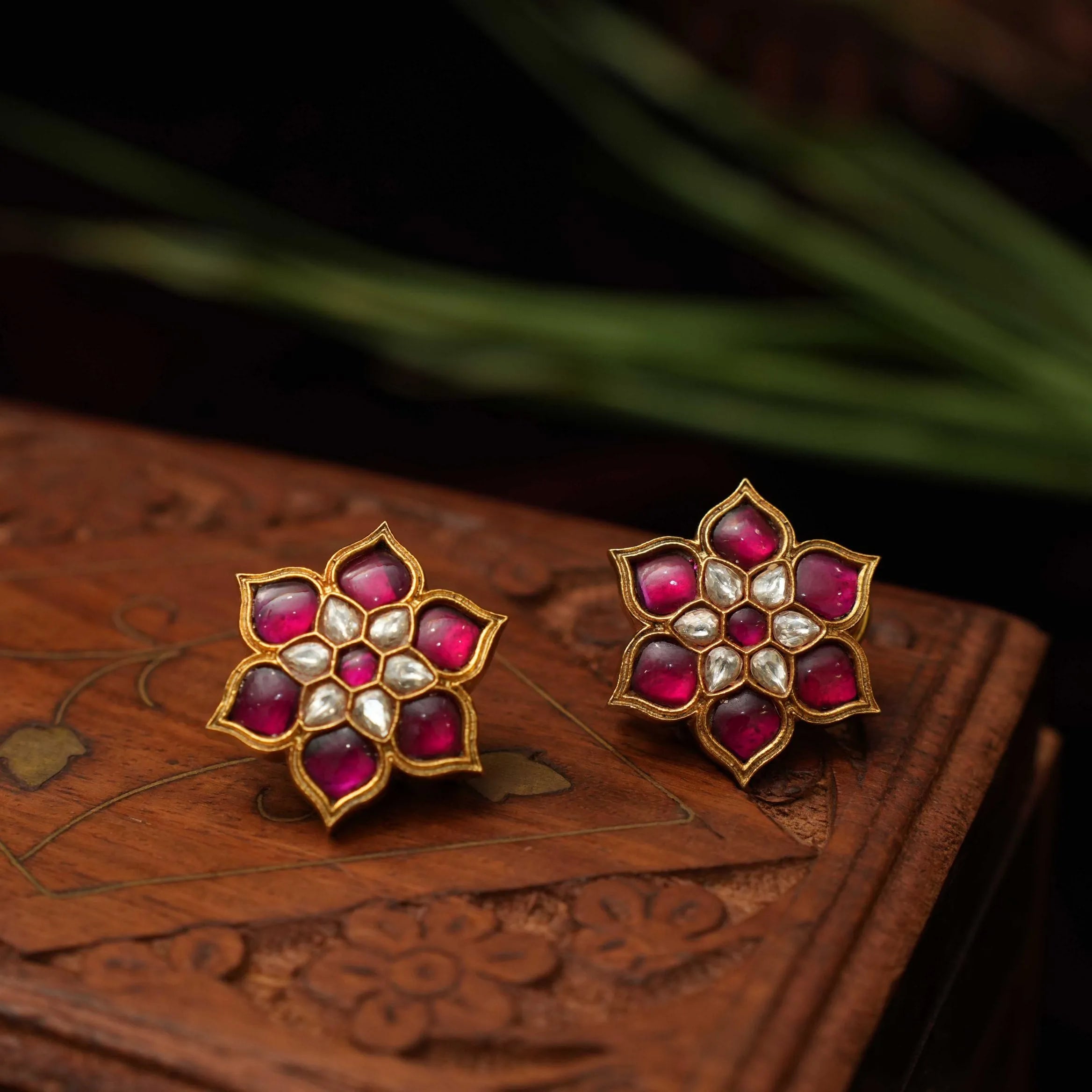 A beautiful silver ear stud in floral motif studded with kemp stones.