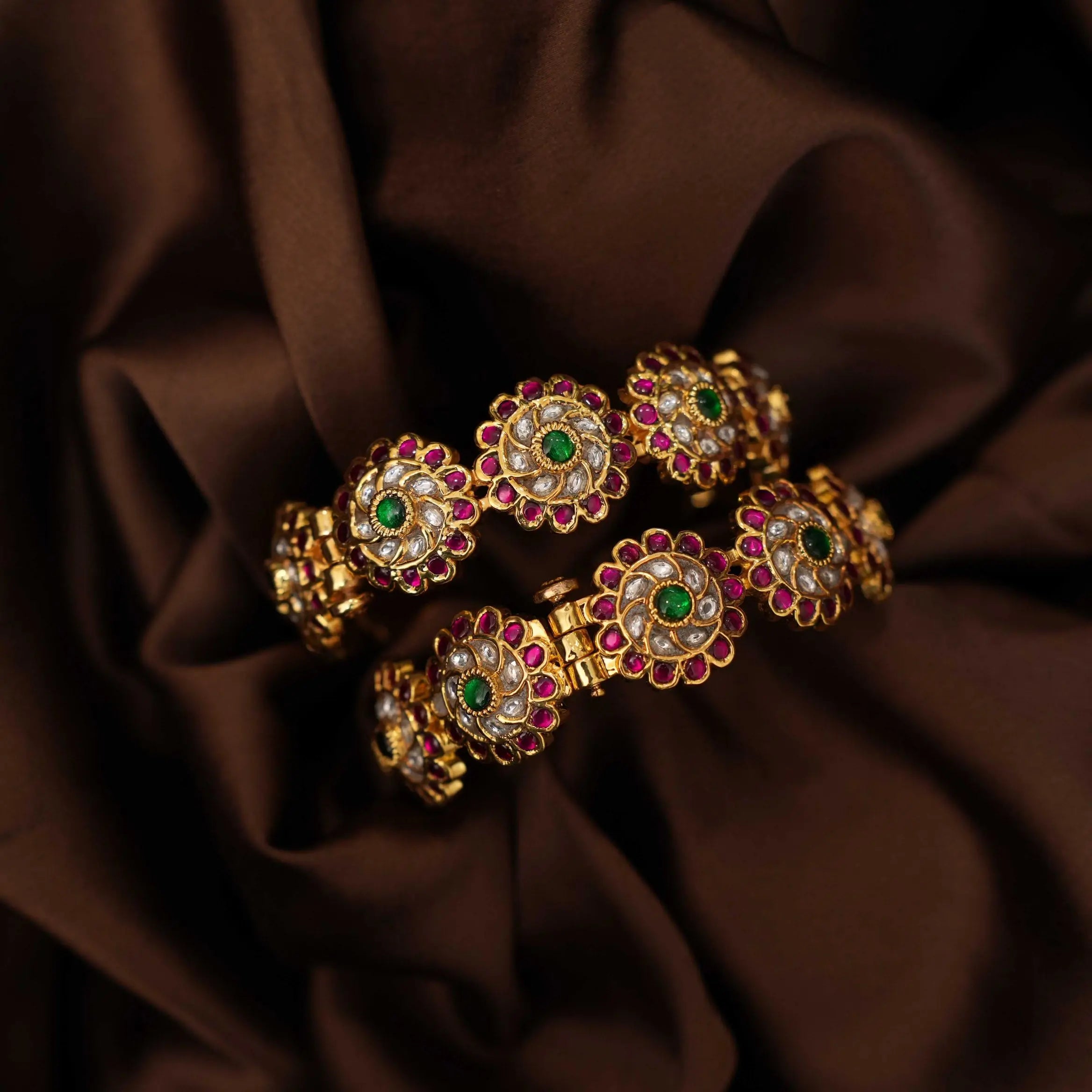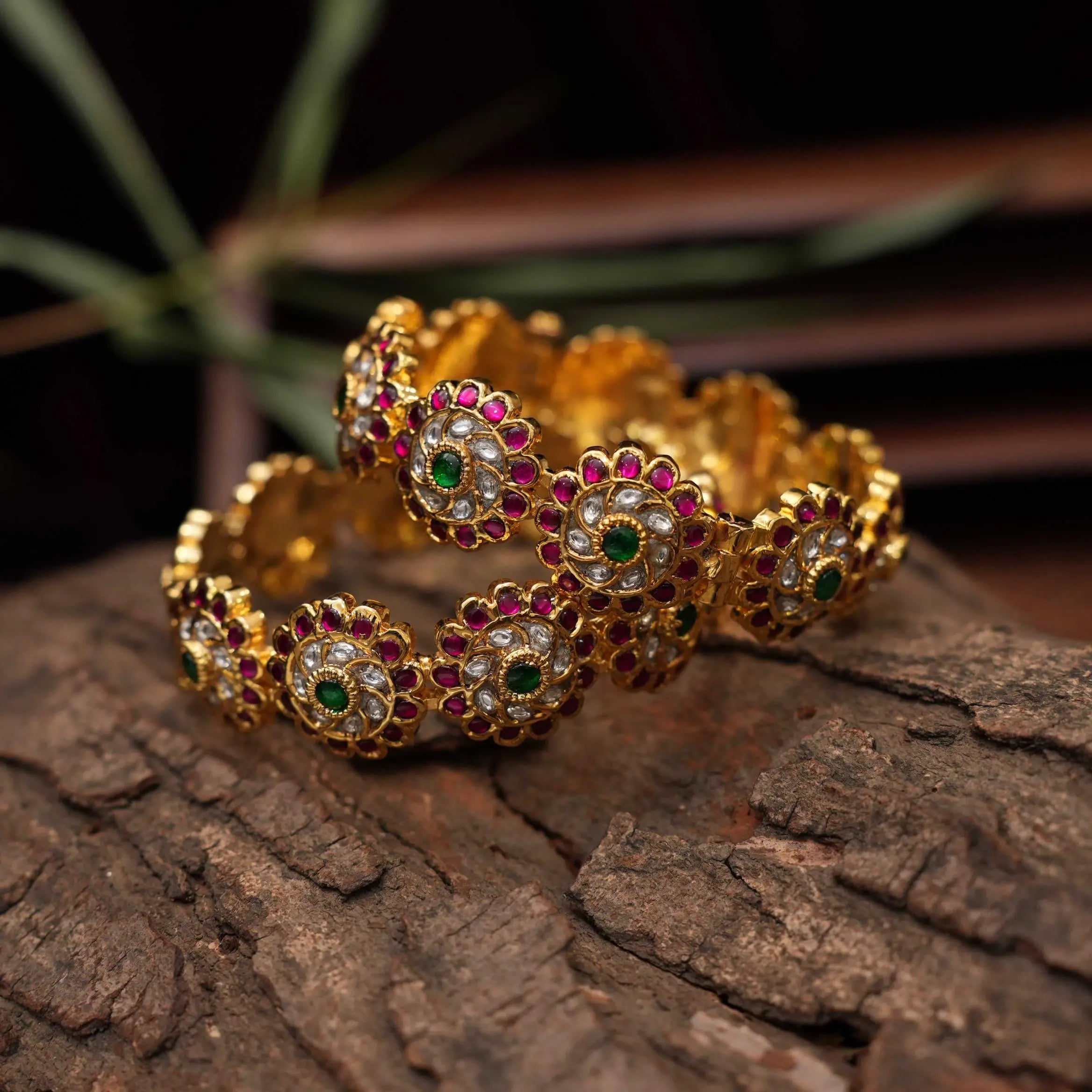 Elevate your ethnic look with this exquisite pair of bangles, designed in a delicate floral pattern and adorned with vibrant polki stones in red, green, and white. A perfect blend of tradition and elegance, these bangles bring timeless charm to festive outfits and special occasions.