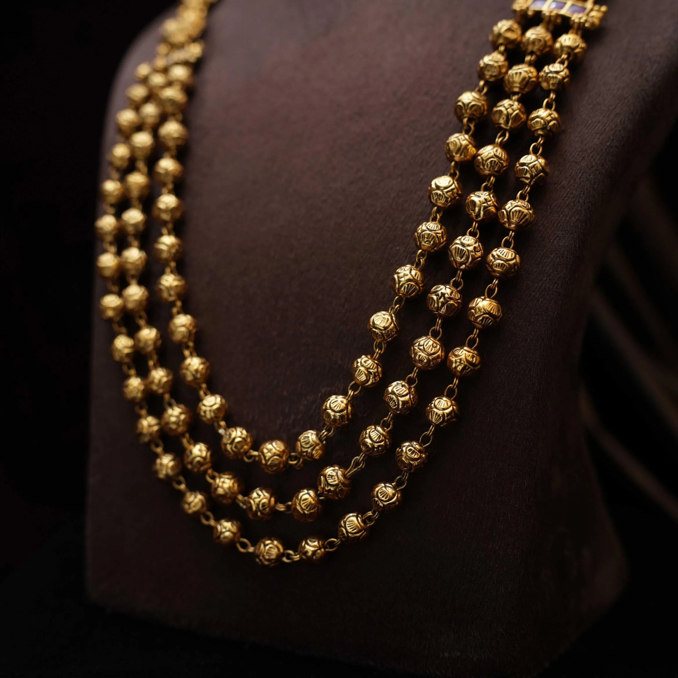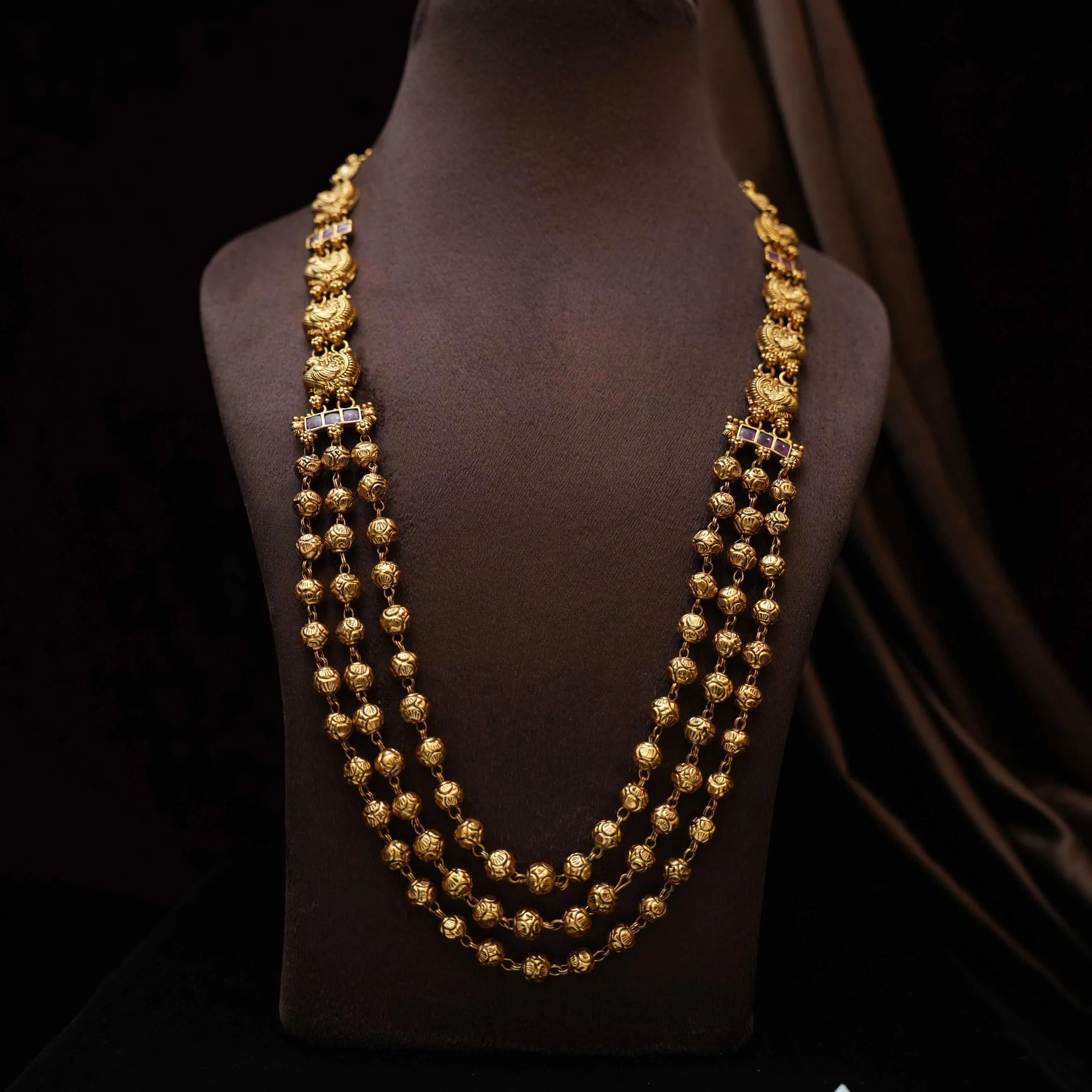 This exquisite handcrafted silver necklace features a unique three-layered design, combining the elegance of a peacock motif with the timeless charm of antique balls. The layers cascade gracefully, each adorned with meticulously placed antique balls, offering a blend of traditional craftsmanship and sophisticated design.