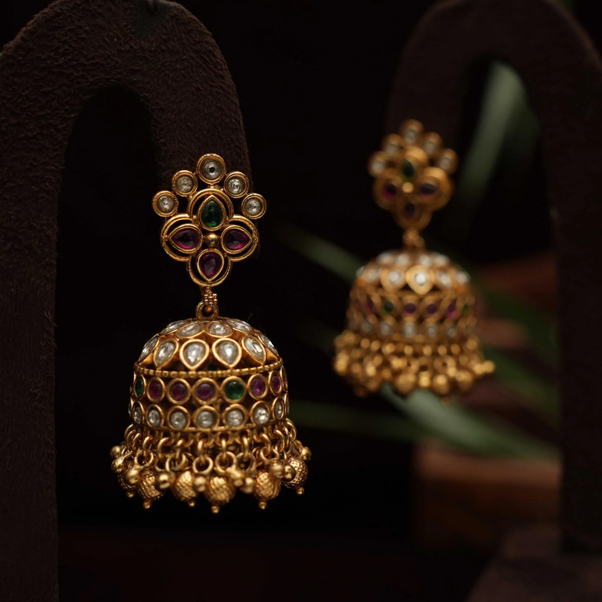 A traditional antique jhumka earrings in floral and peacock motif studded with kemp stones and golden balls.