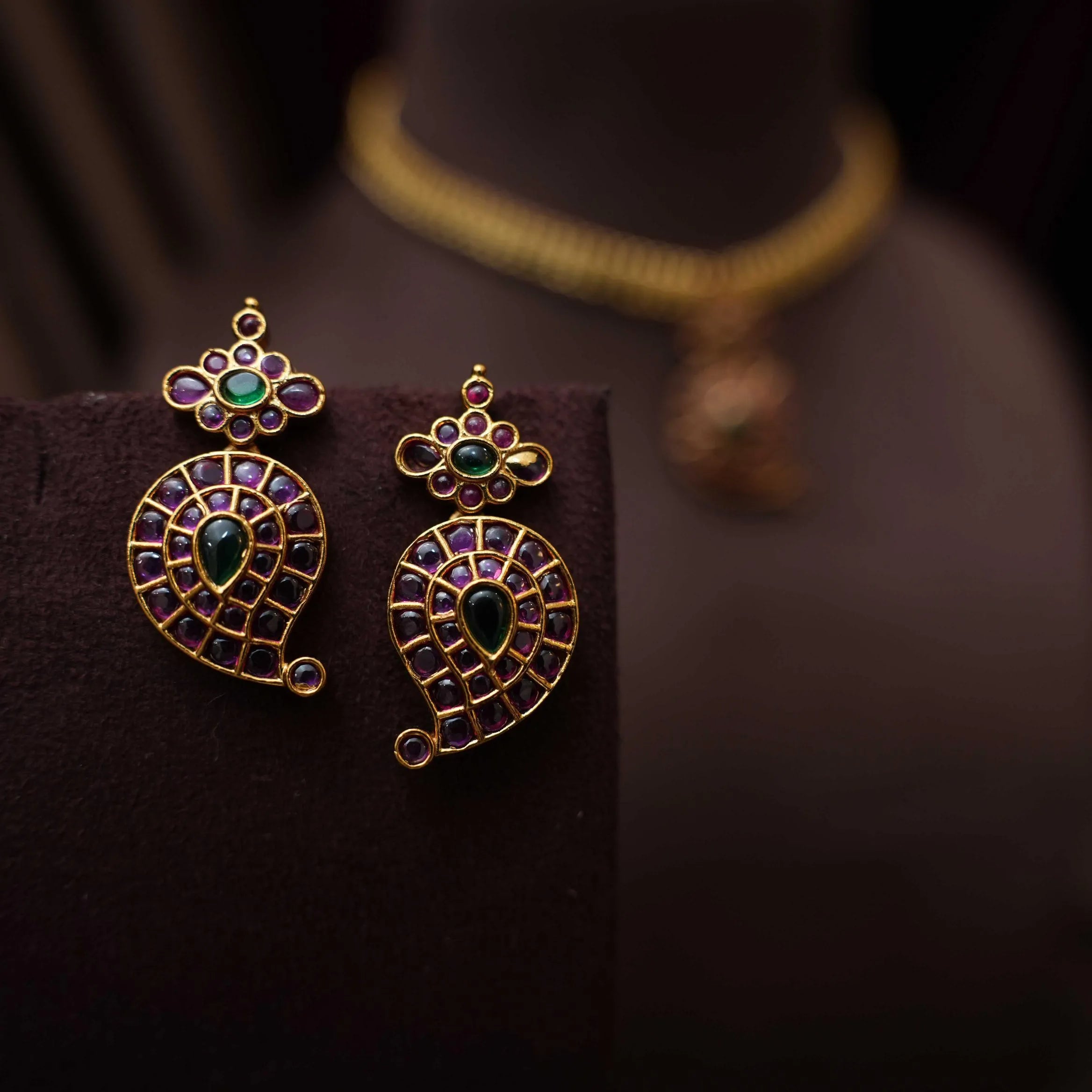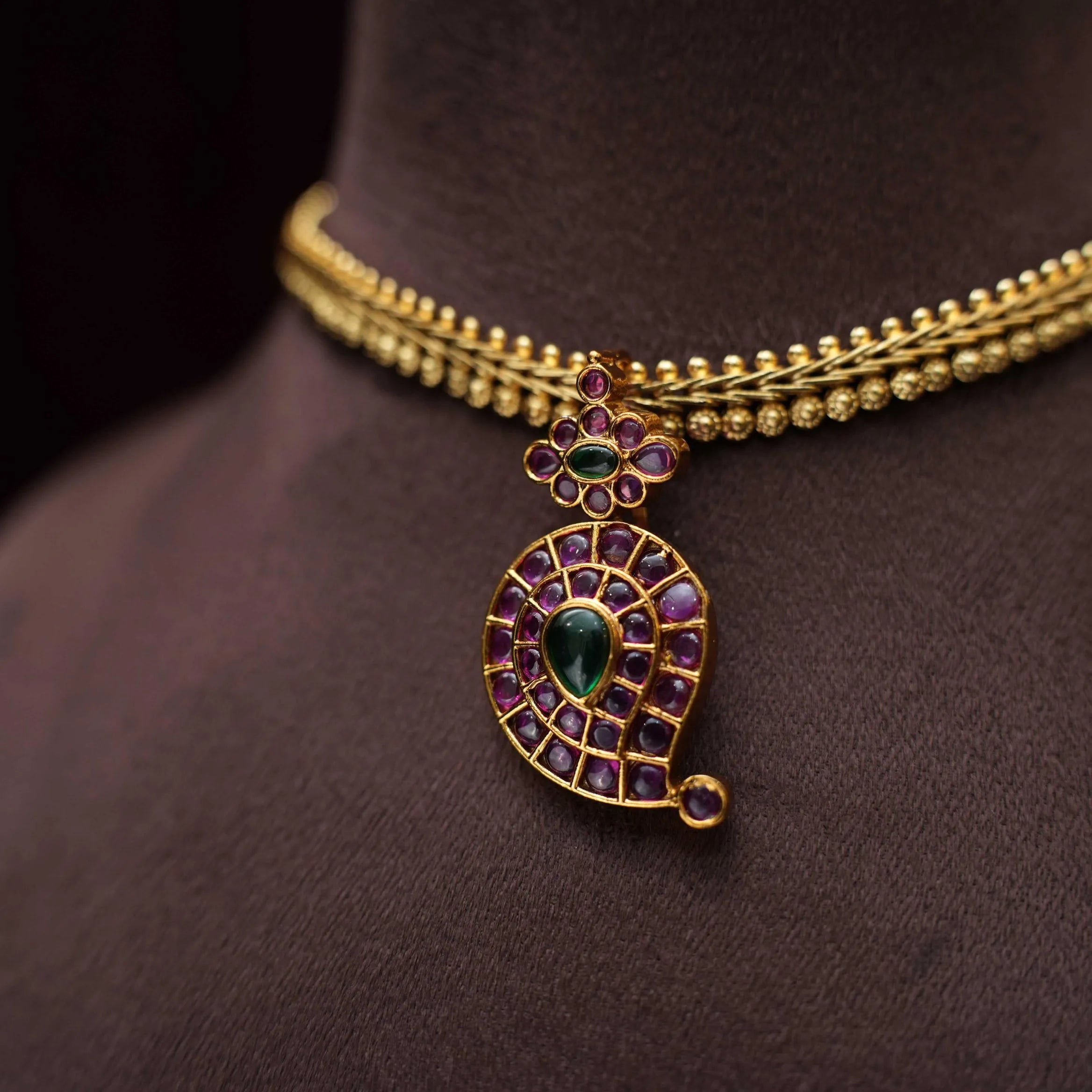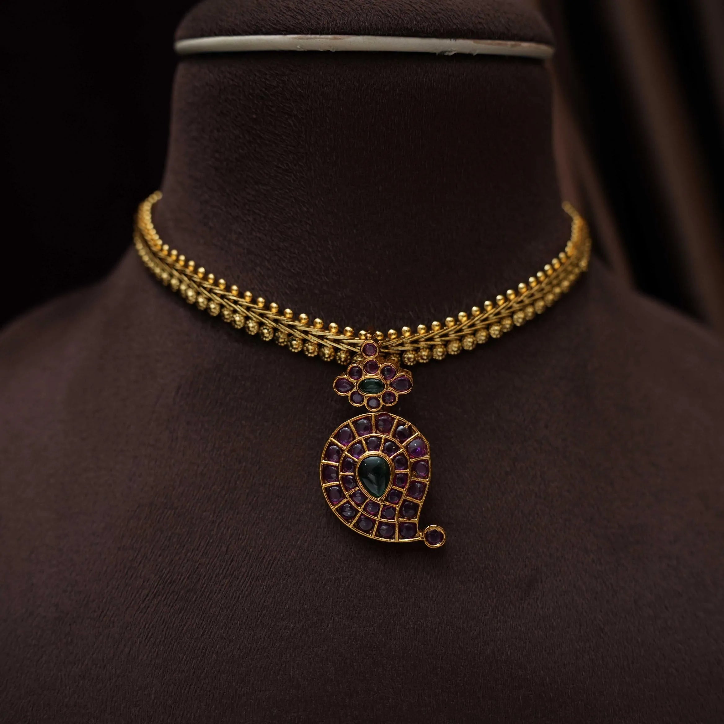 A traditional antique necklace paired to mango shaped pendant studded with kemp stones. This set comes with a pair of ear stud.
