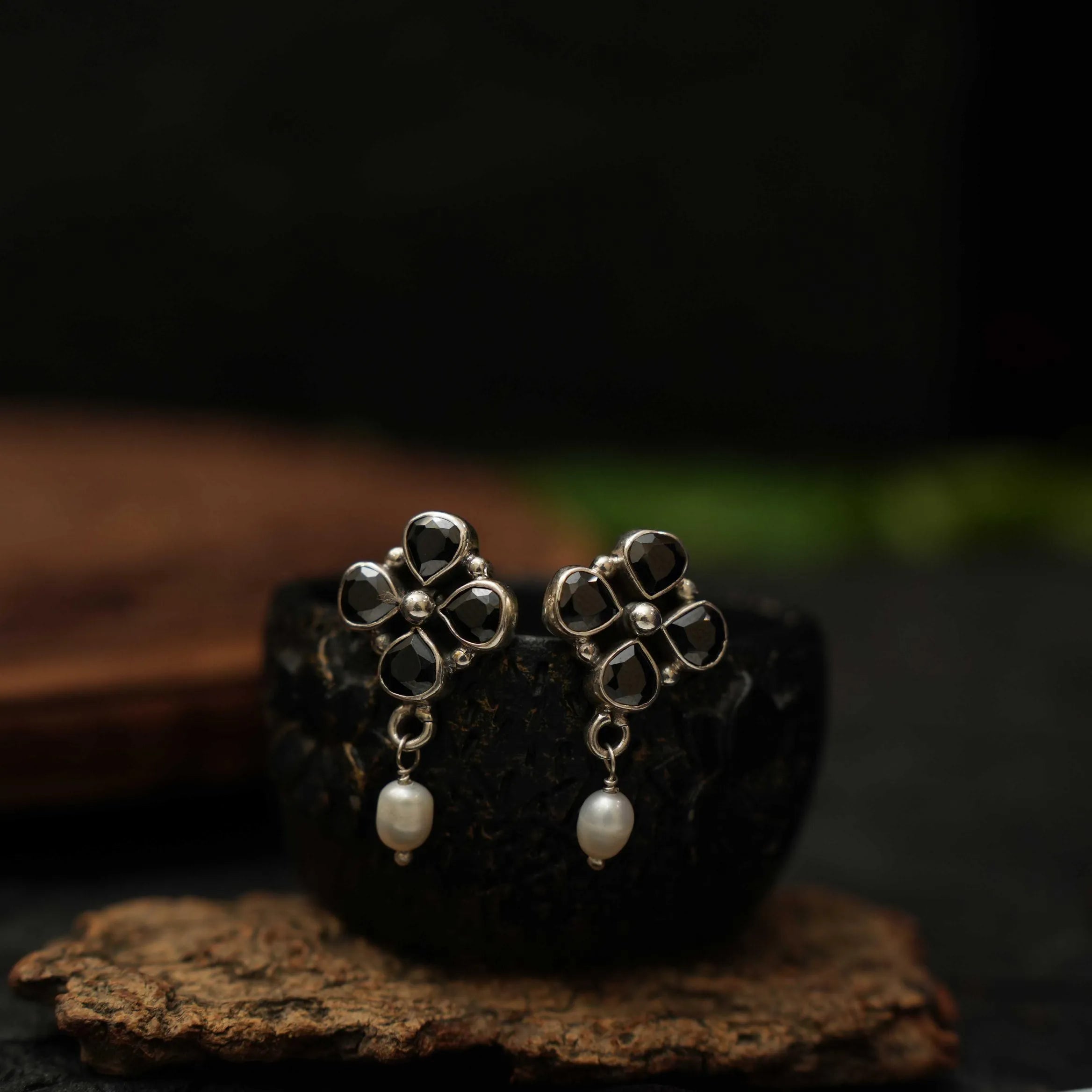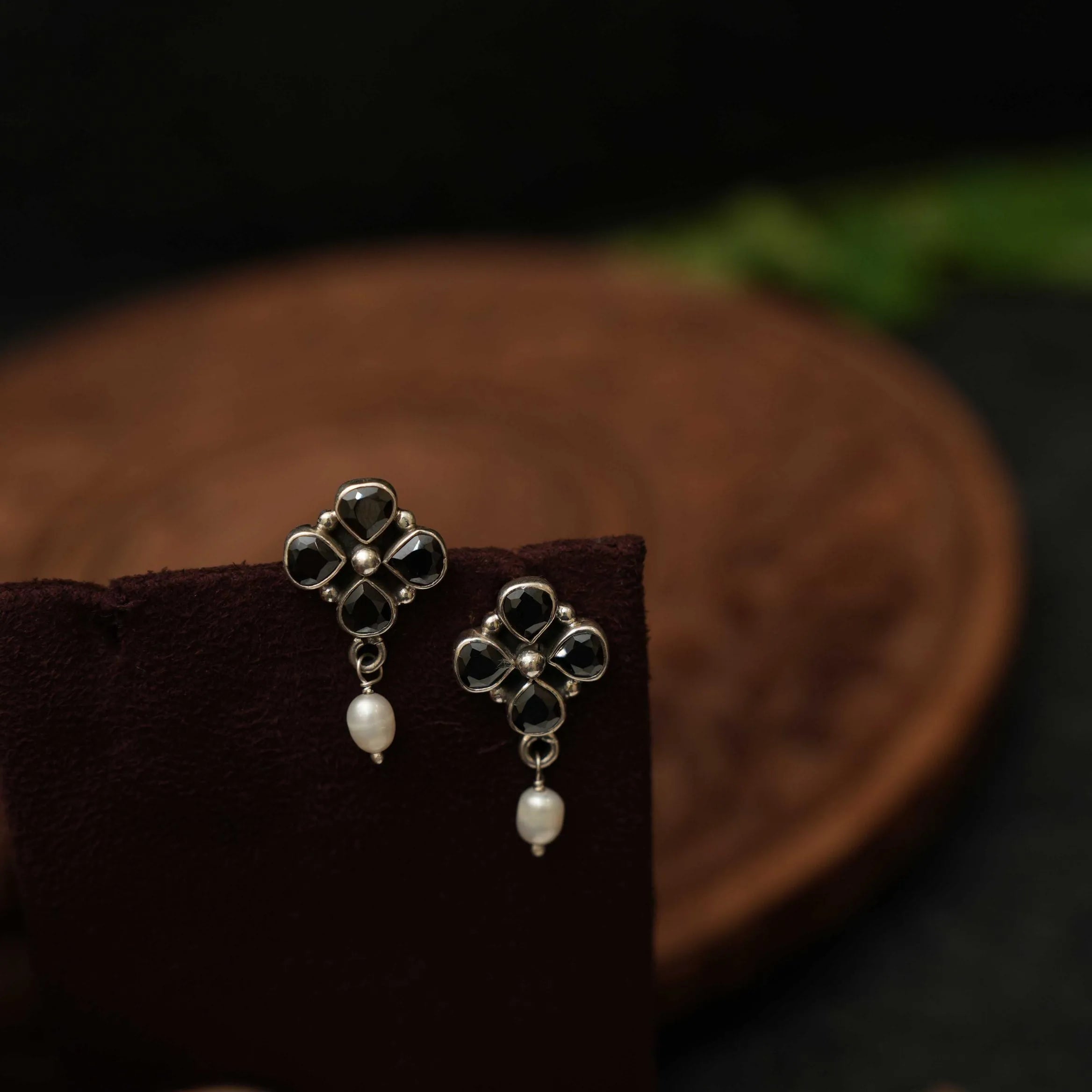 A simple and elegant silver ear stud handcrafted with black stones adorn with pearls.