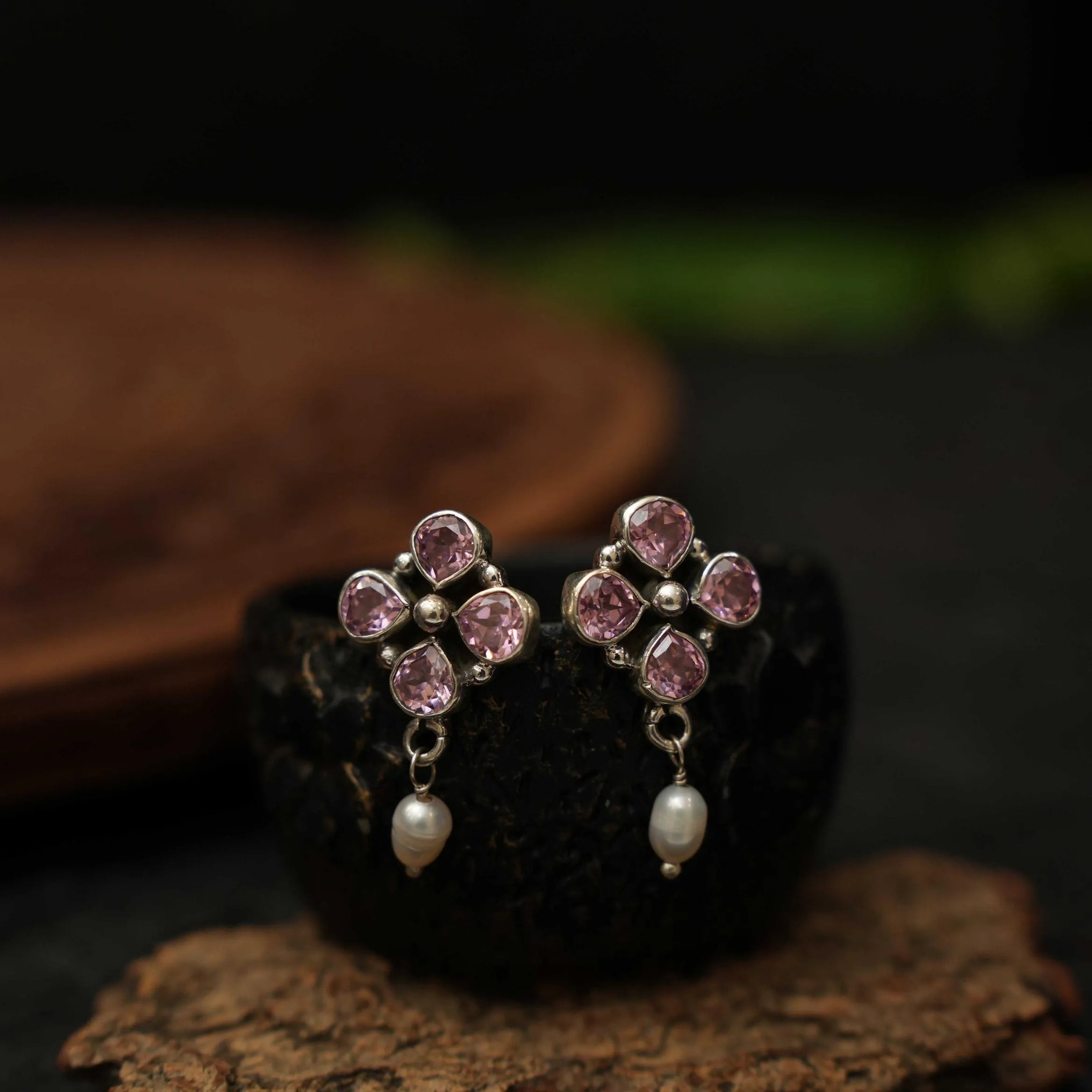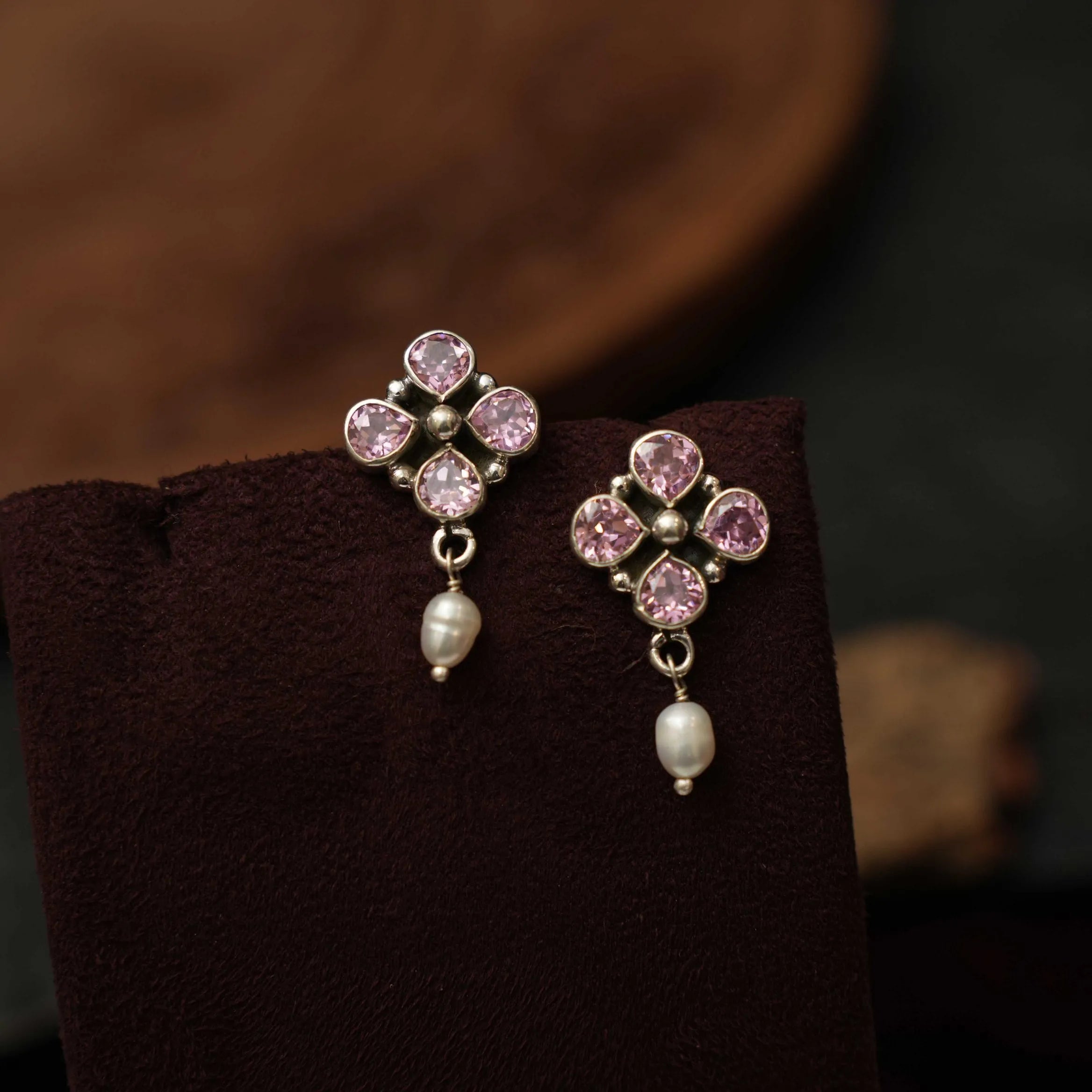 A simple and elegant silver ear stud handcrafted with pastel pink stones adorn with pearls.