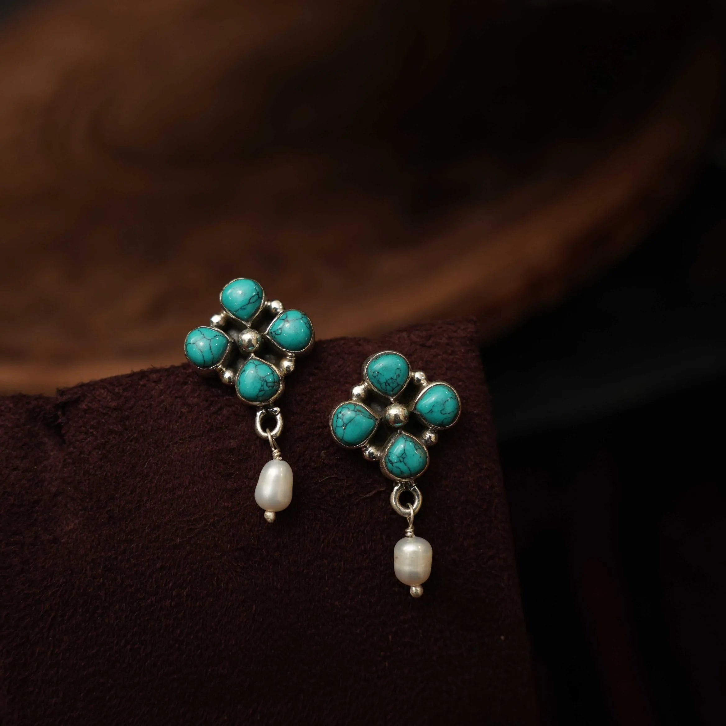A simple and elegant silver ear stud handcrafted with turquoise stones adorn with pearls.