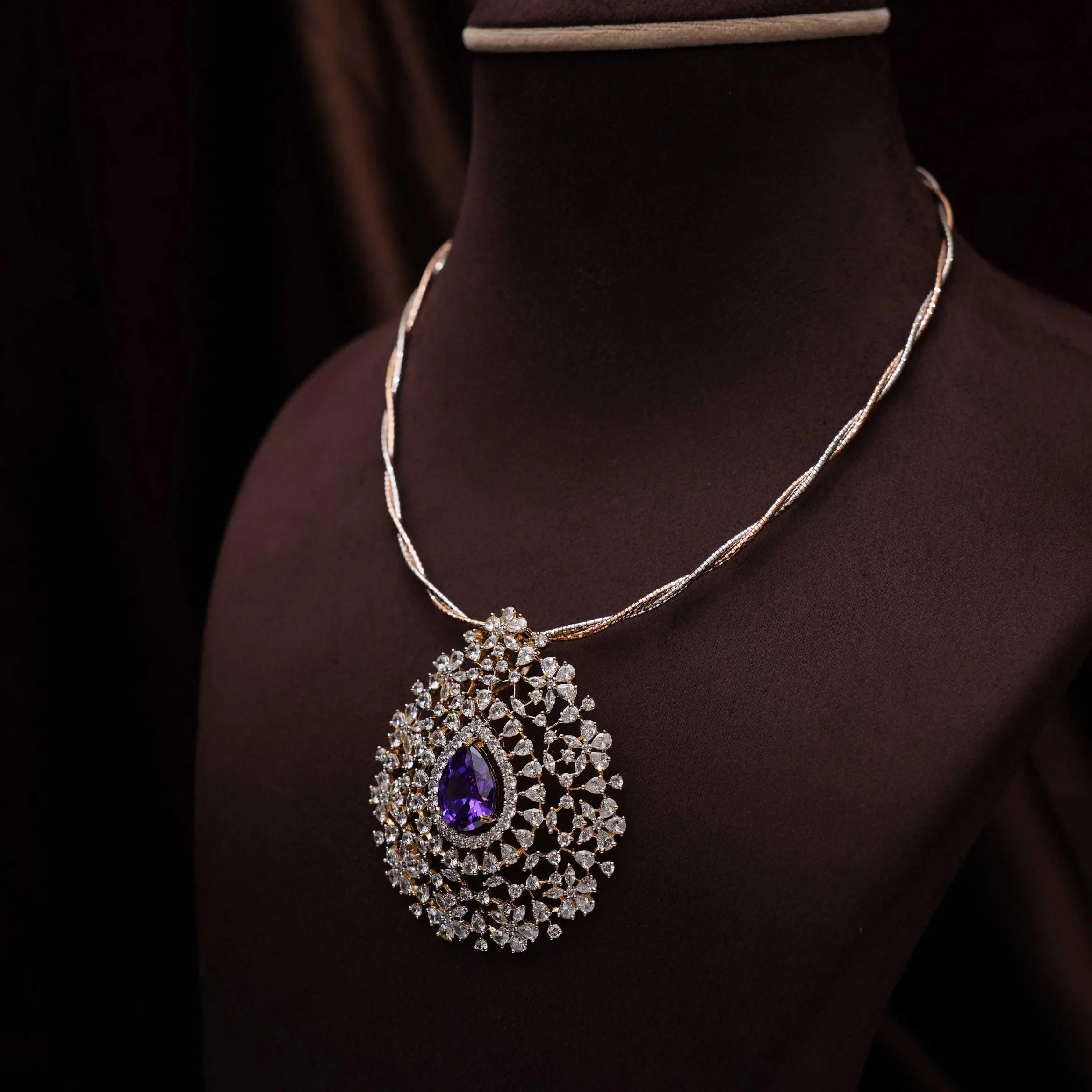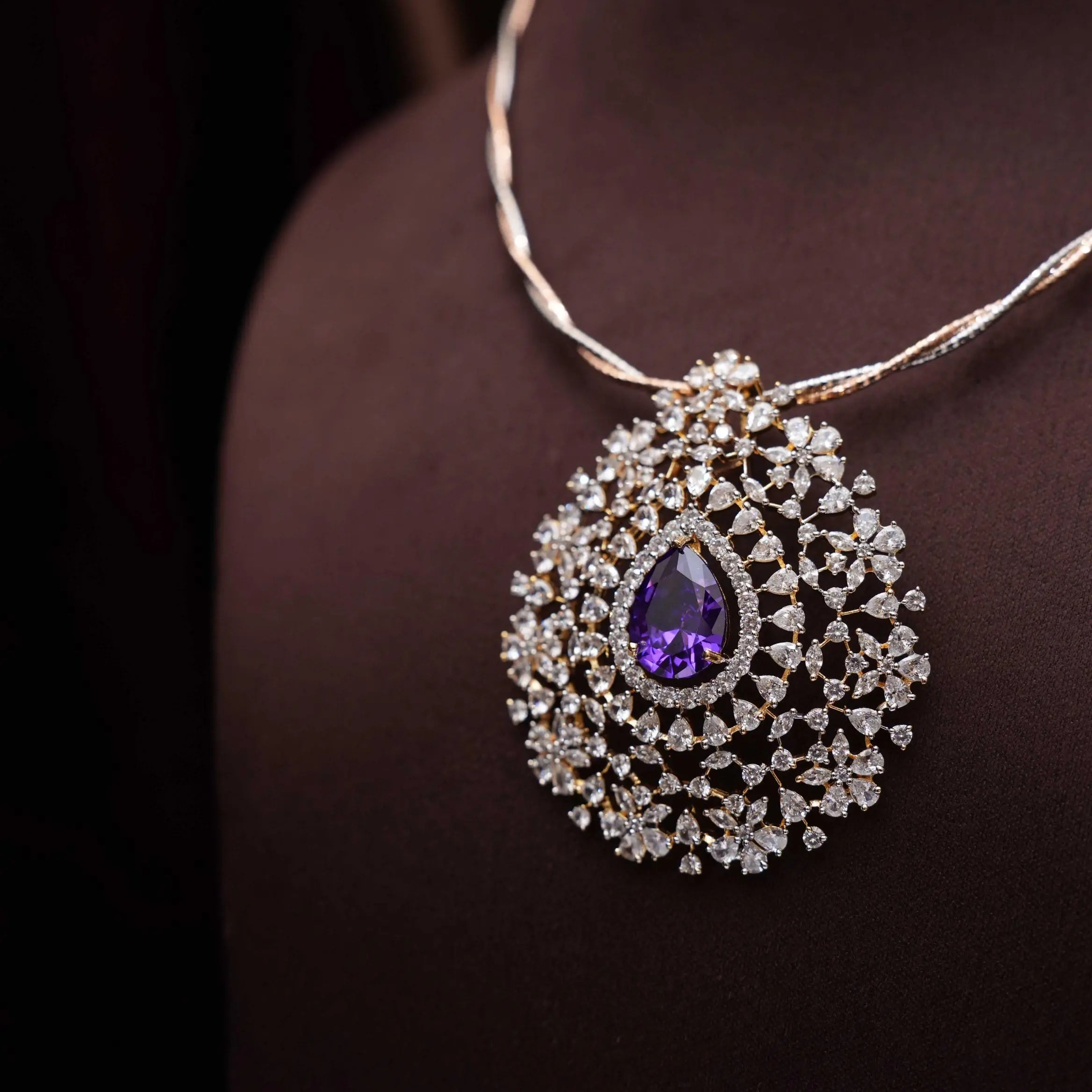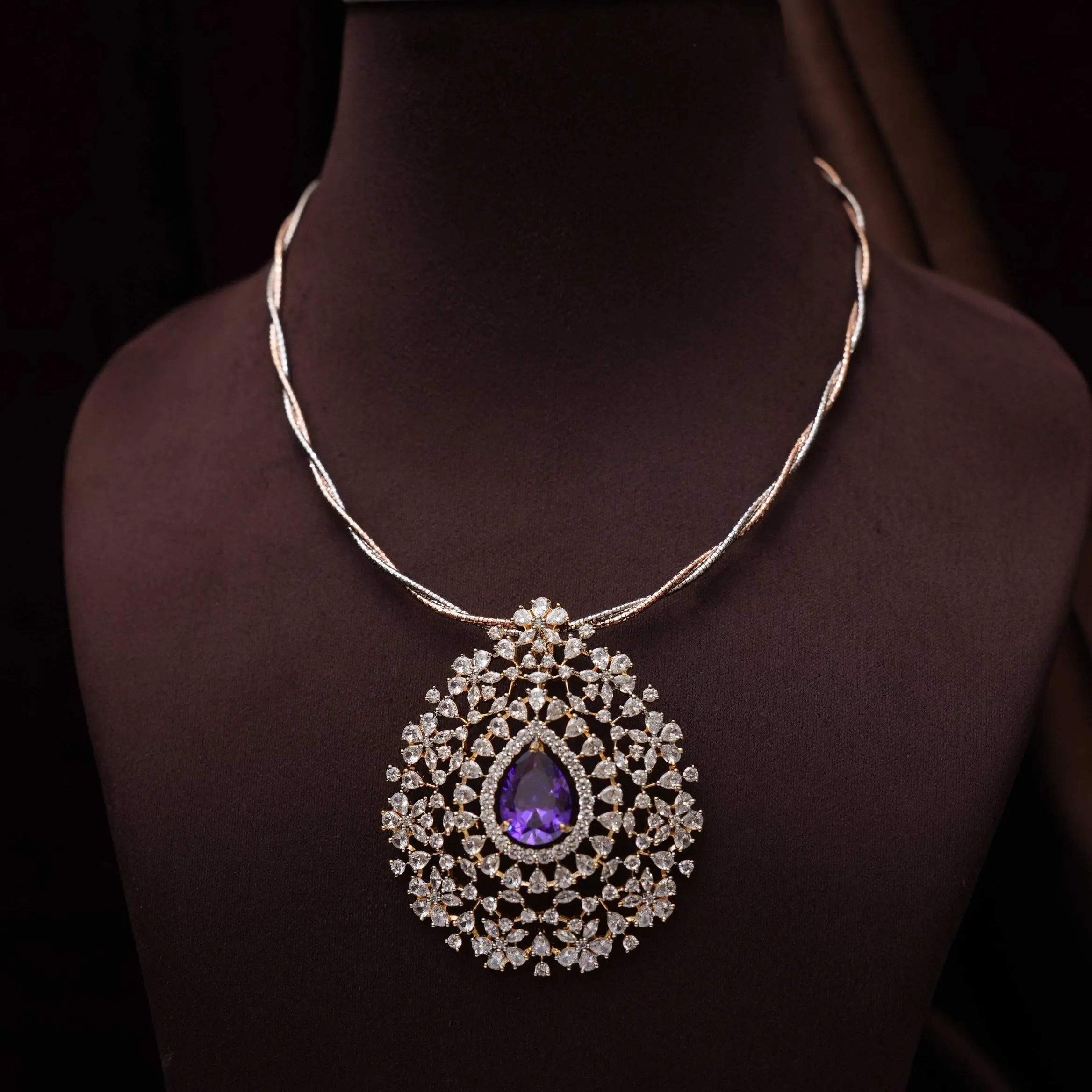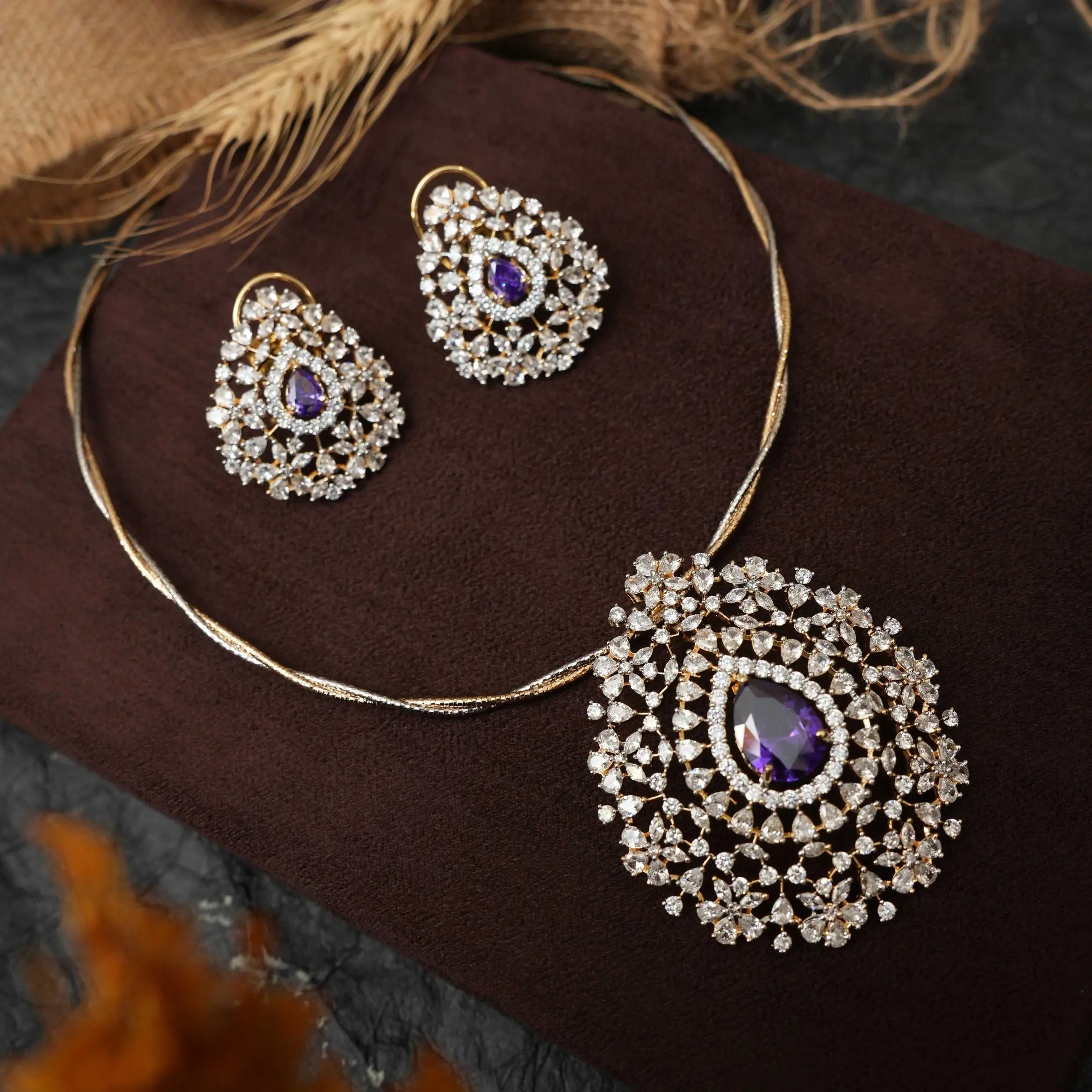 A beautiful necklace handcrafted in zircon stones and agate pendant paired to hasli. This set comes with a pair of ear stud.