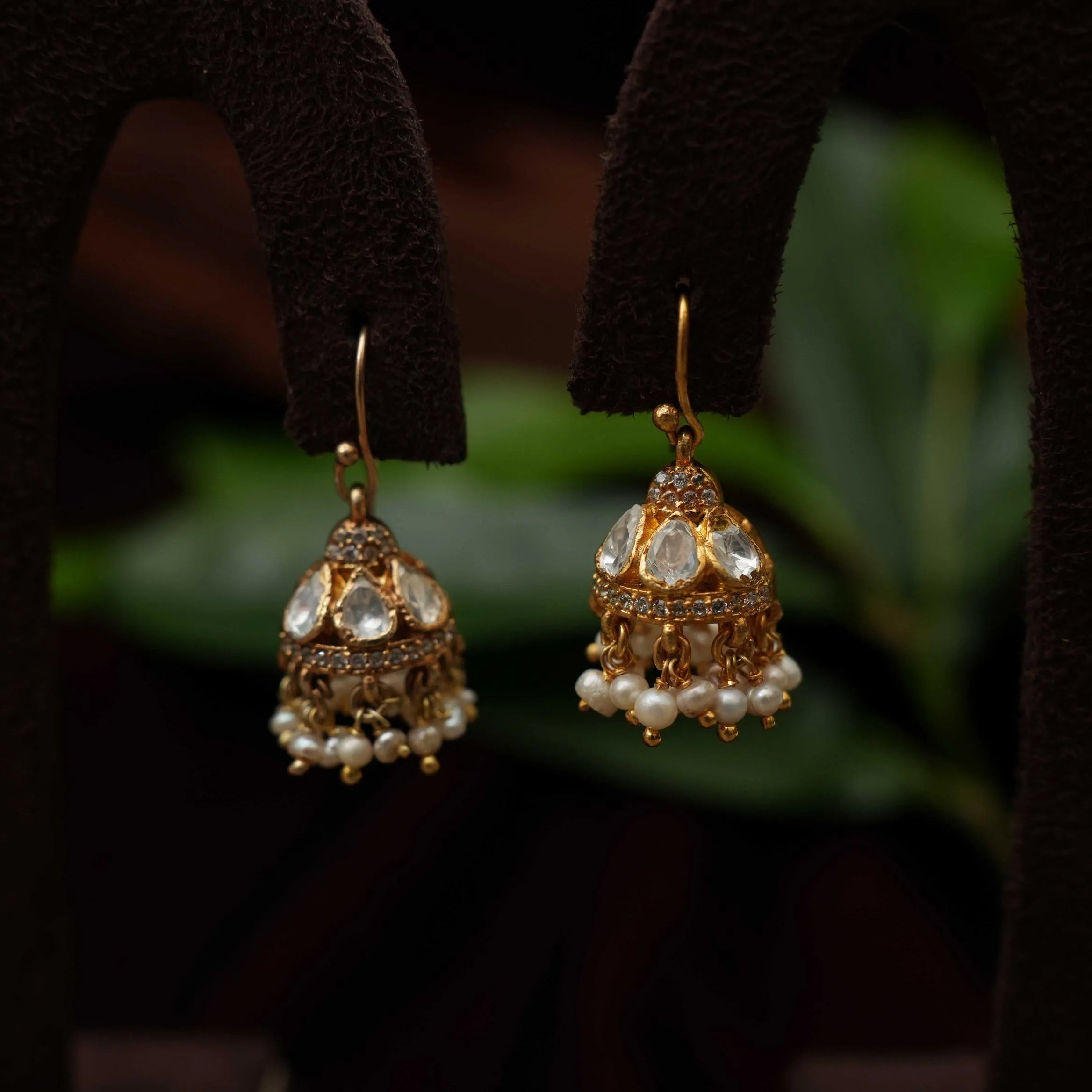 A beautiful silver jhumka earrings studded with moissanite stones finely finished in Gold finish.