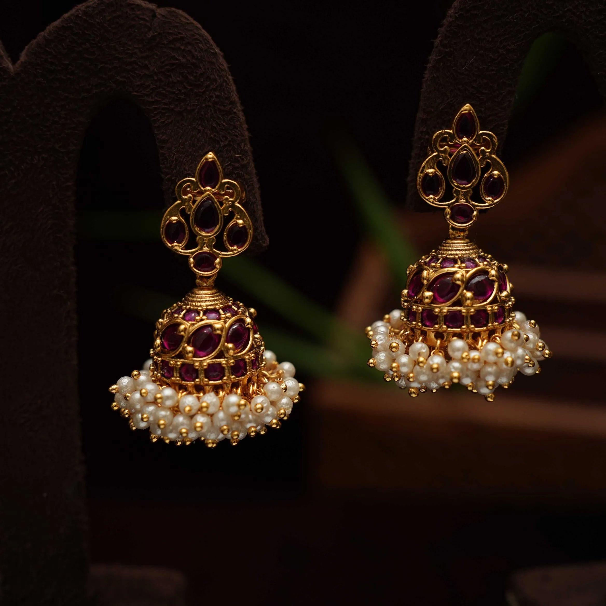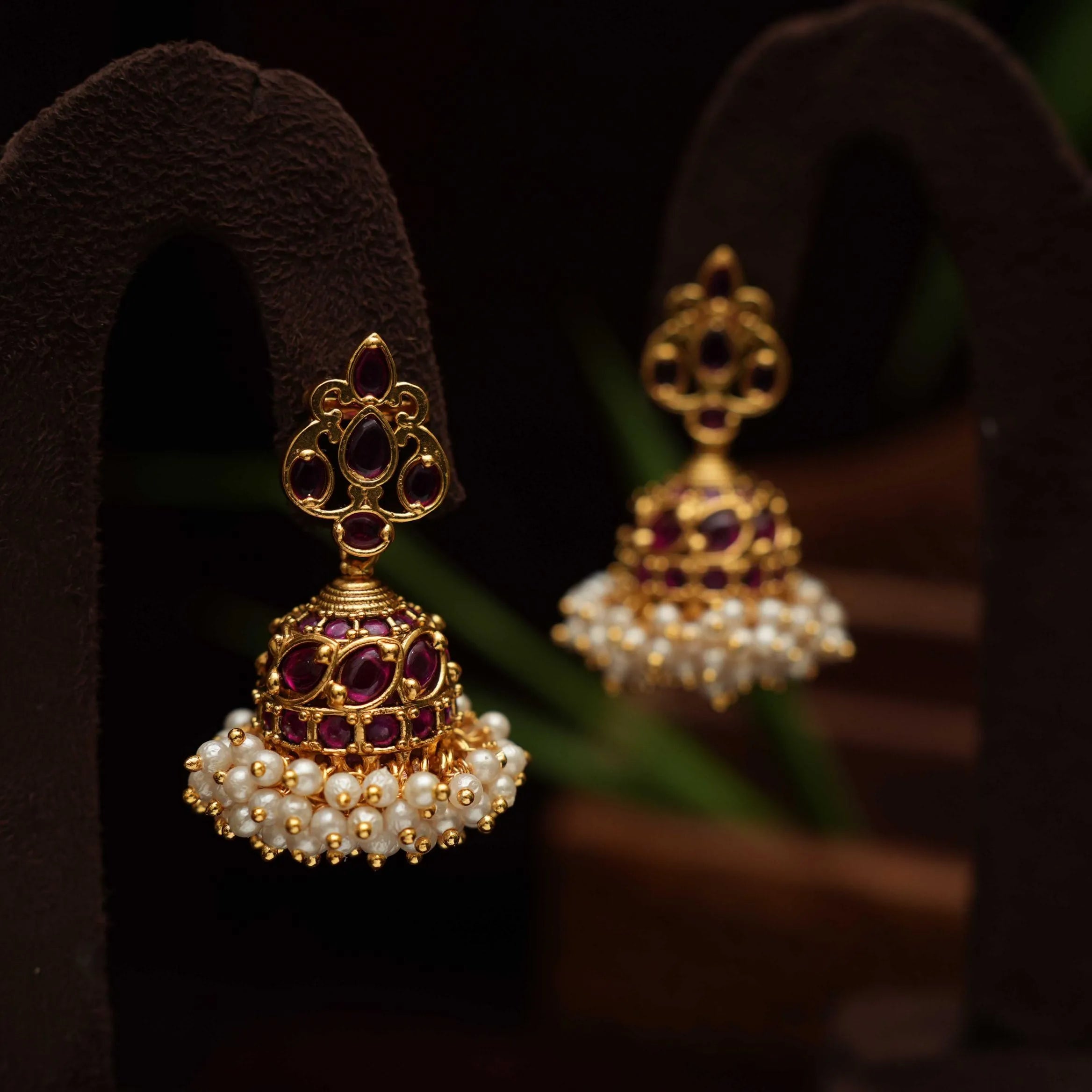 An elegant antique jhumka earrings in peacock motif adorn with kemp stones and pearls.