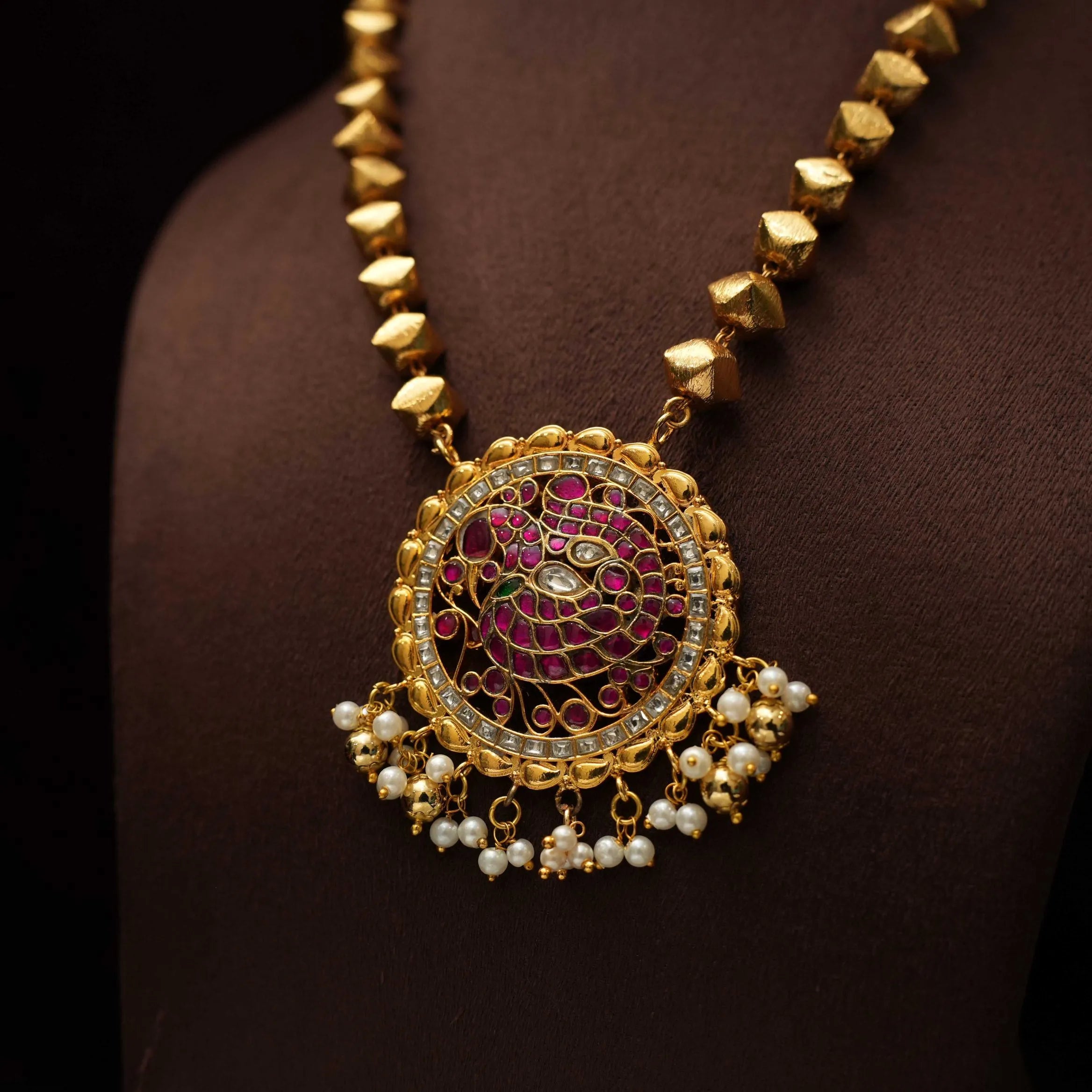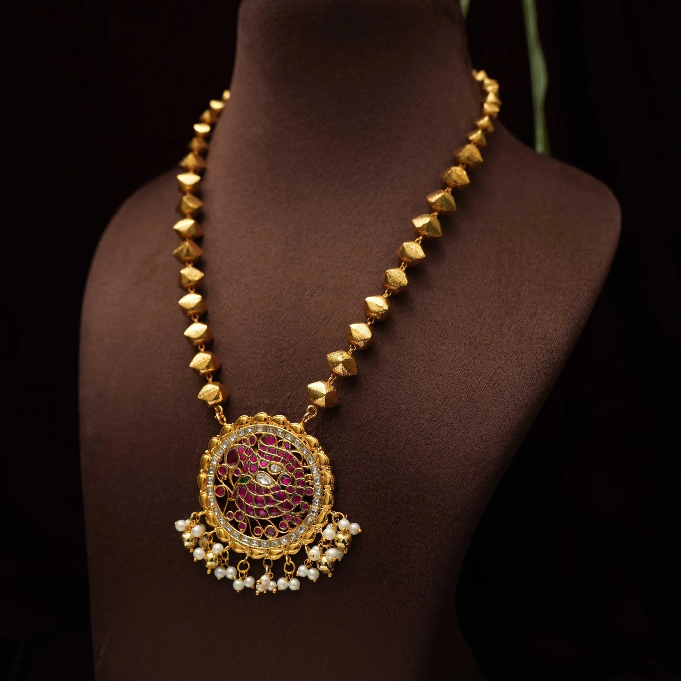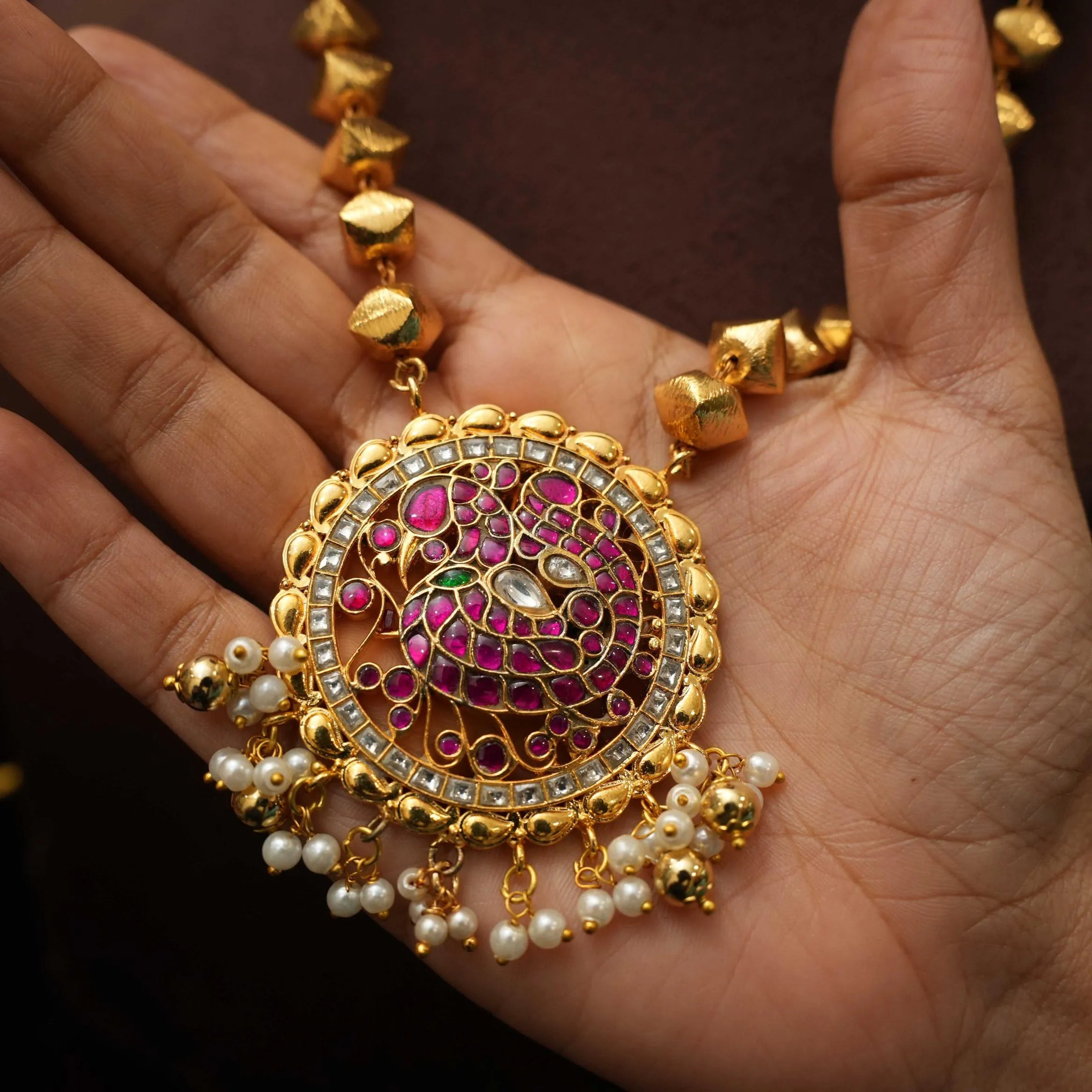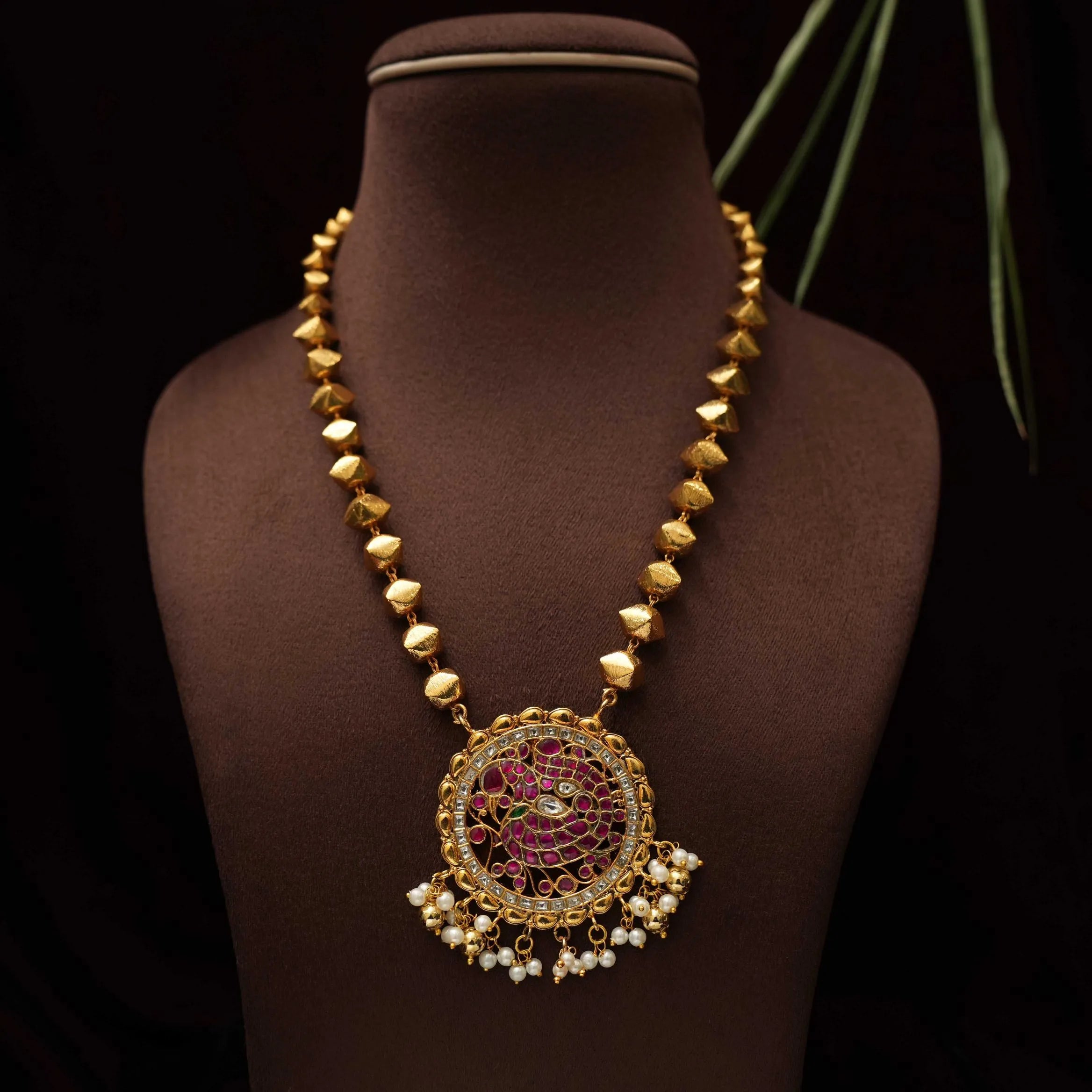 A traditional antique necklace designed in a classic coin motif, beautifully highlighted with an intricate Goddess motif at the center. Studded with shimmering white stones, this piece radiates spiritual elegance and heritage charm. Perfectly complemented by a matching pair of ear studs, finished in Nagas finish. It’s an ideal pick for temple wear and festive occasions.