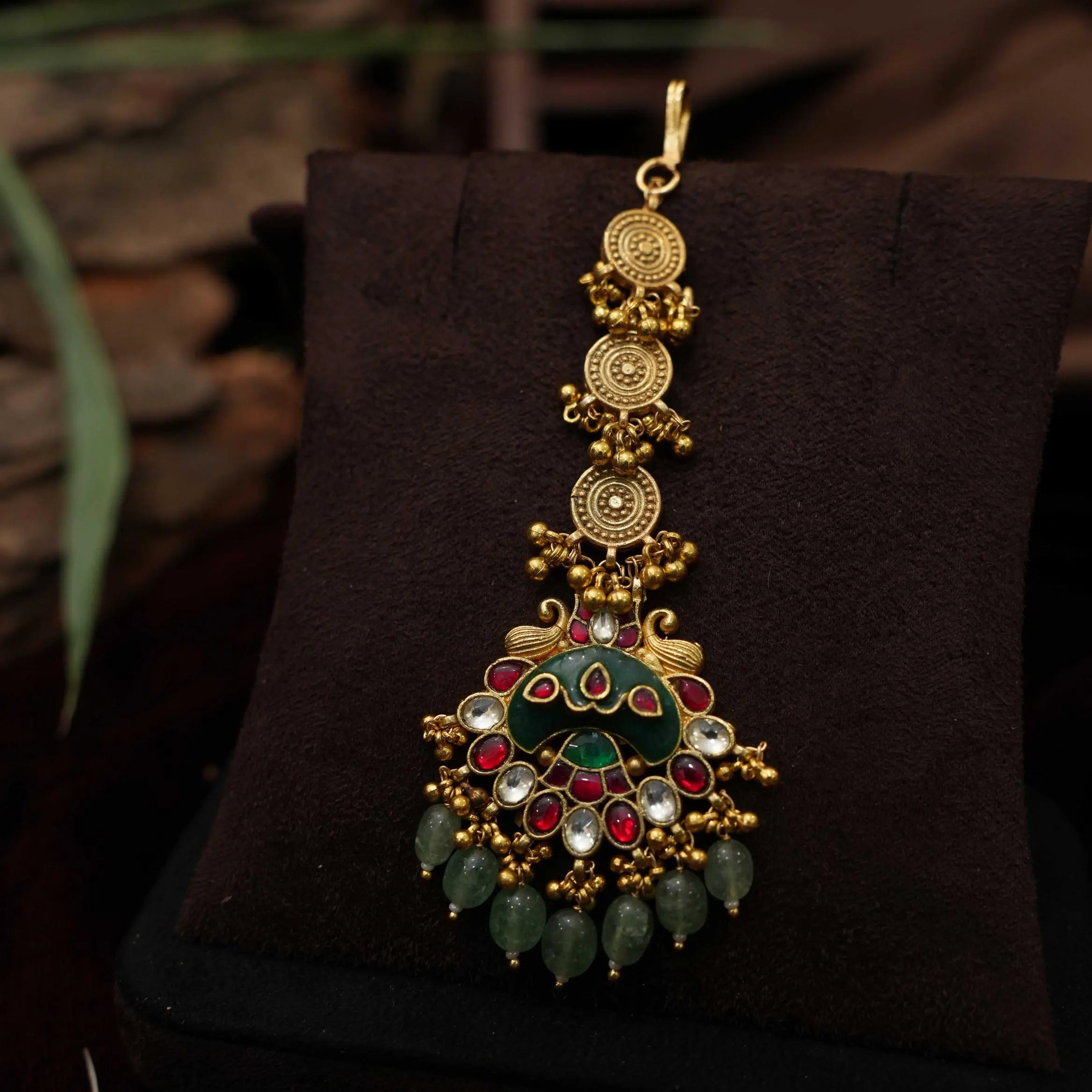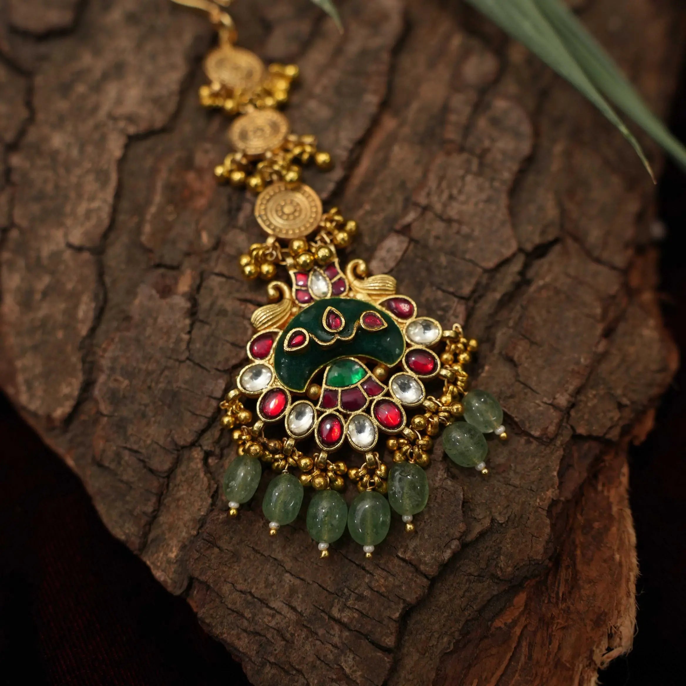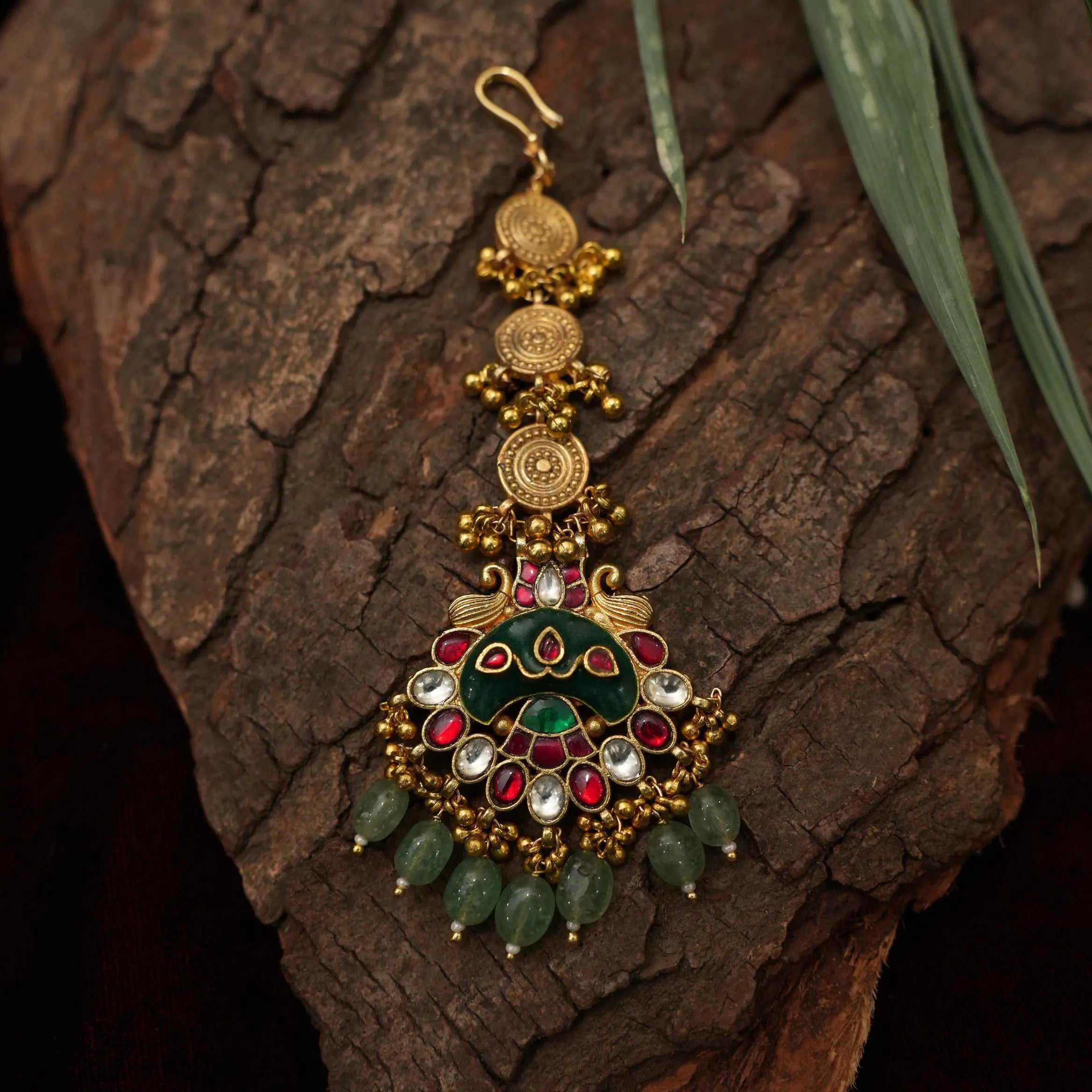 A simple and contemporary tikka studded with polki stones and green agate adorn with green beads and golden balls and finely finished in antique finish.