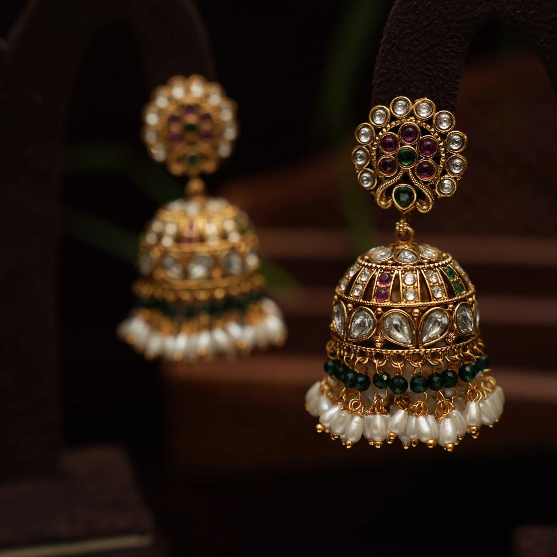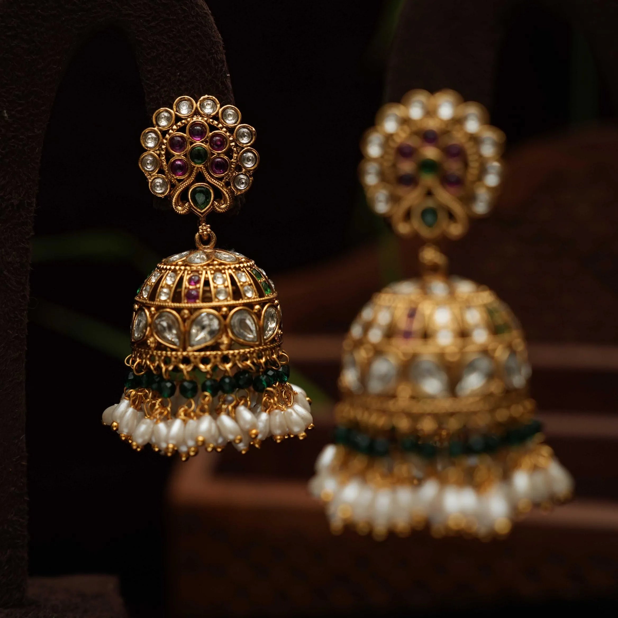 A stunning antique jhumka earrings studded with kemp stones, pearls & beads.