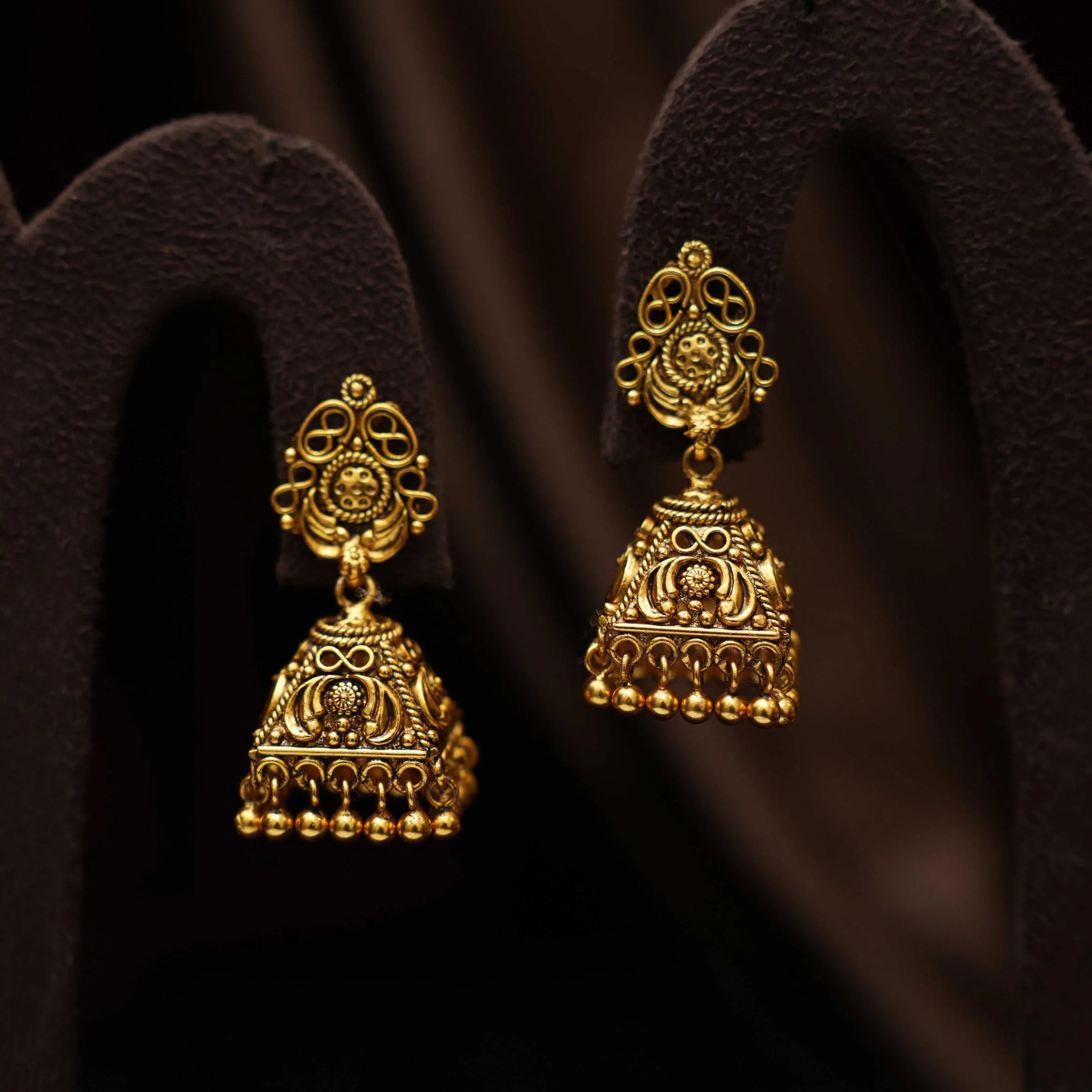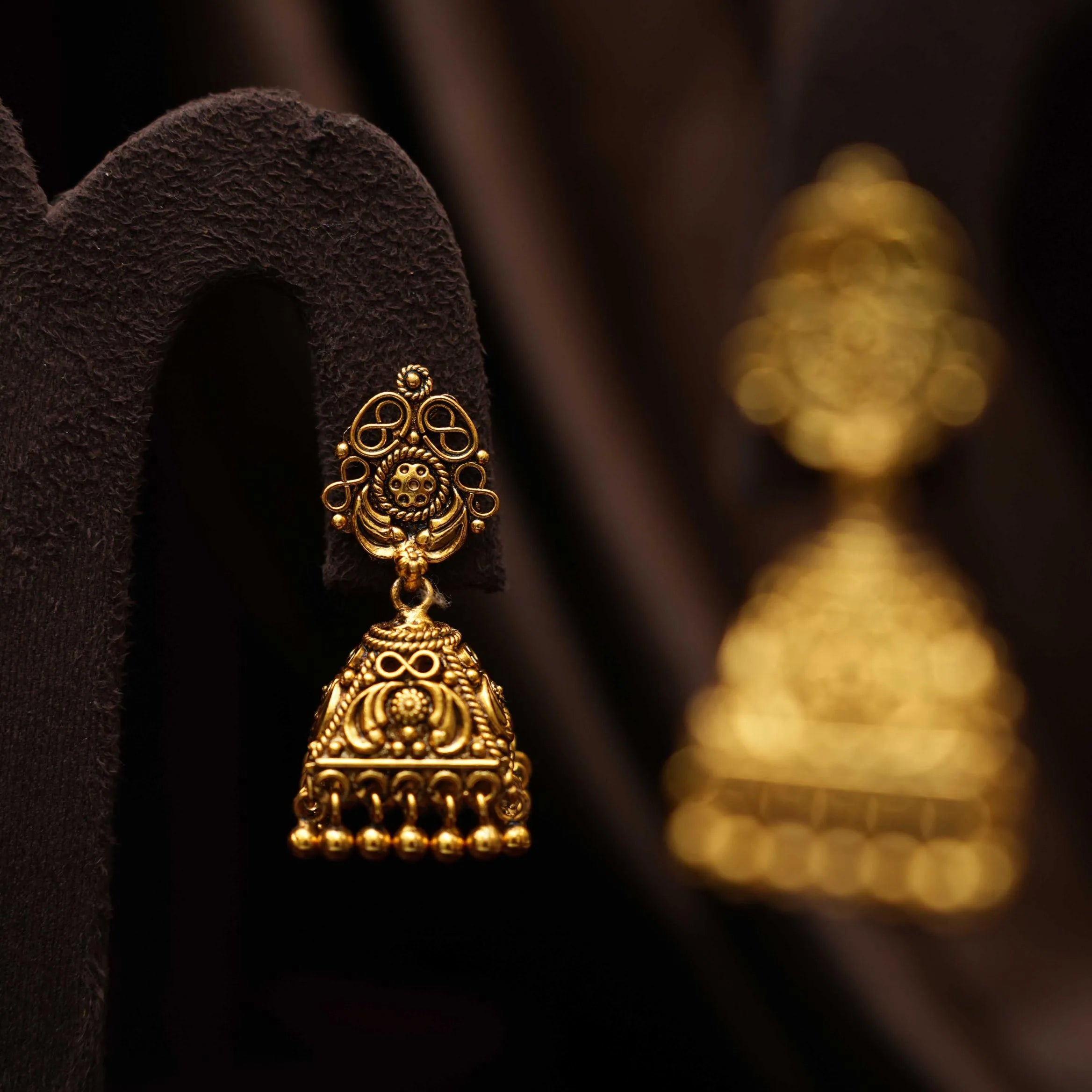 Infuse modern allure with our 92.5 gold-plated silver jhumka, showcasing floral motif complemented by golden balls. This contemporary piece effortlessly combines tradition and trend for a timeless expression of sophisticated style.