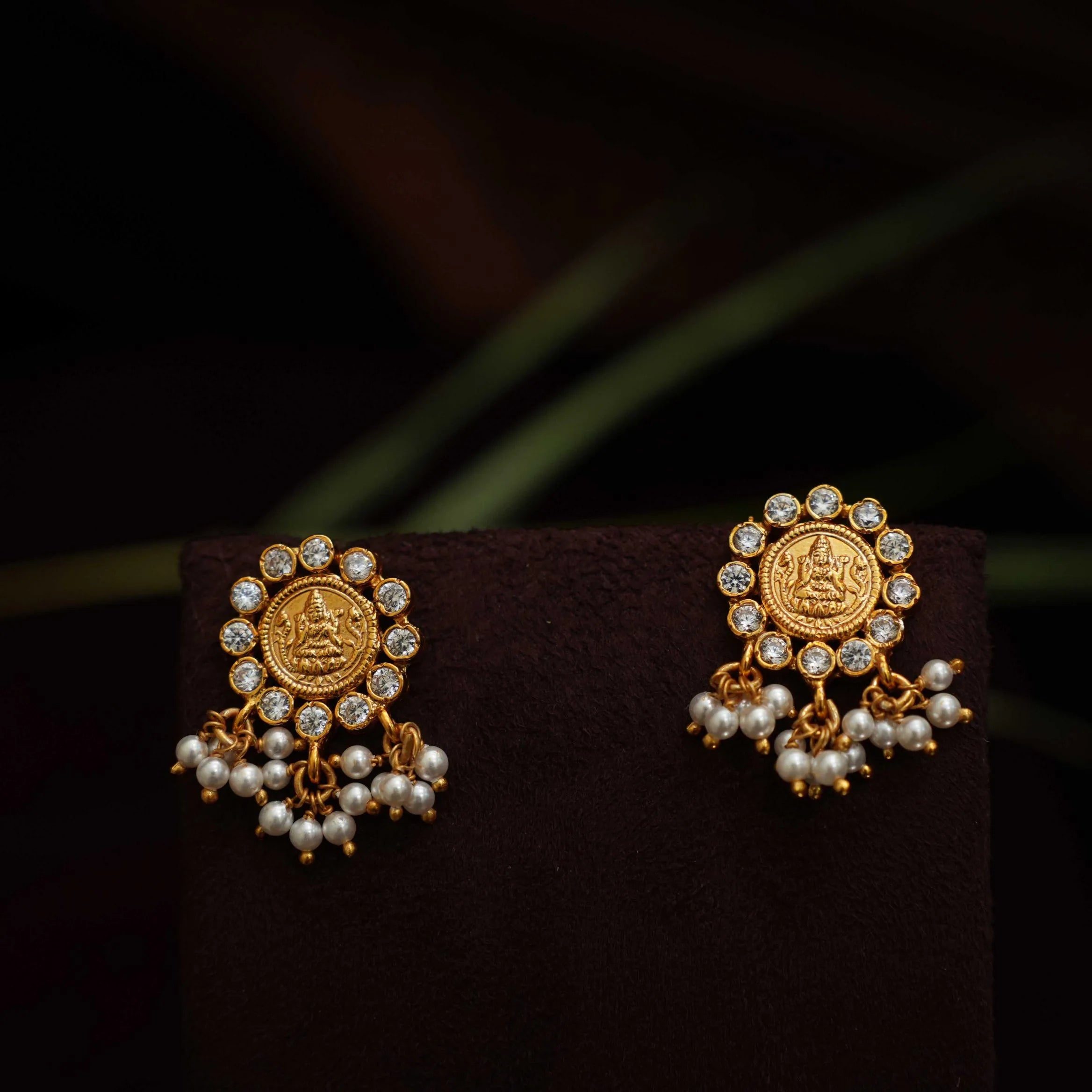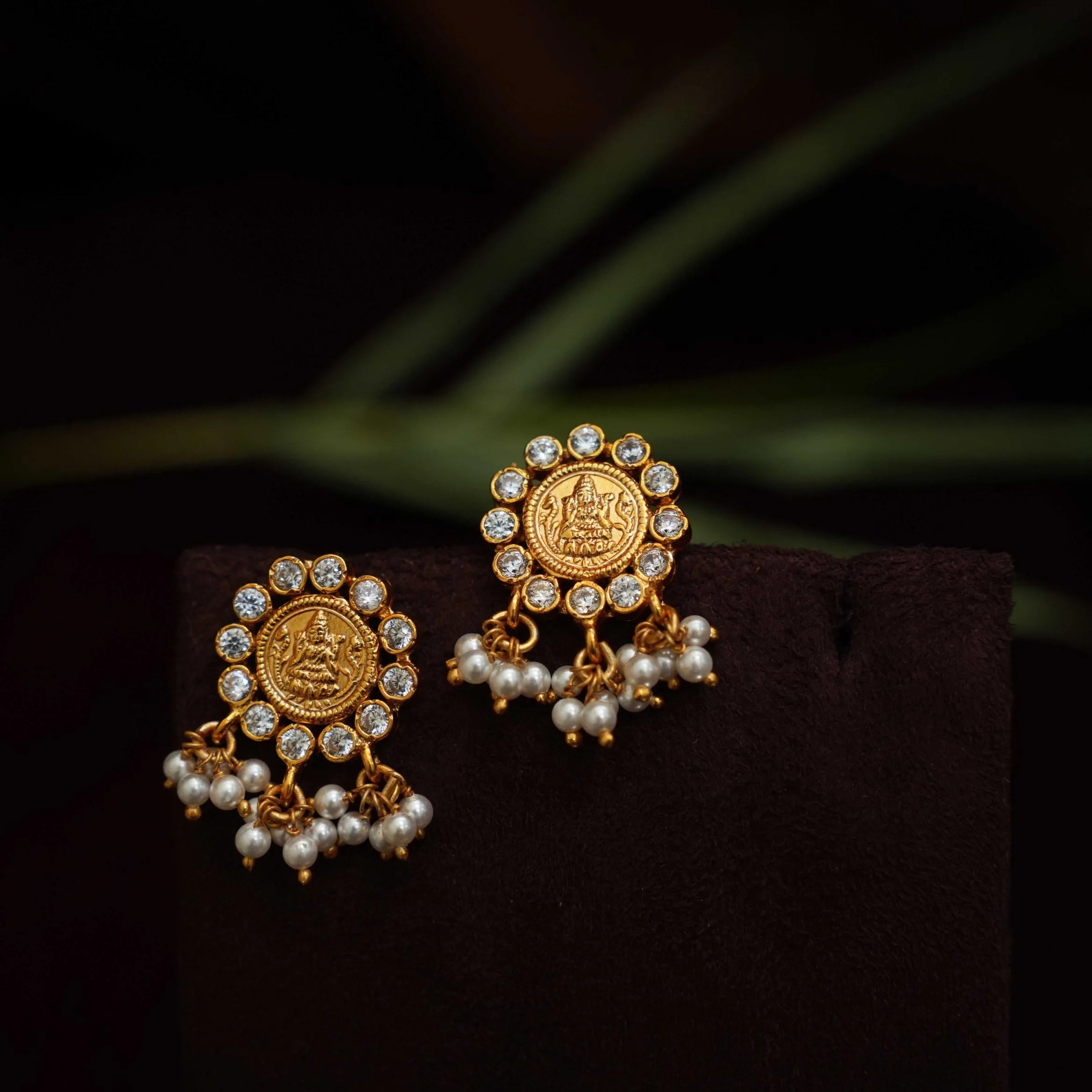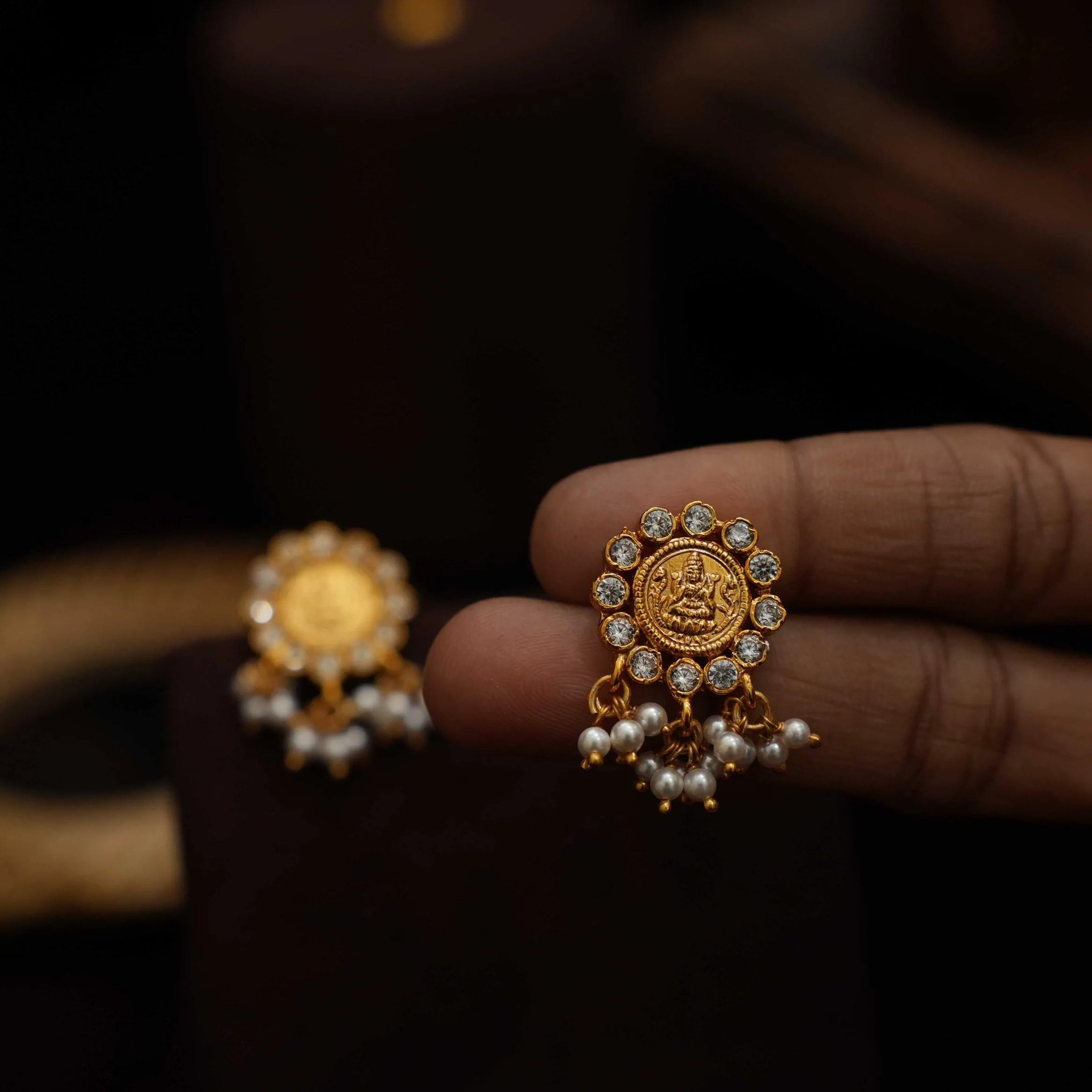 An elegant silver earrings in traditional Goddess motif adorn with pearls.