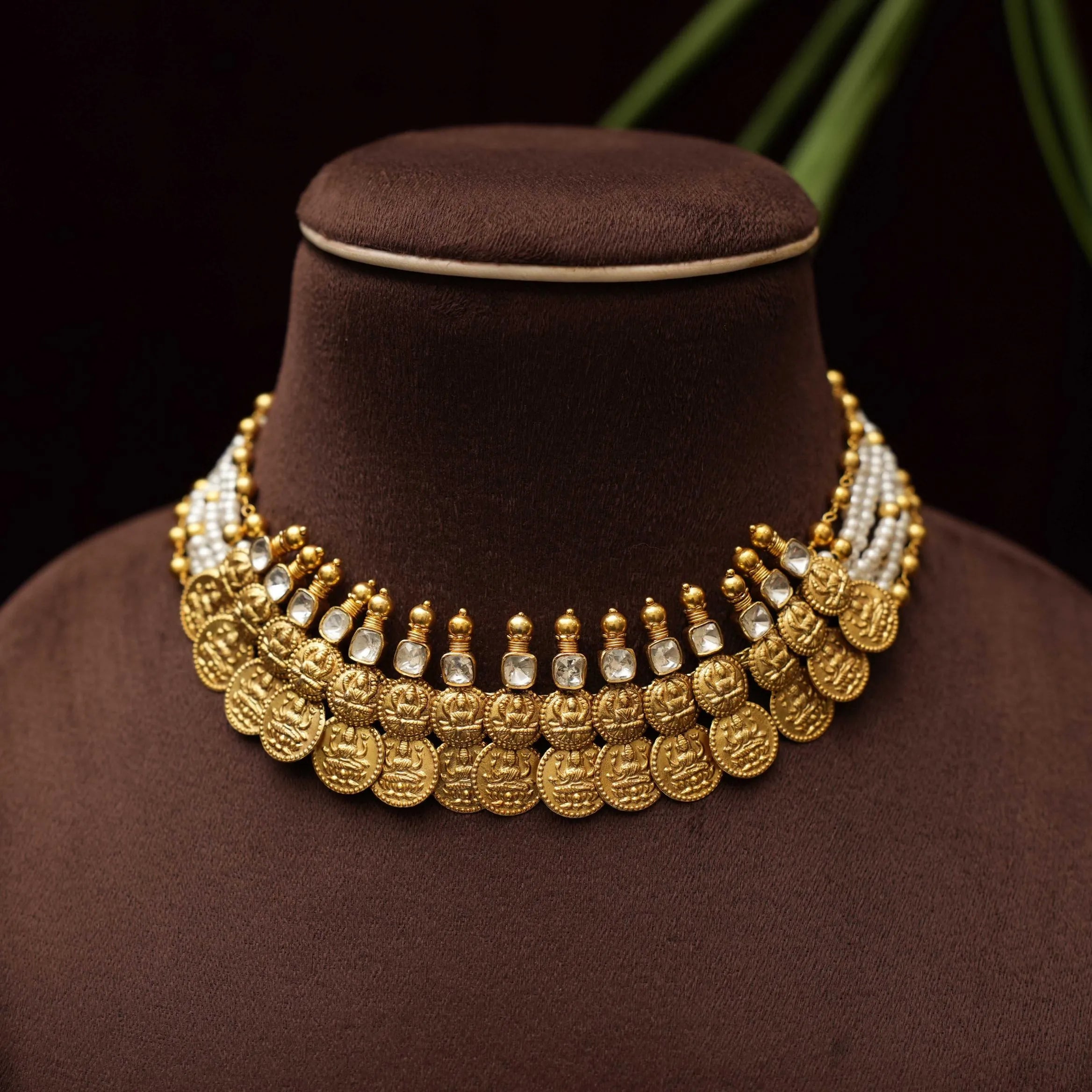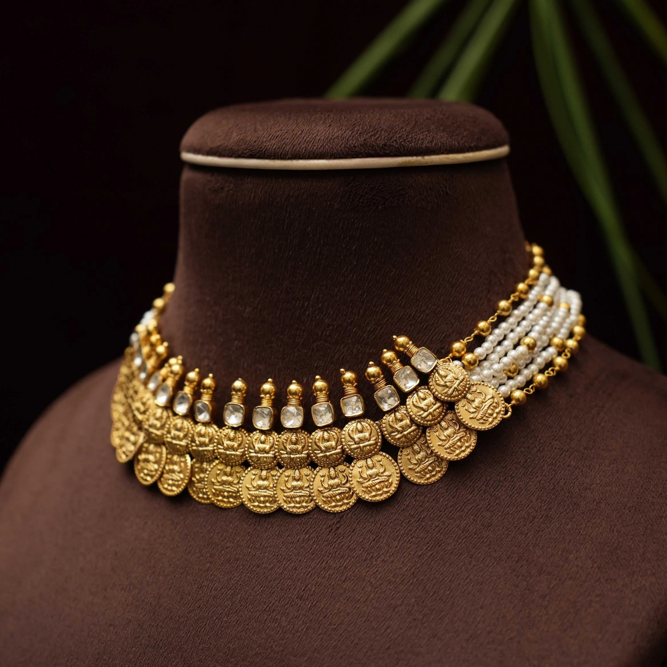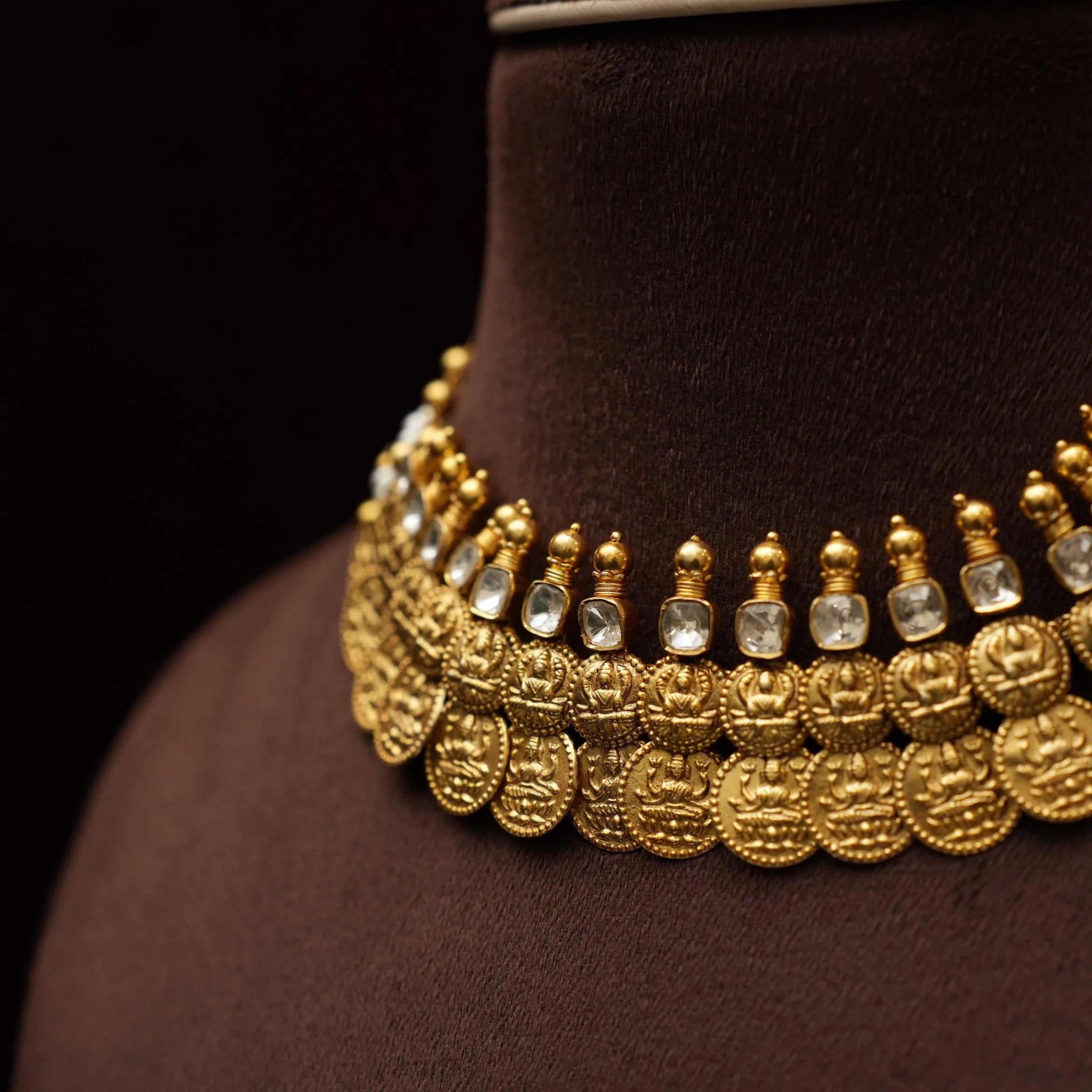 A traditional handcrafted silver necklace finished in a rich antique gold tone, featuring a cascade of coin motifs intricately linked together. Each coin bears delicate detailing, symbolizing prosperity and timeless heritage. Perfect for weddings, festive occasions, or cultural celebrations, this necklace adds a touch of regal charm to any ensemble. A versatile classic that complements both traditional and contemporary styles.