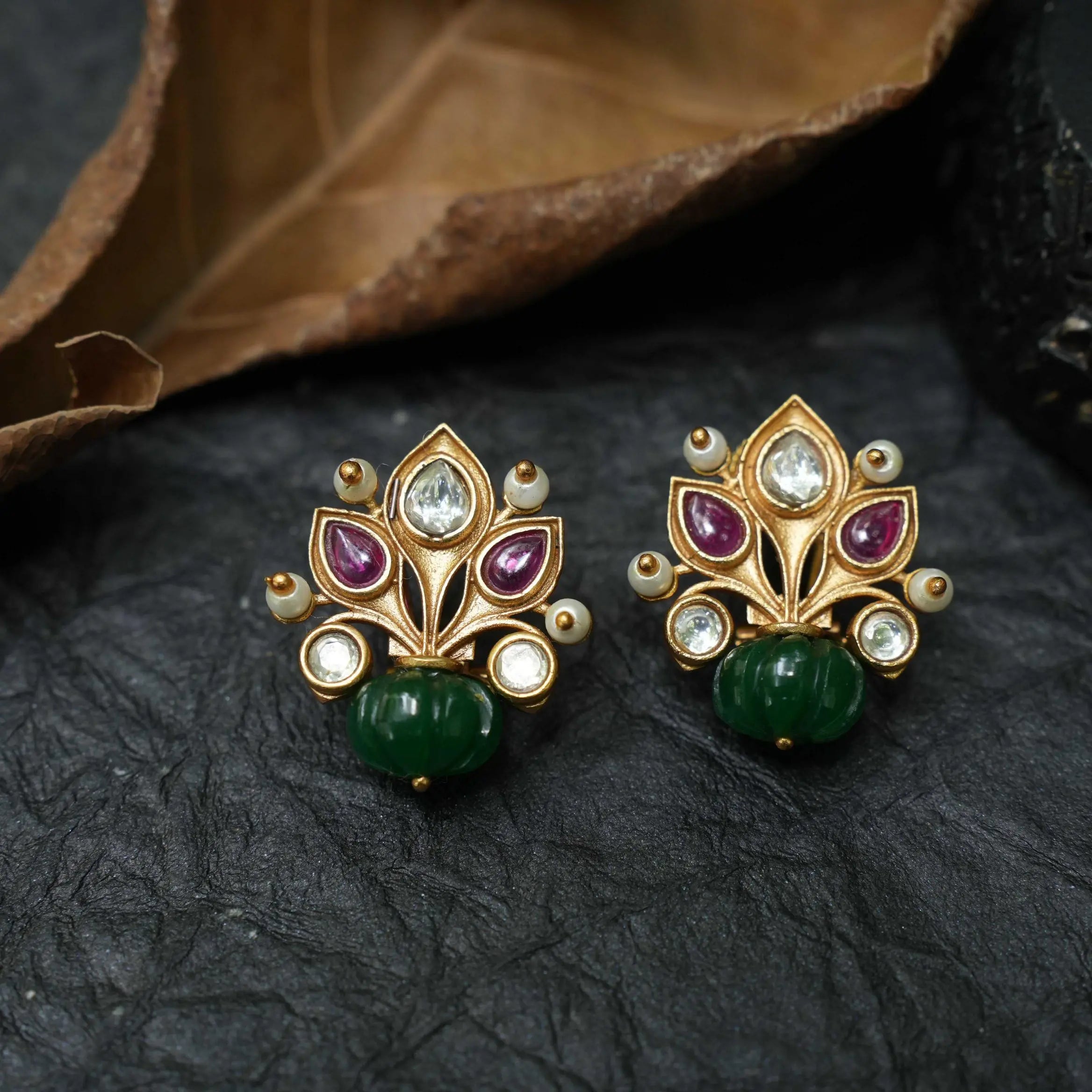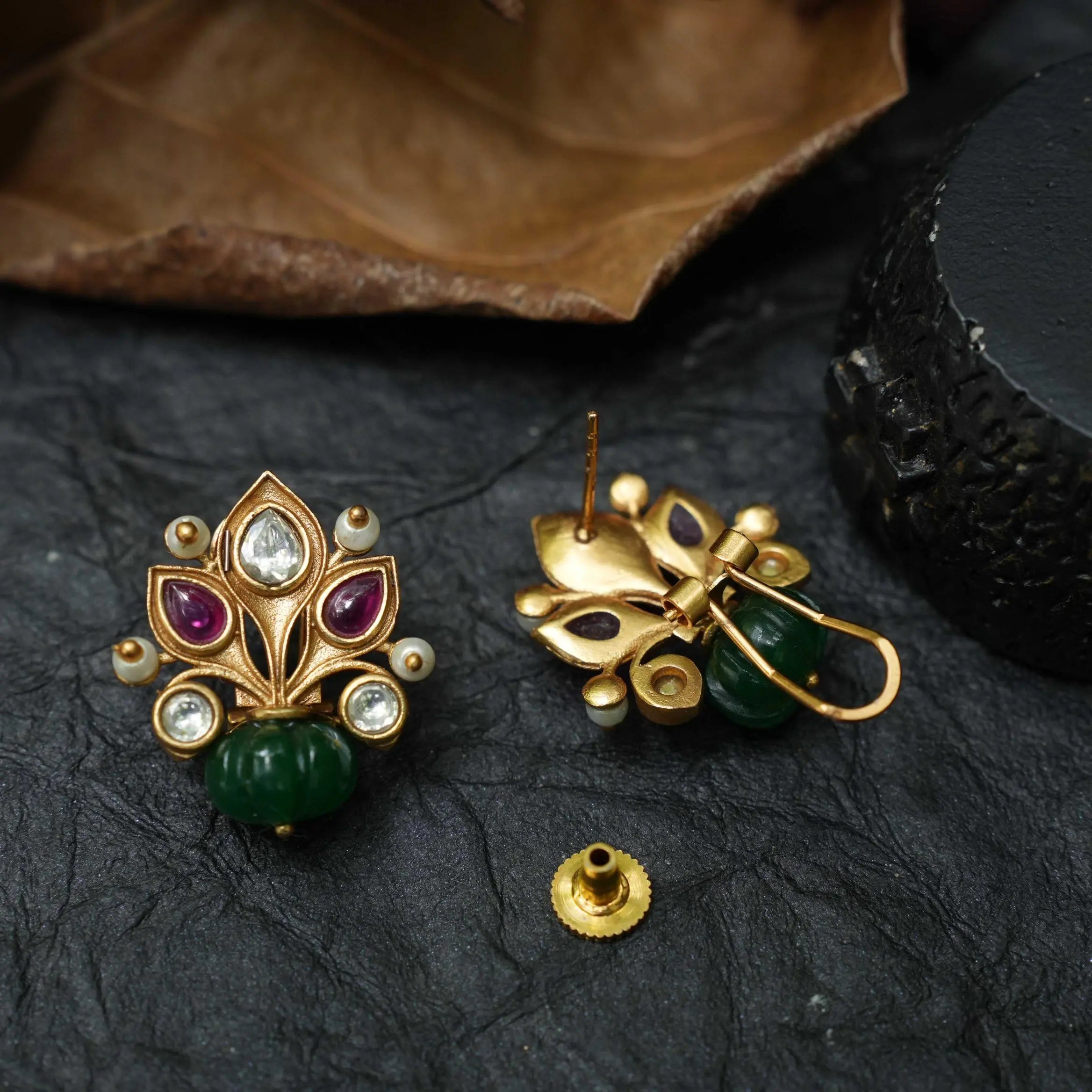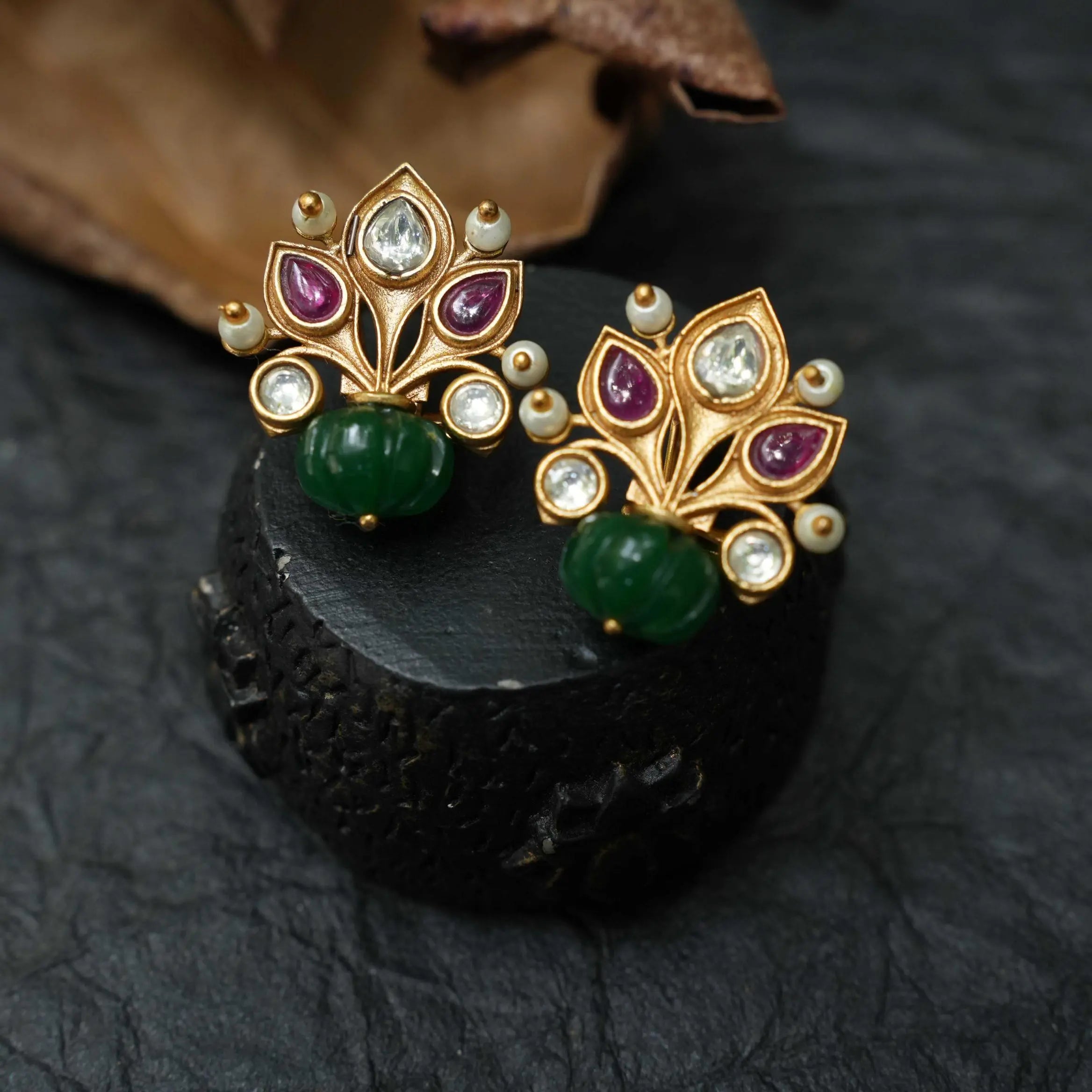 An elegant ear stud in floral motif studded with polki stones and pumpkin beads.