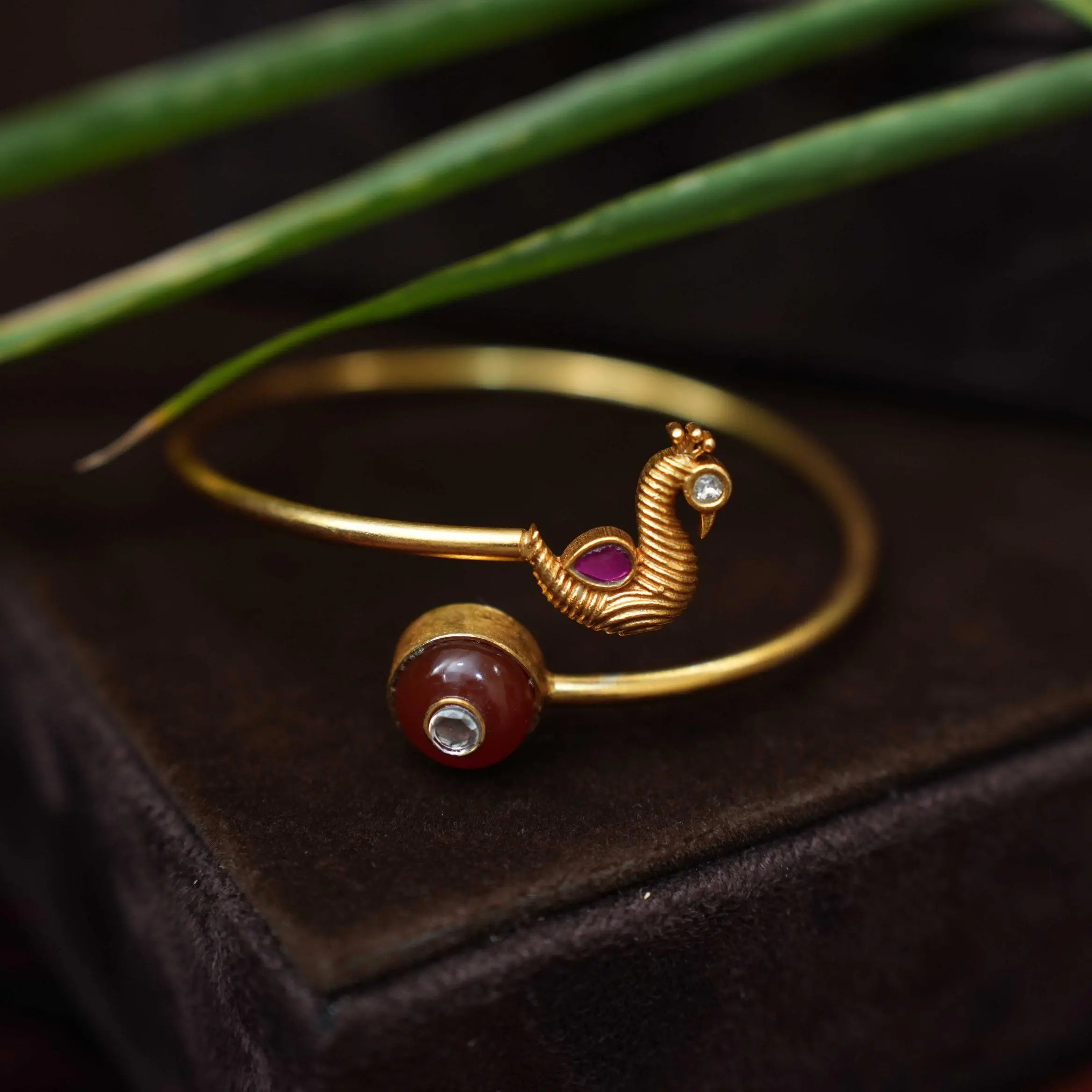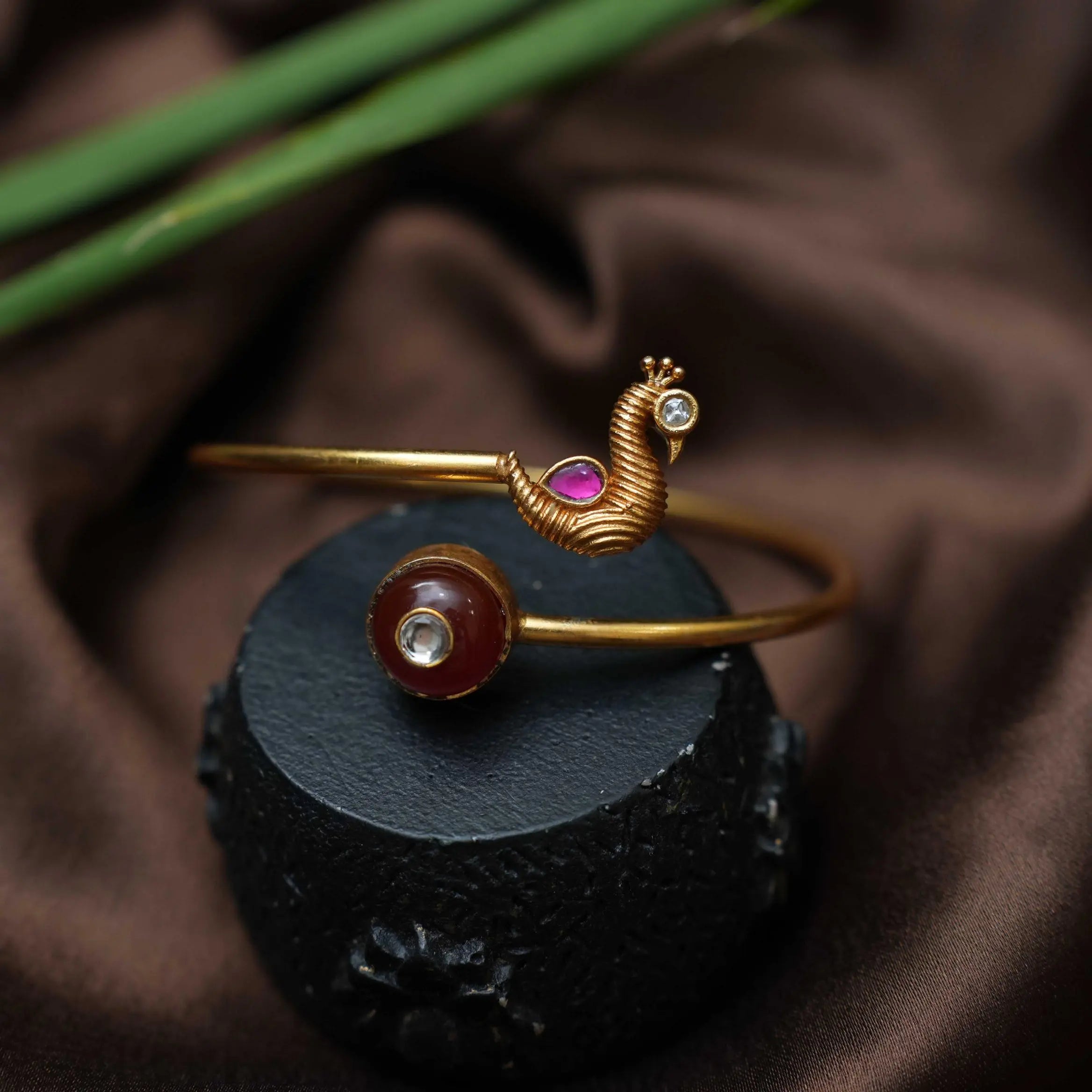A classic silver kada bangle handcrafted in annam motif studded with red stones.