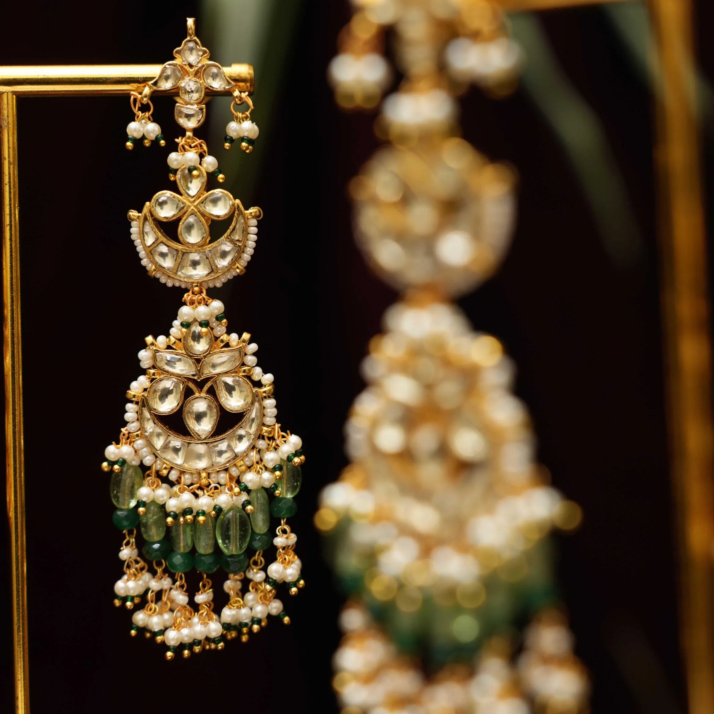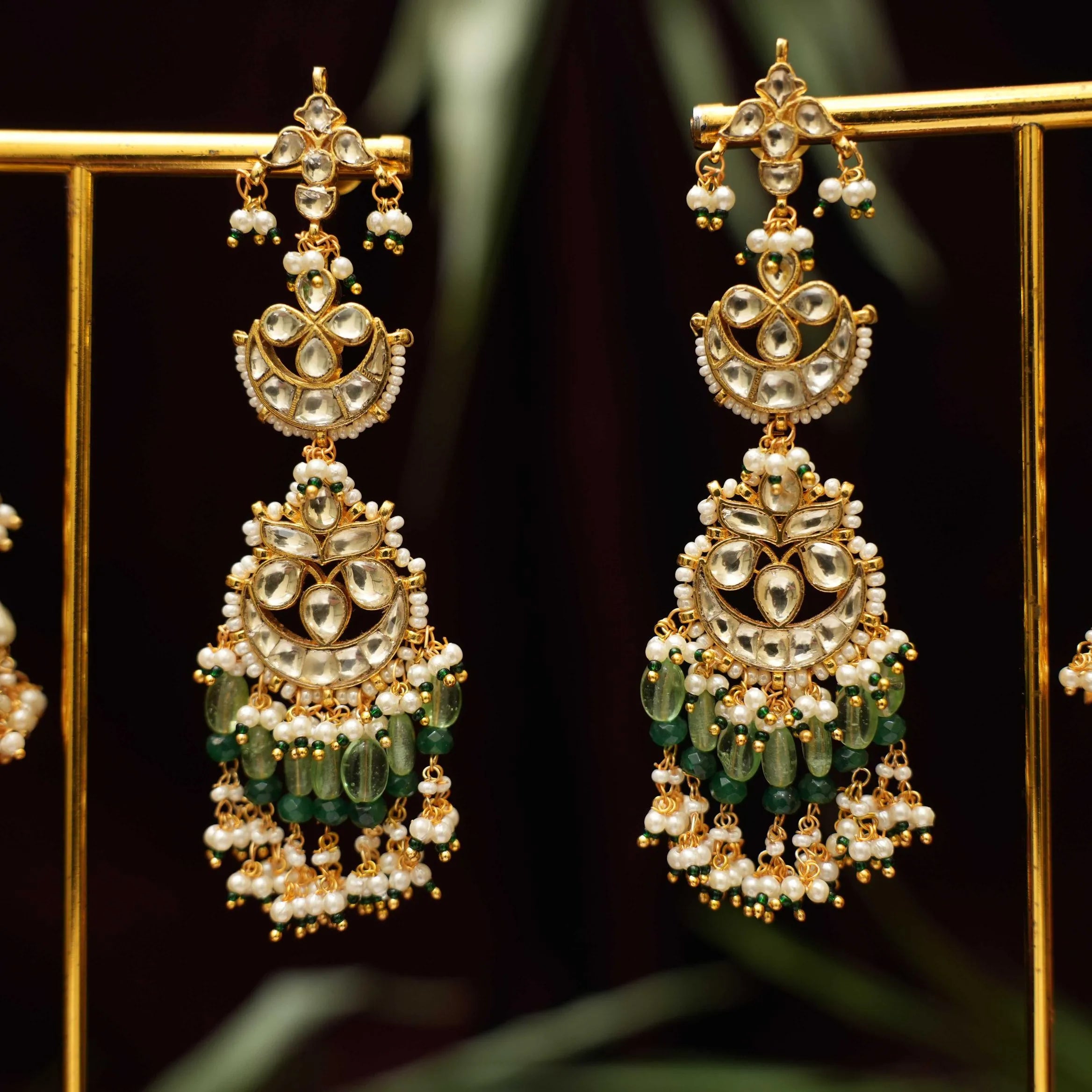 A designer earrings in chand motif studded with polki stones, pearls and beads.