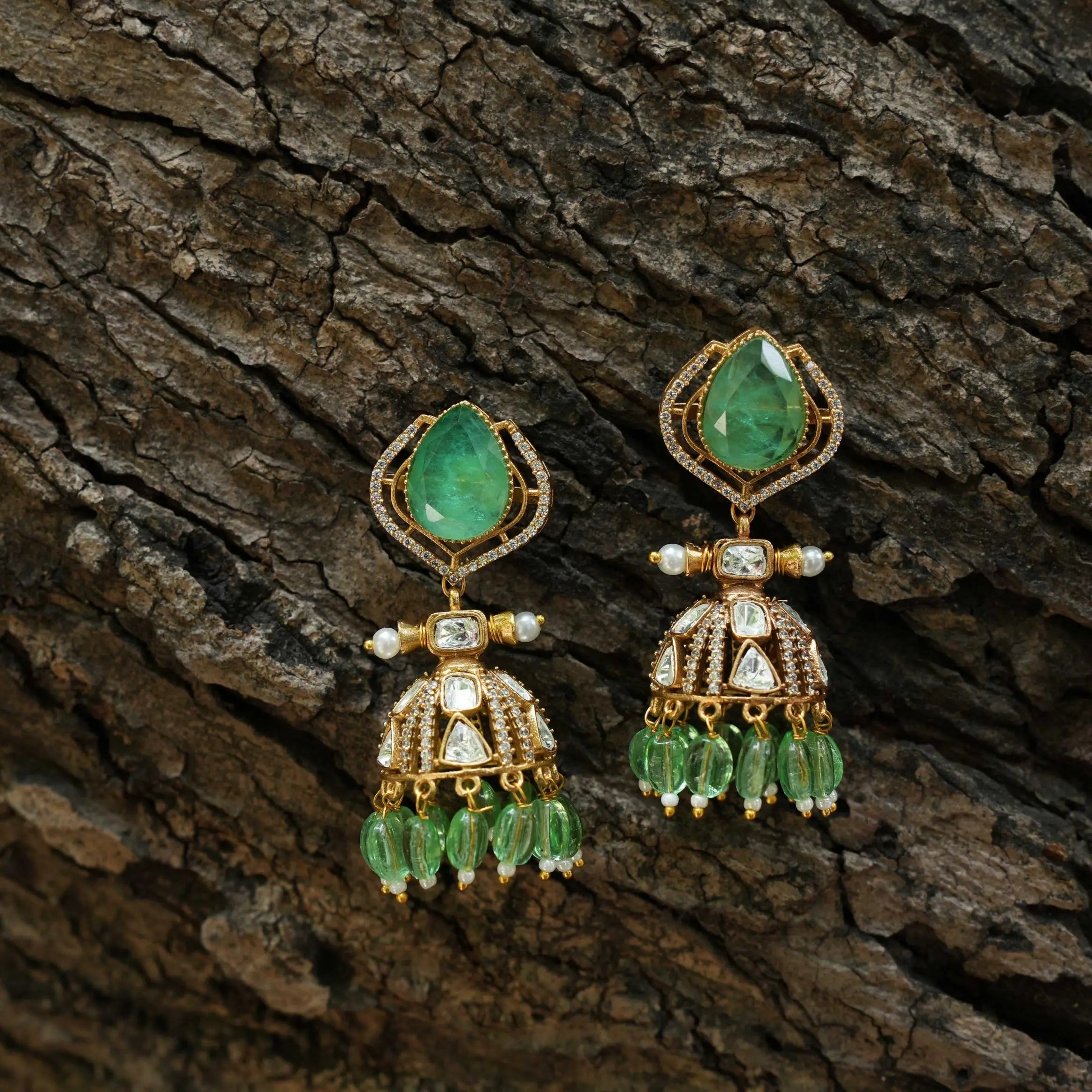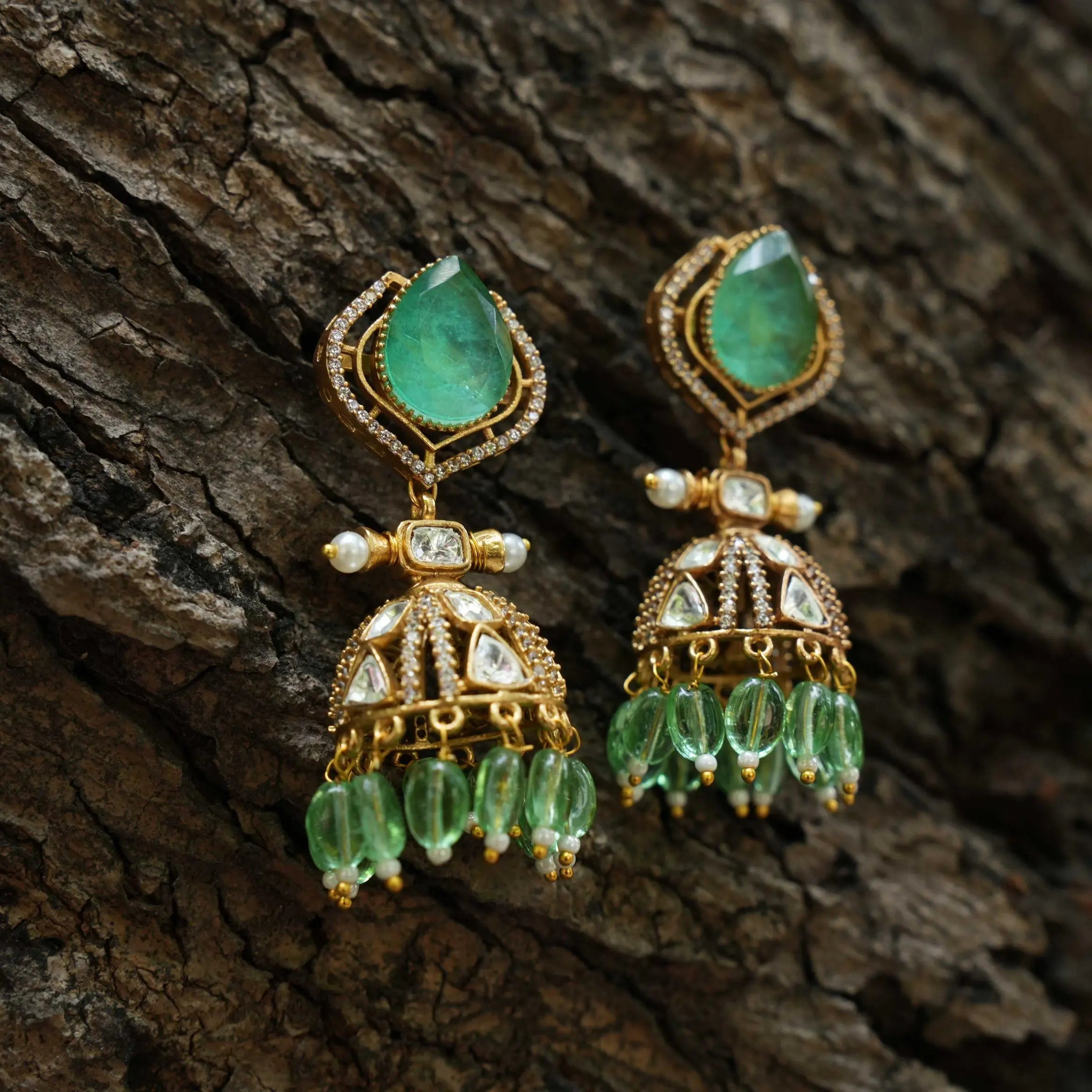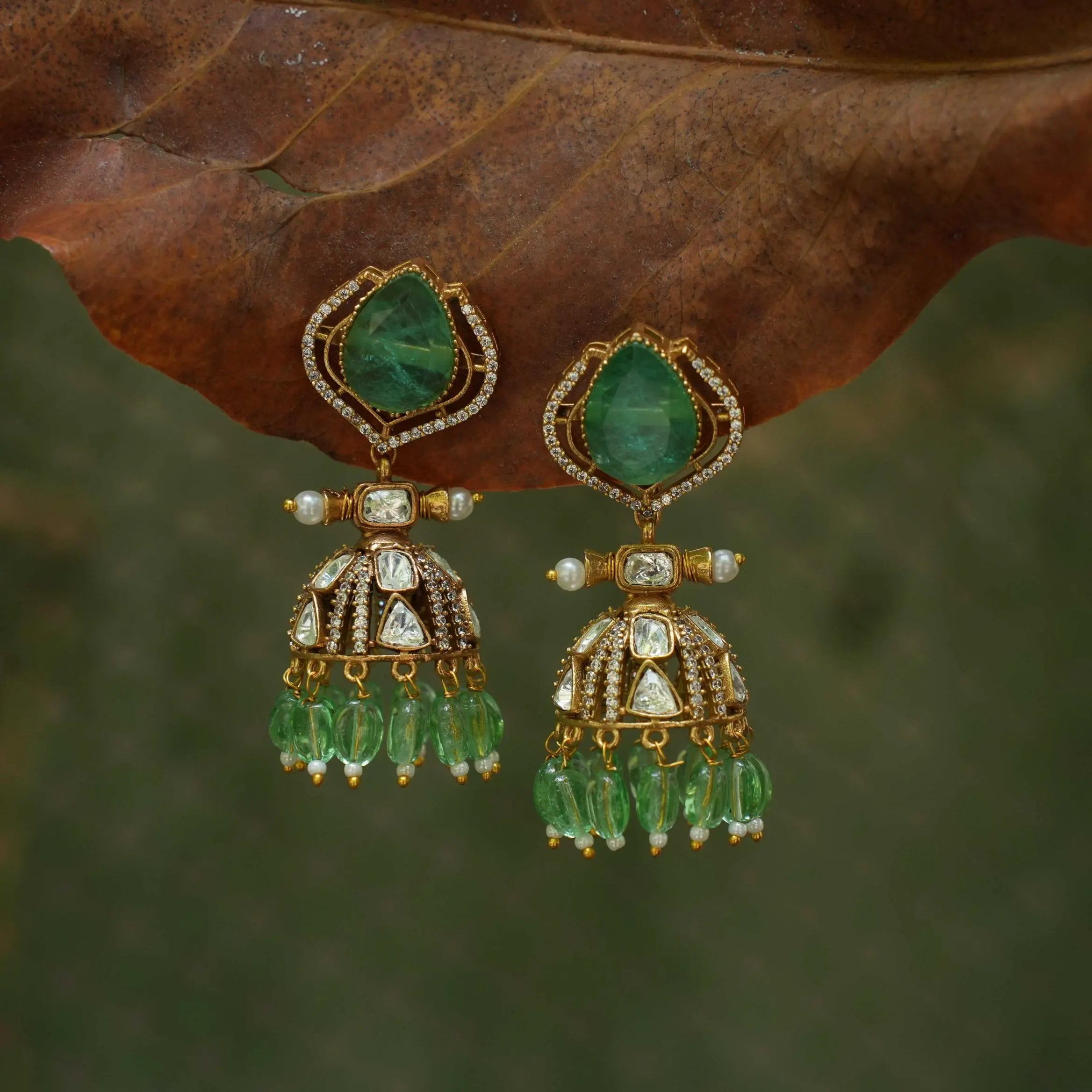 A beautiful jhumka earrings adorn with polki stones and agates, highlighted by beads and pearls.