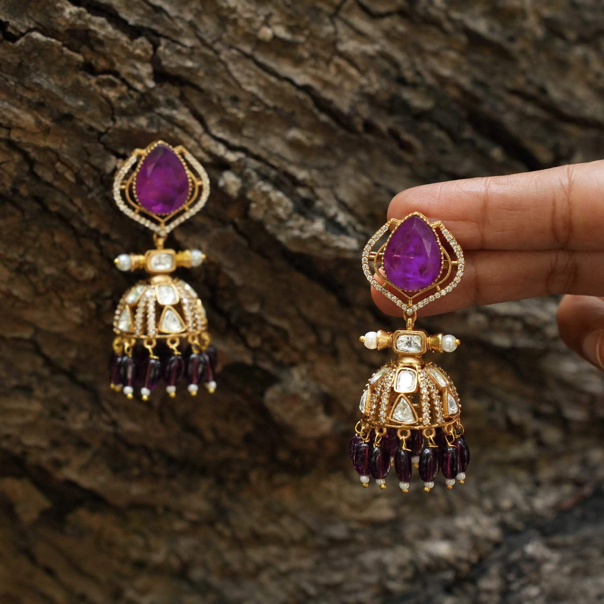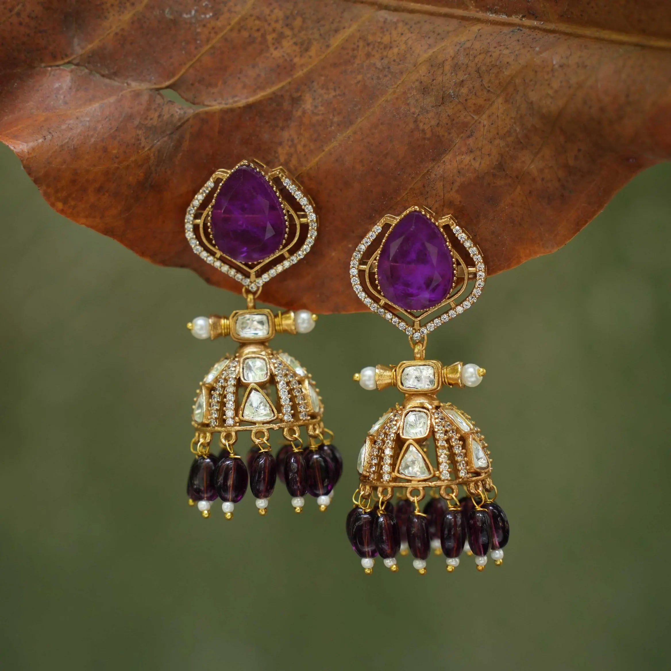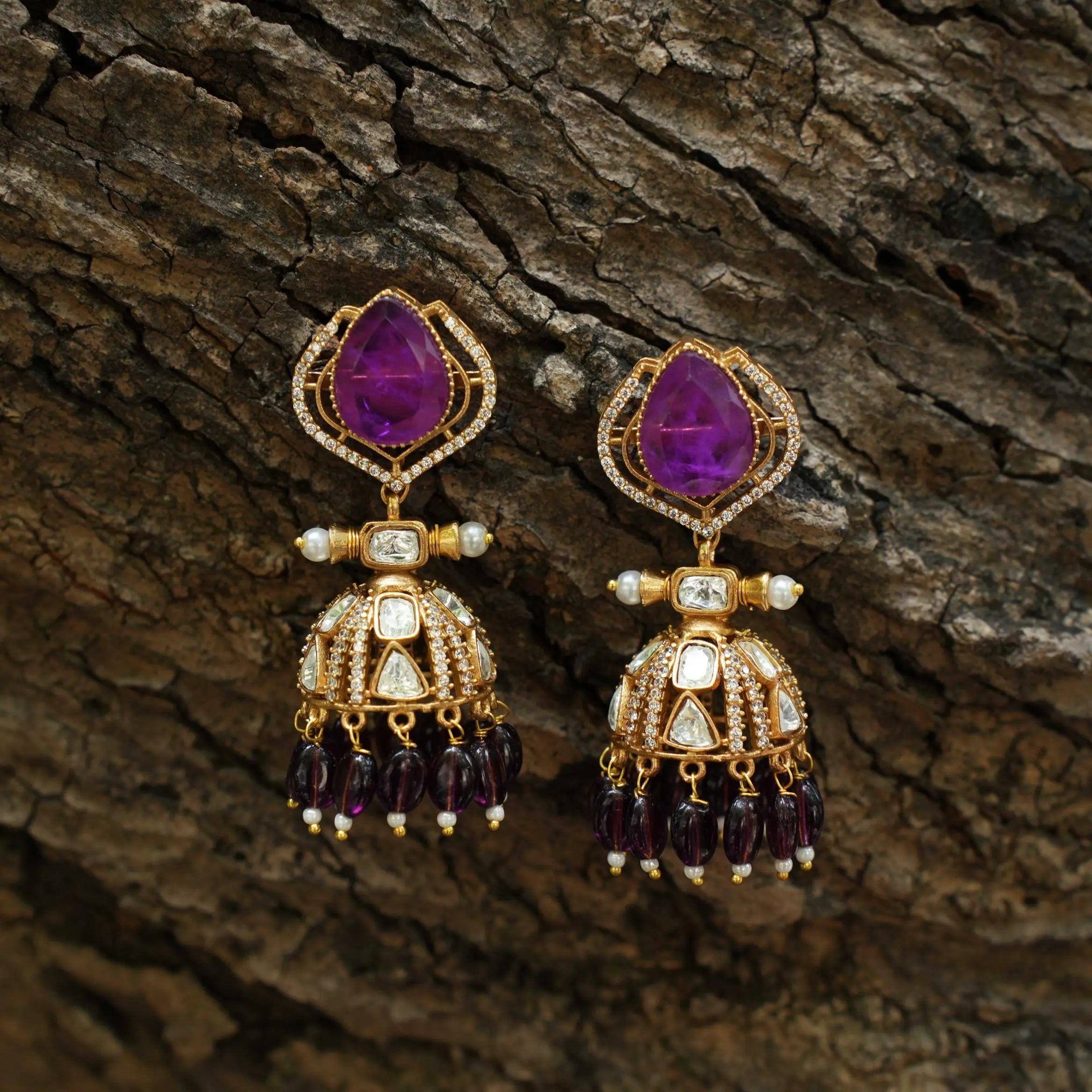 A beautiful jhumka earrings adorn with polki stones and agates highlighted by beads and pearls.