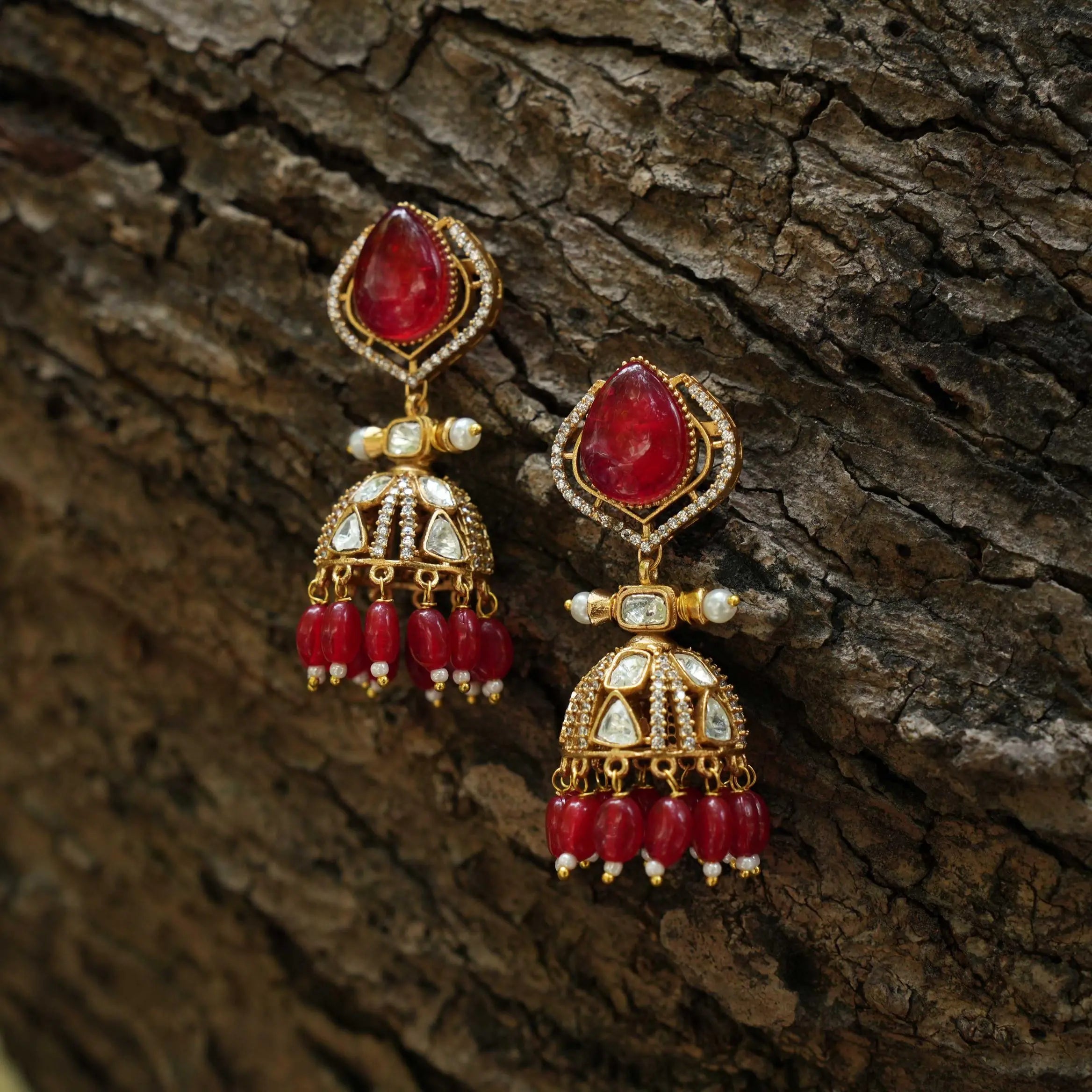 A beautiful jhumka earrings adorn with polki stones and agates highlighted by beads and pearls.