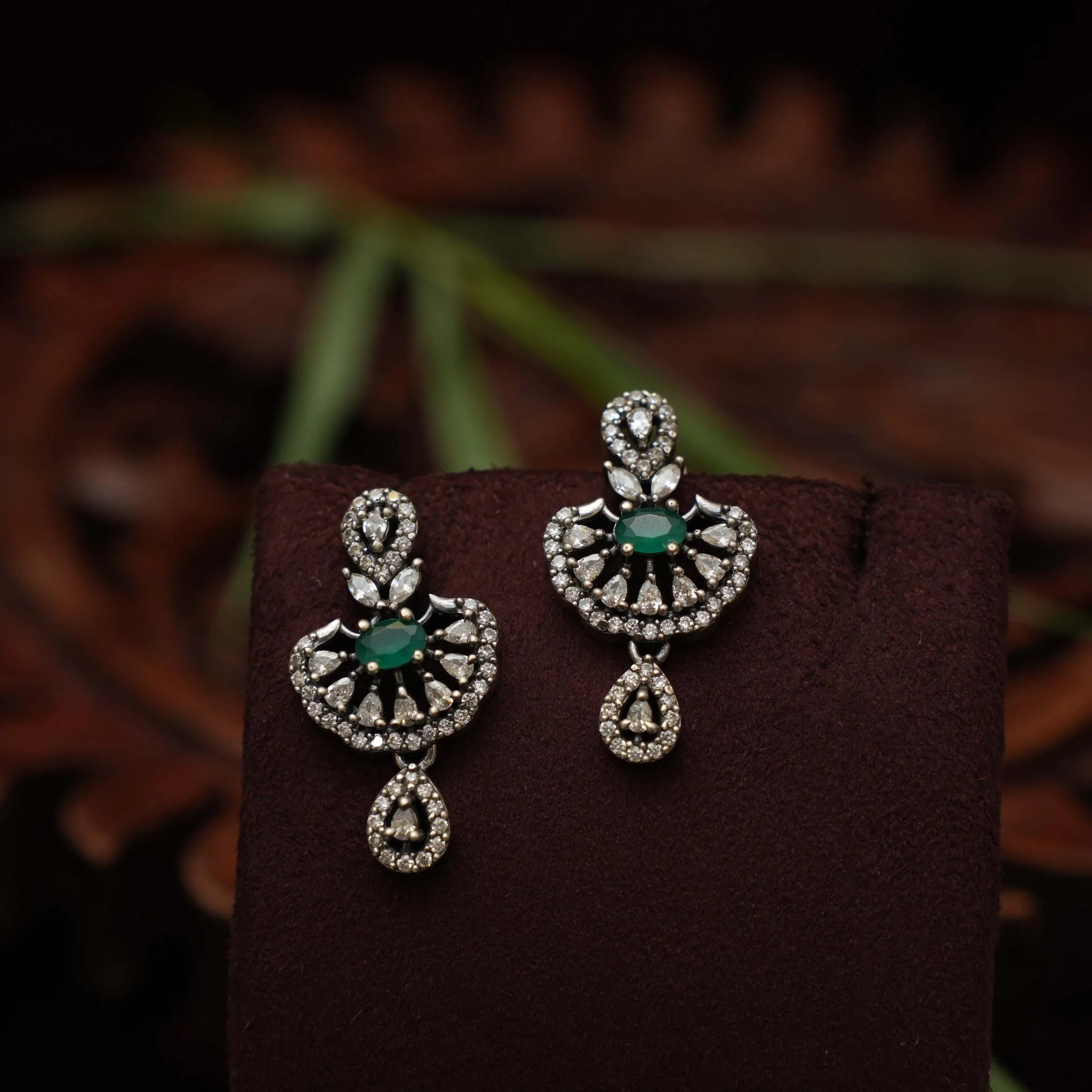 An elegant designer silver earrings adorn with green & white stones.