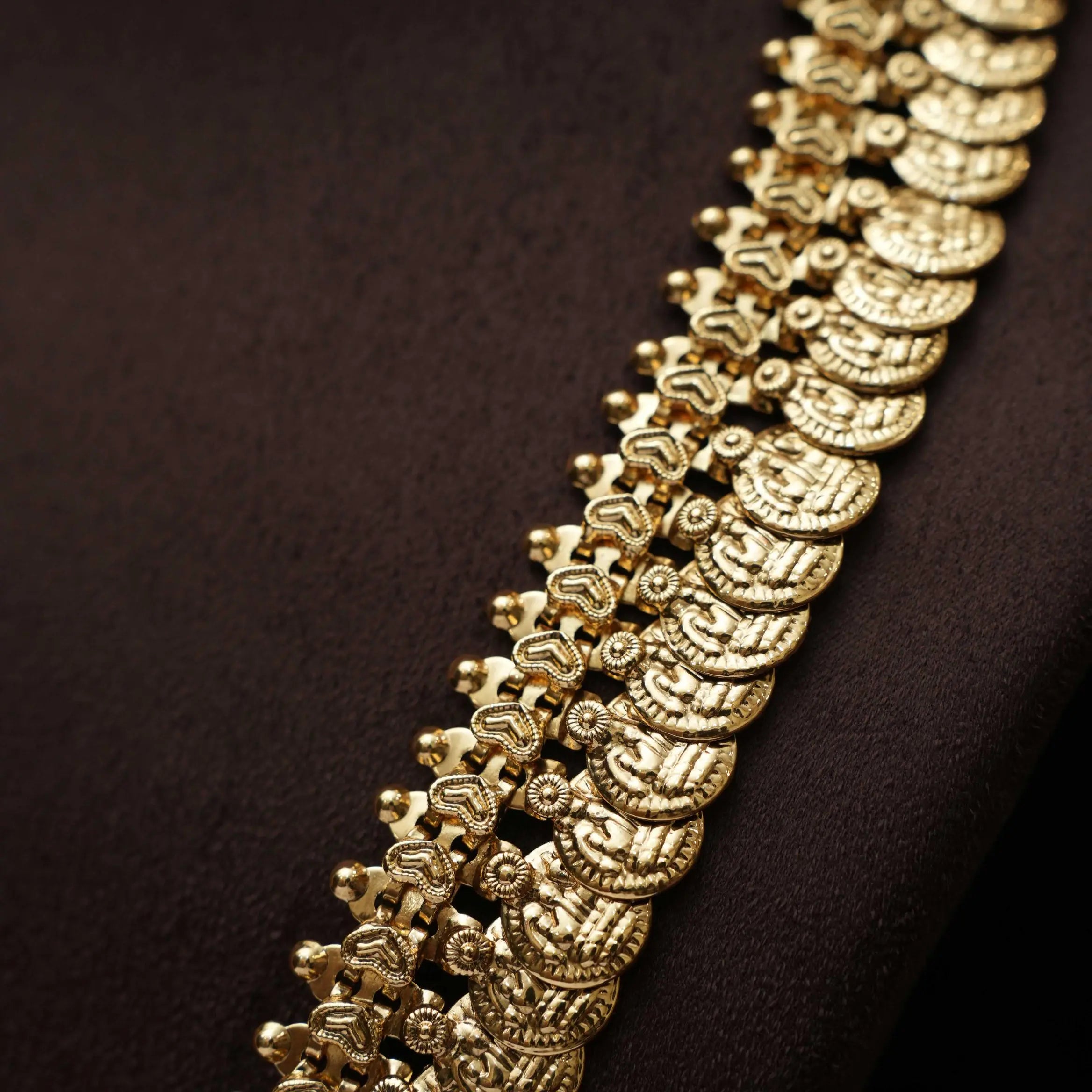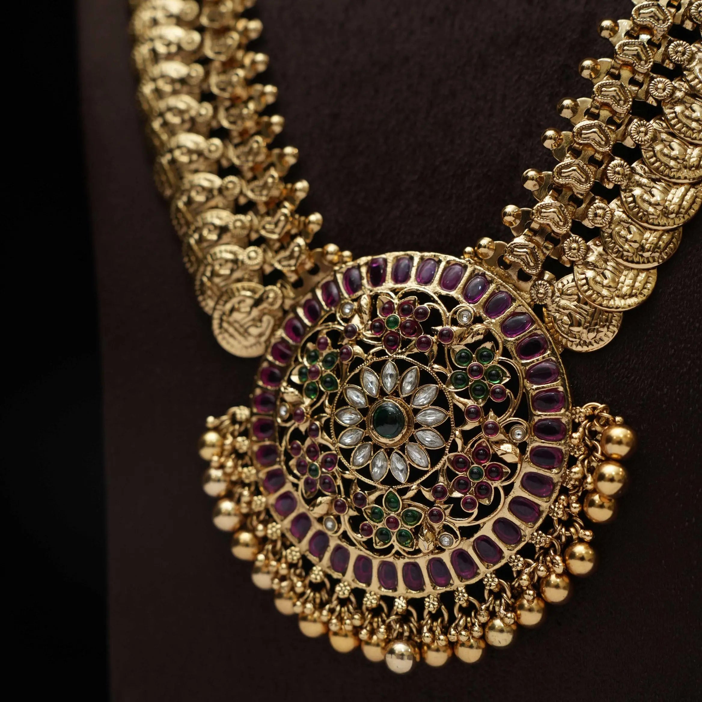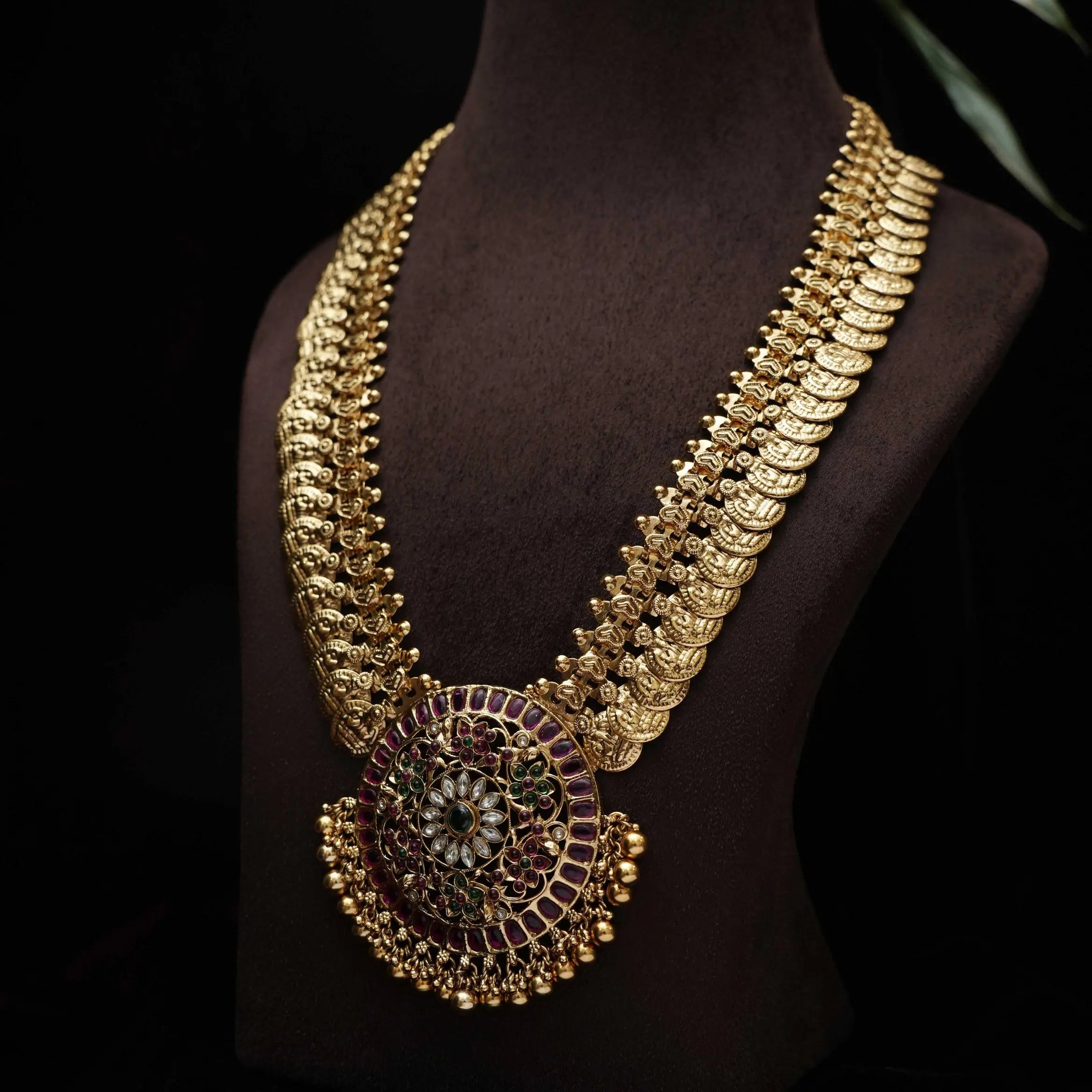 Make a bold impression with this statement antique necklace, masterfully handcrafted in a traditional coin-like pattern that radiates vintage charm. At its center rests a striking round-shaped pendant—an enduring symbol of harmony and divine grace—adorned with radiant kemp stones that infuse a regal touch of color and brilliance.
