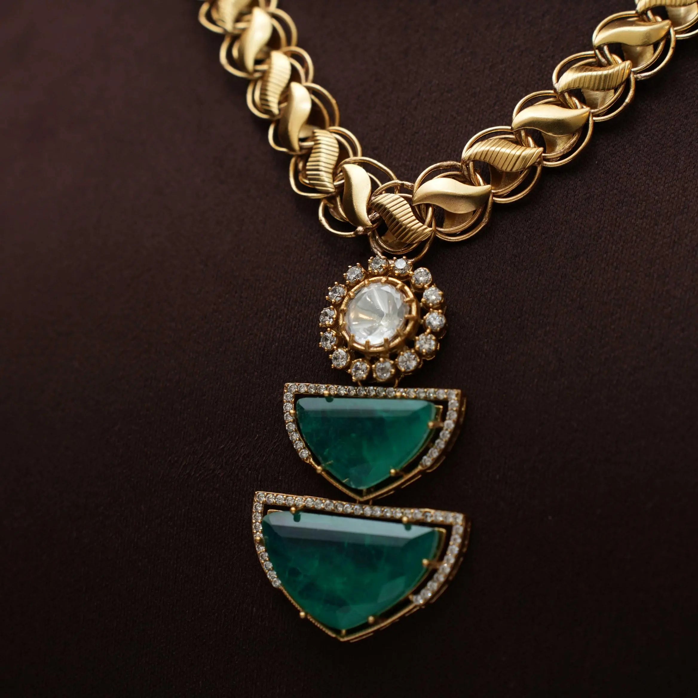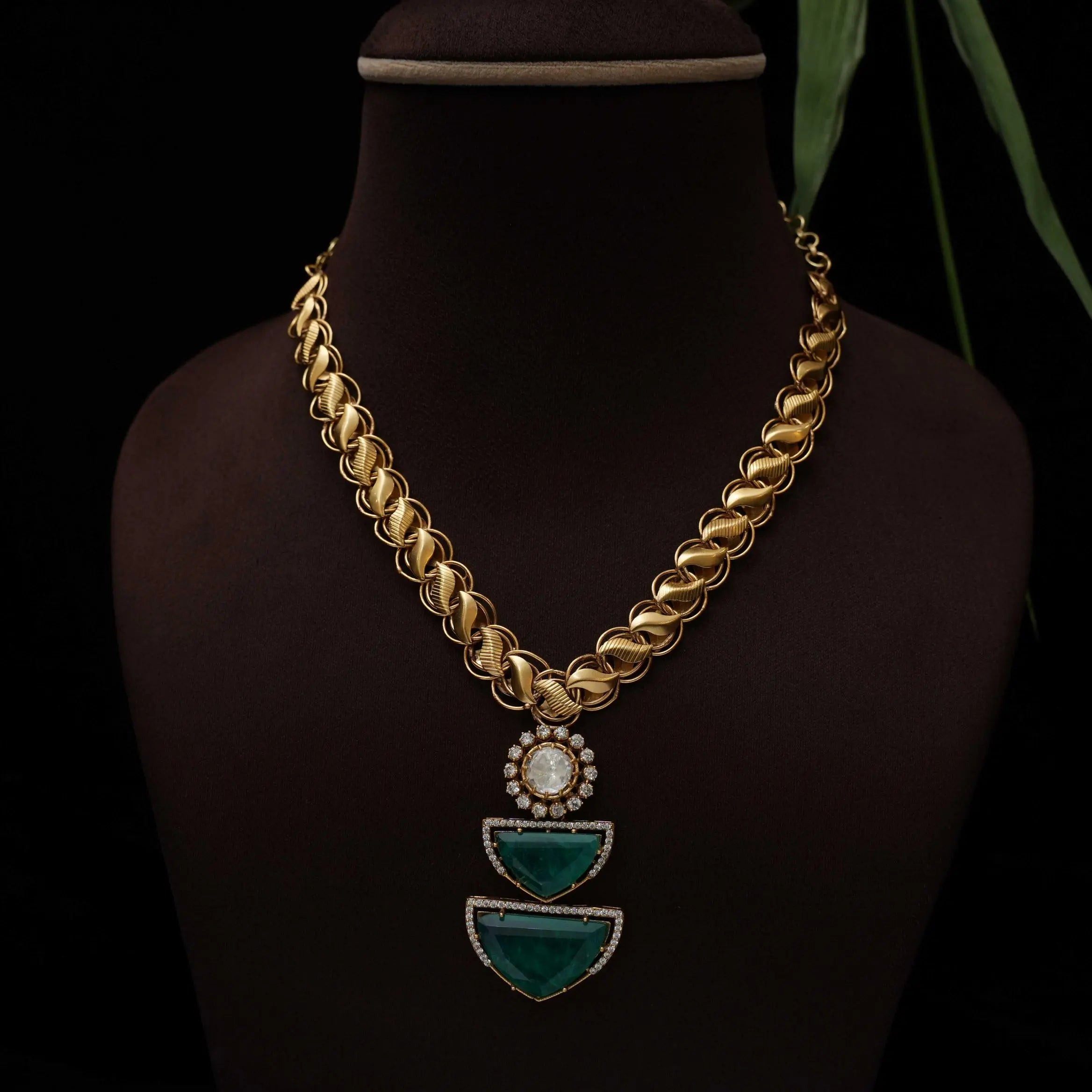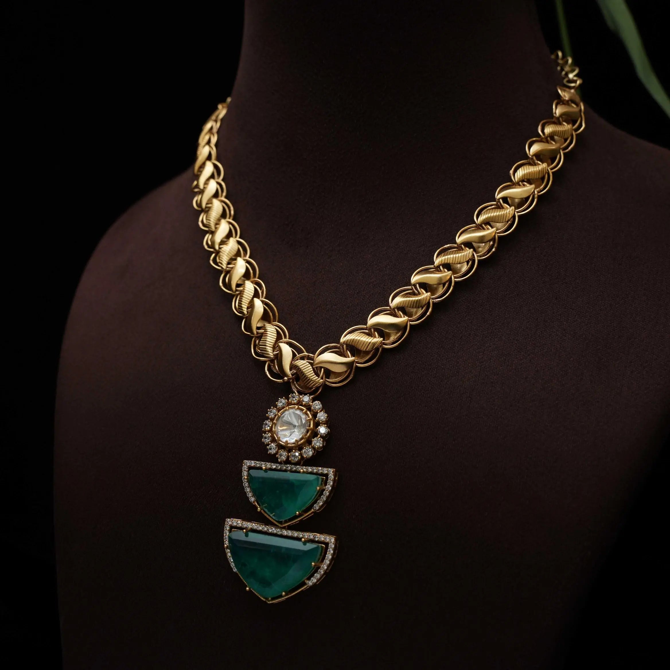 Elevate your style with this exquisite handcrafted designer necklace set. The centerpiece features a stunning pendant adorned with polki stones and agate, creating a rich blend of traditional charm and contemporary elegance. Paired with a delicate yet durable chain, the necklace is both eye-catching and graceful. This set is completed with a pair of matching earrings.