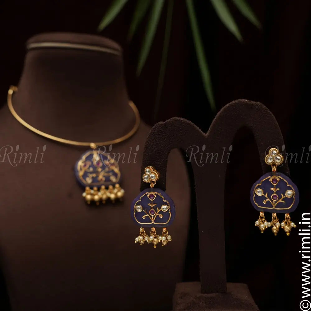 A simple & elegant hasli necklace paired to work of art meenakari pendant. This set comes with a pair of earrings.