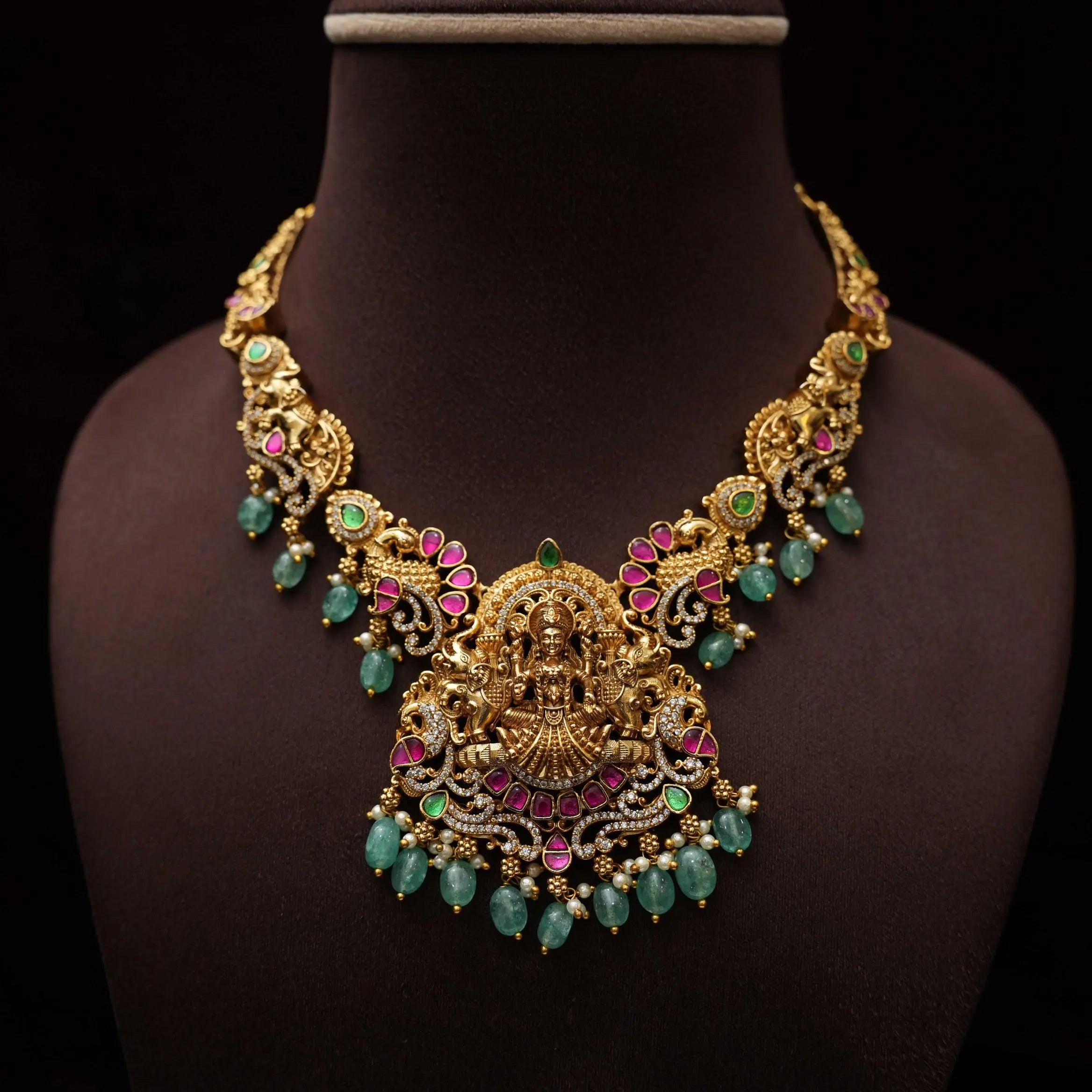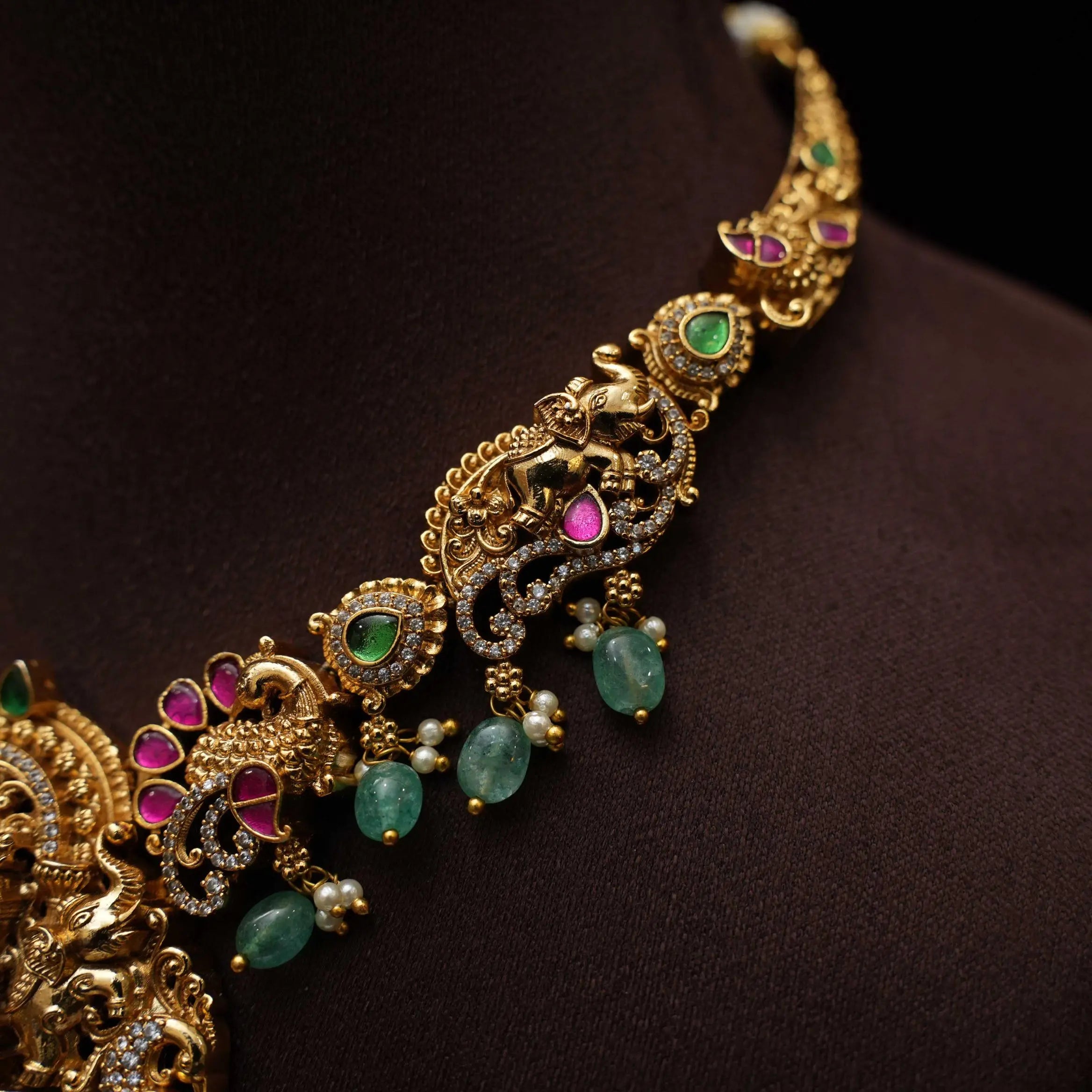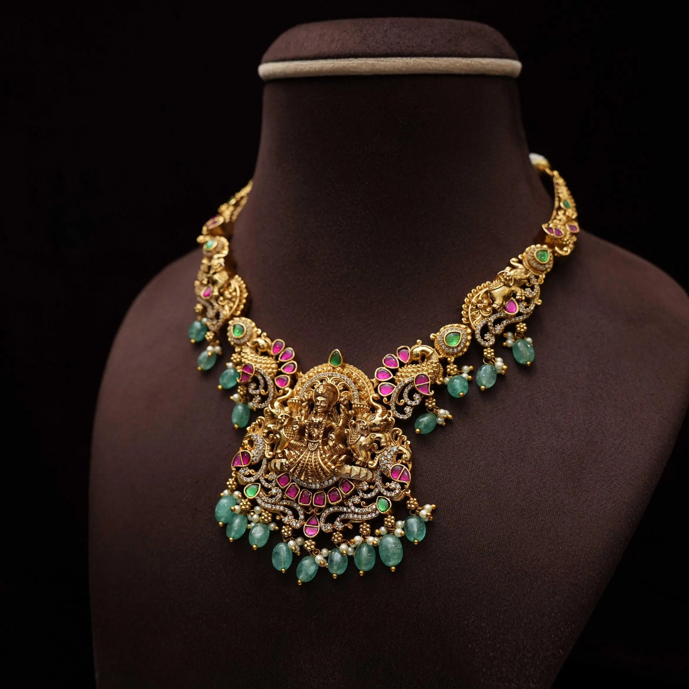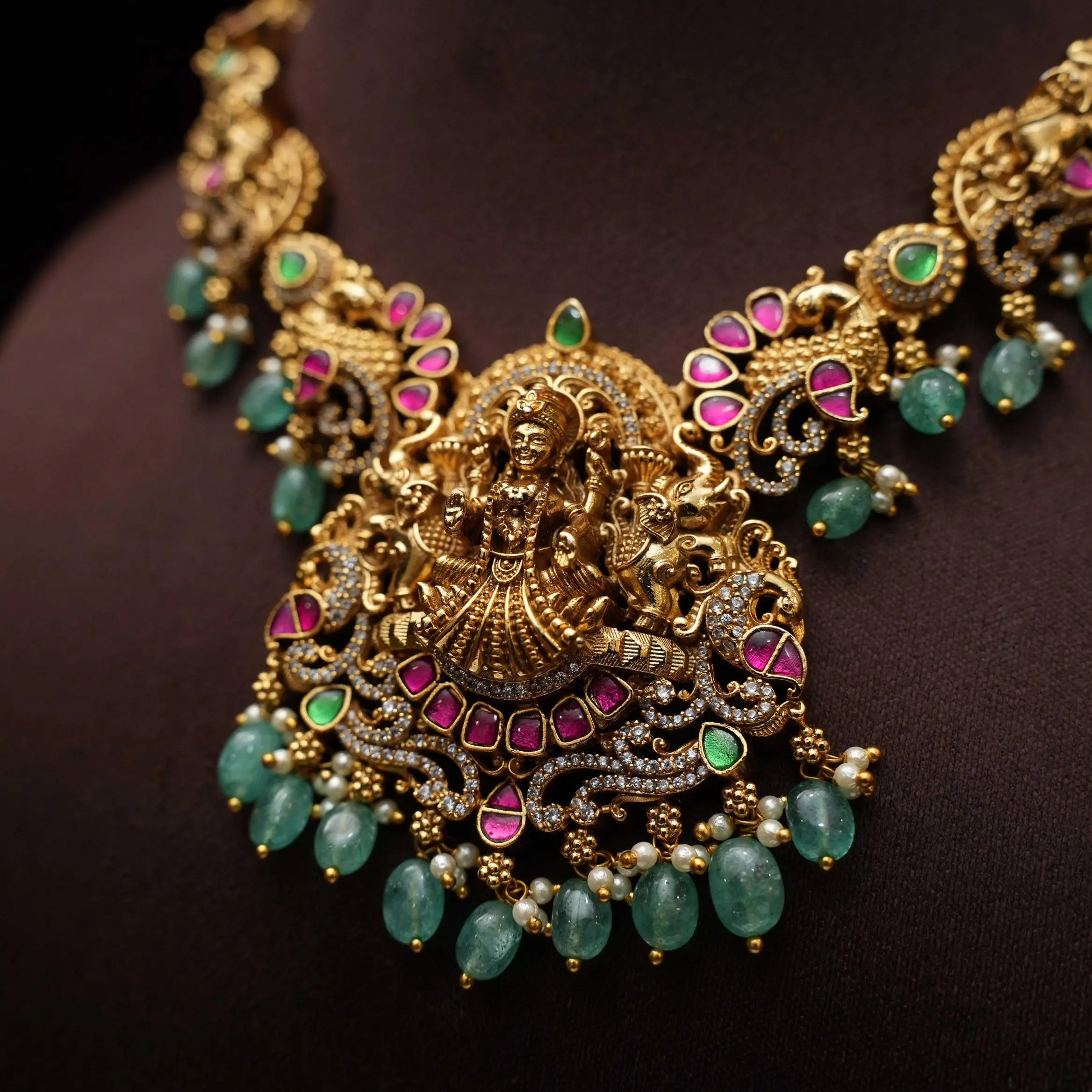 Make a regal impression with this statement antique necklace, expertly handcrafted in intricate Goddess and peacock motifs. Embellished with radiant kemp stones, the design is further adorned with soft pastel green beads and delicate cluster pearls, adding a touch of elegance and grace.