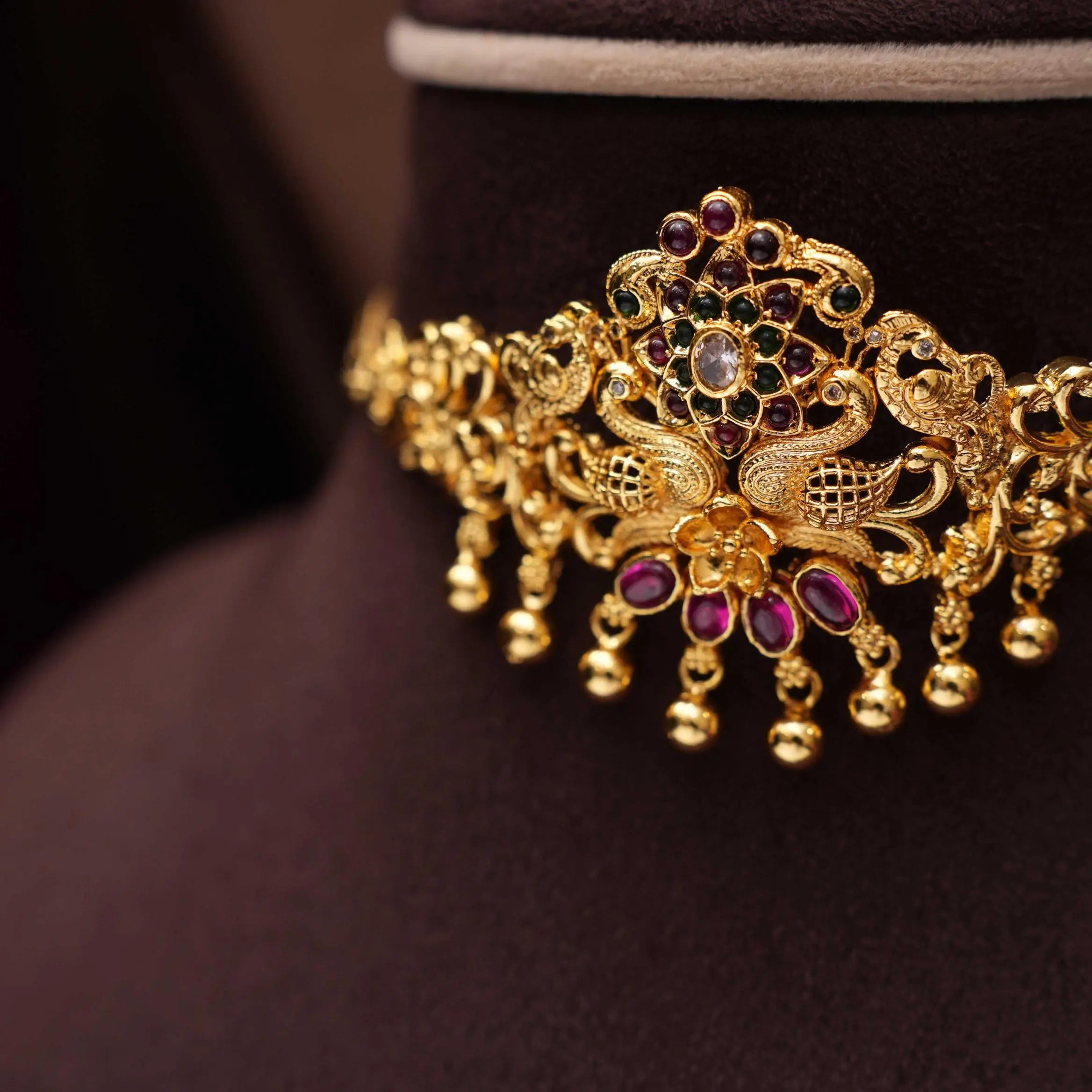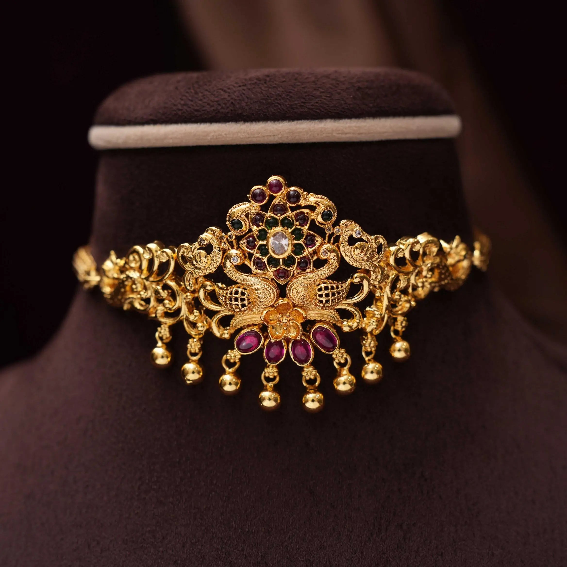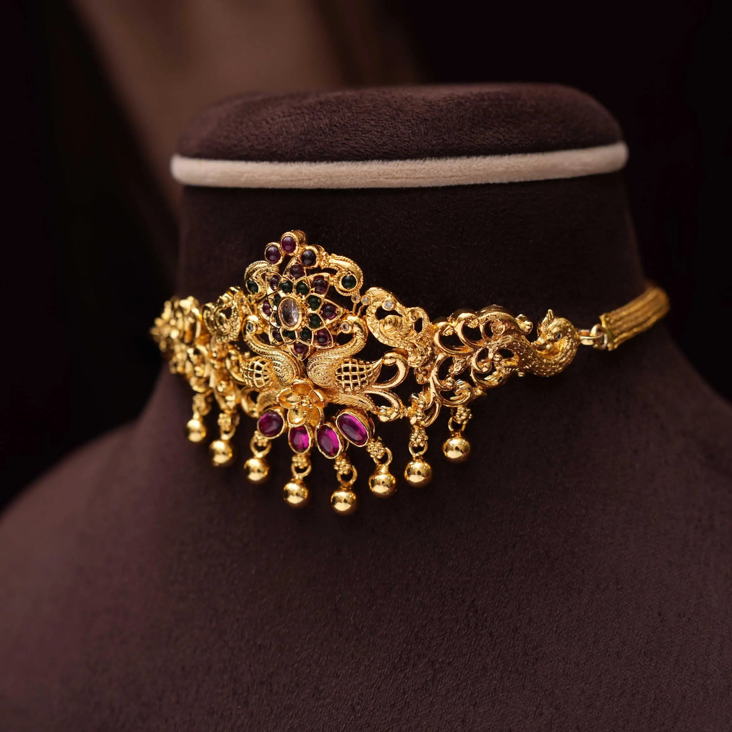 Drape yourself in opulence with our beautiful 92.5 gold-plated silver choker, meticulously crafted with the richness of kemp stones. This stunning piece seamlessly marries traditional allure with a touch of contemporary glamour, adding an exquisite accent to your ensemble.