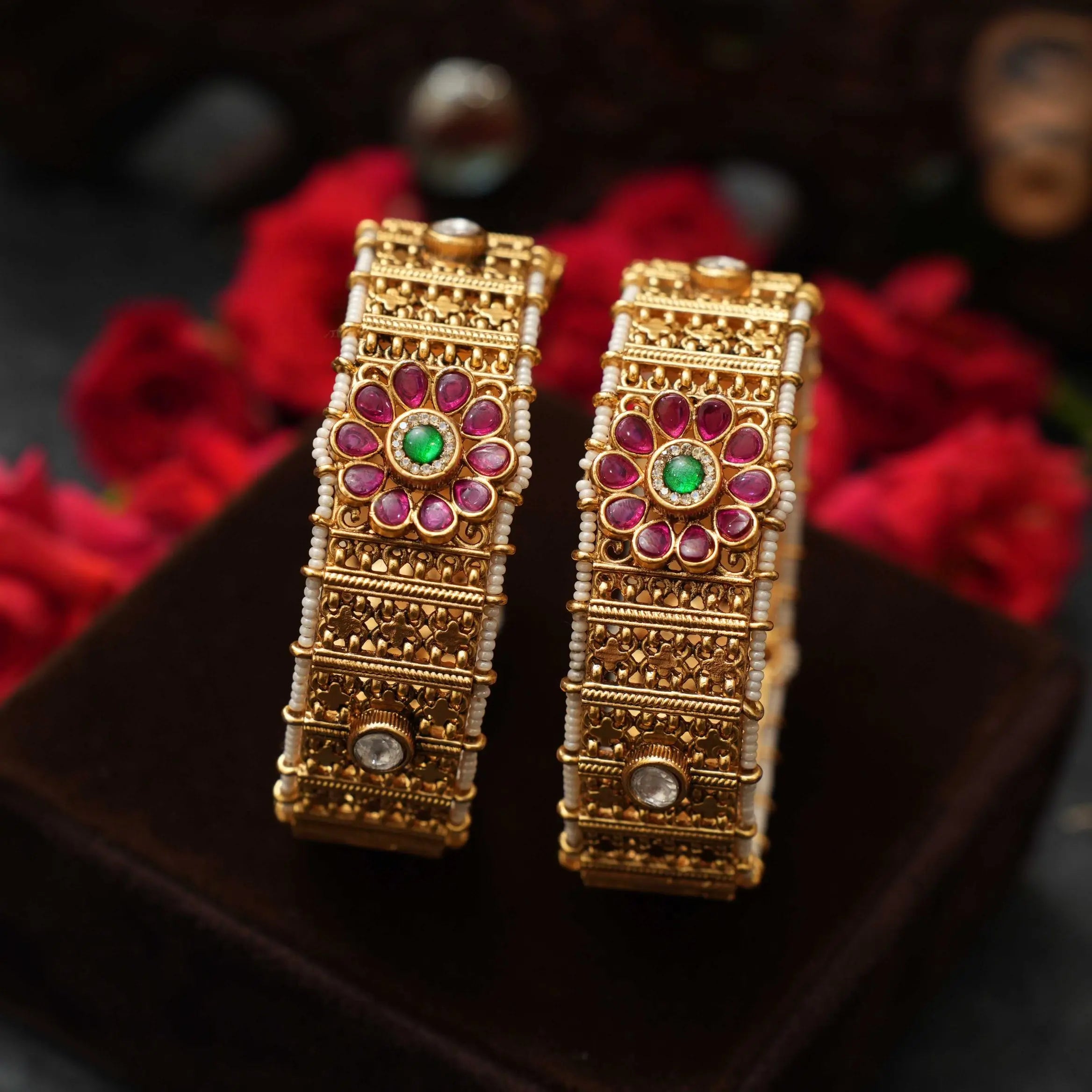A stunning statement pair of antique bangles, in floral motif intricately studded with vibrant Kemp stones, exuding timeless elegance and traditional charm.